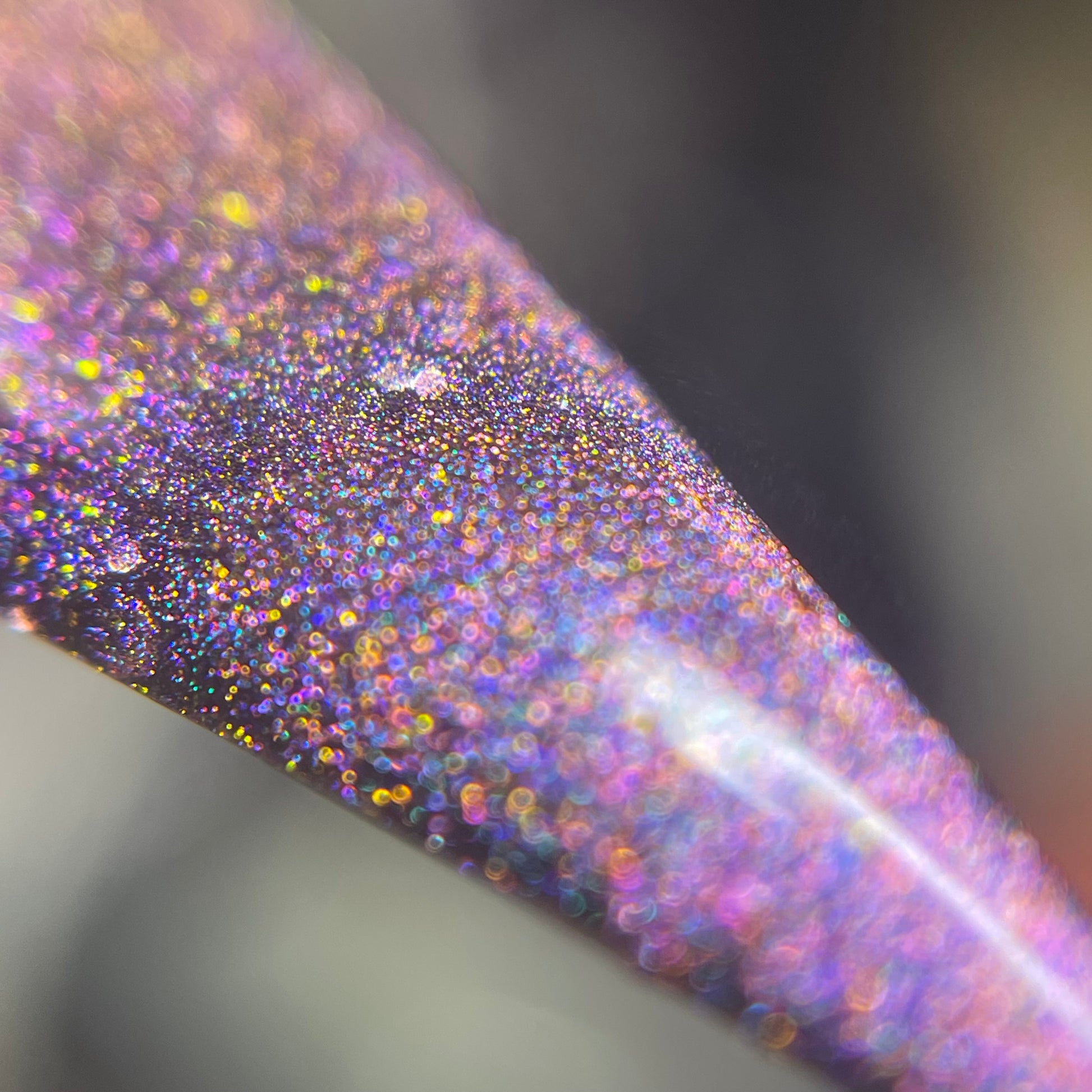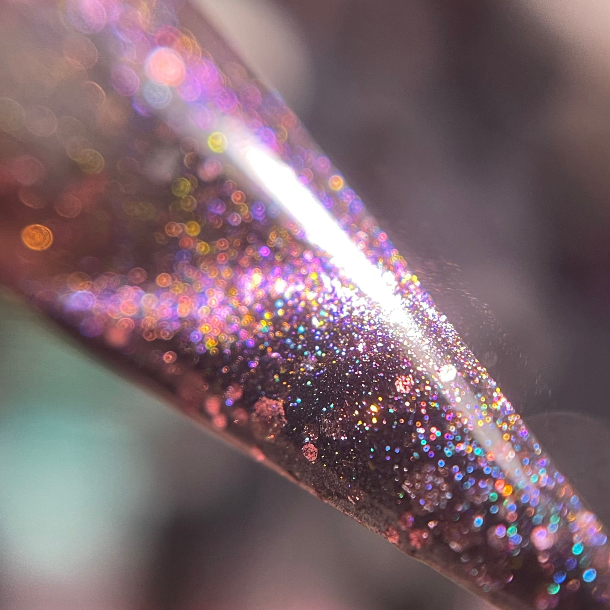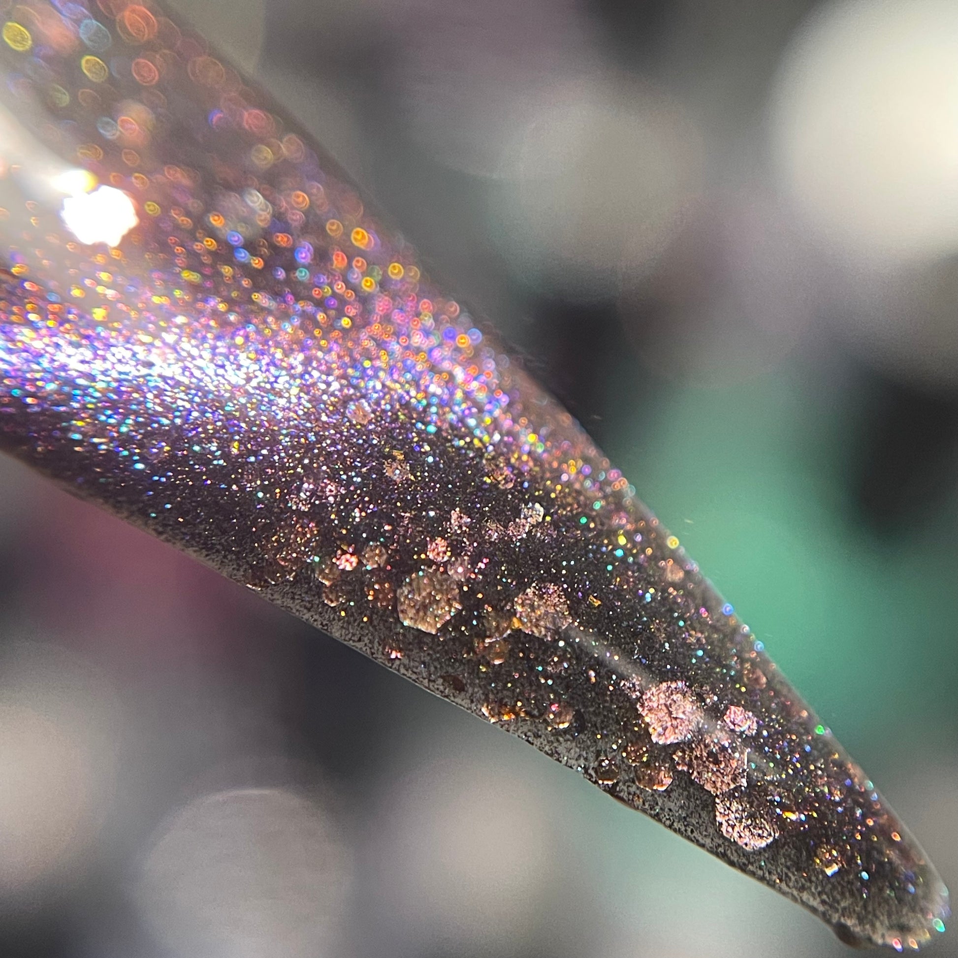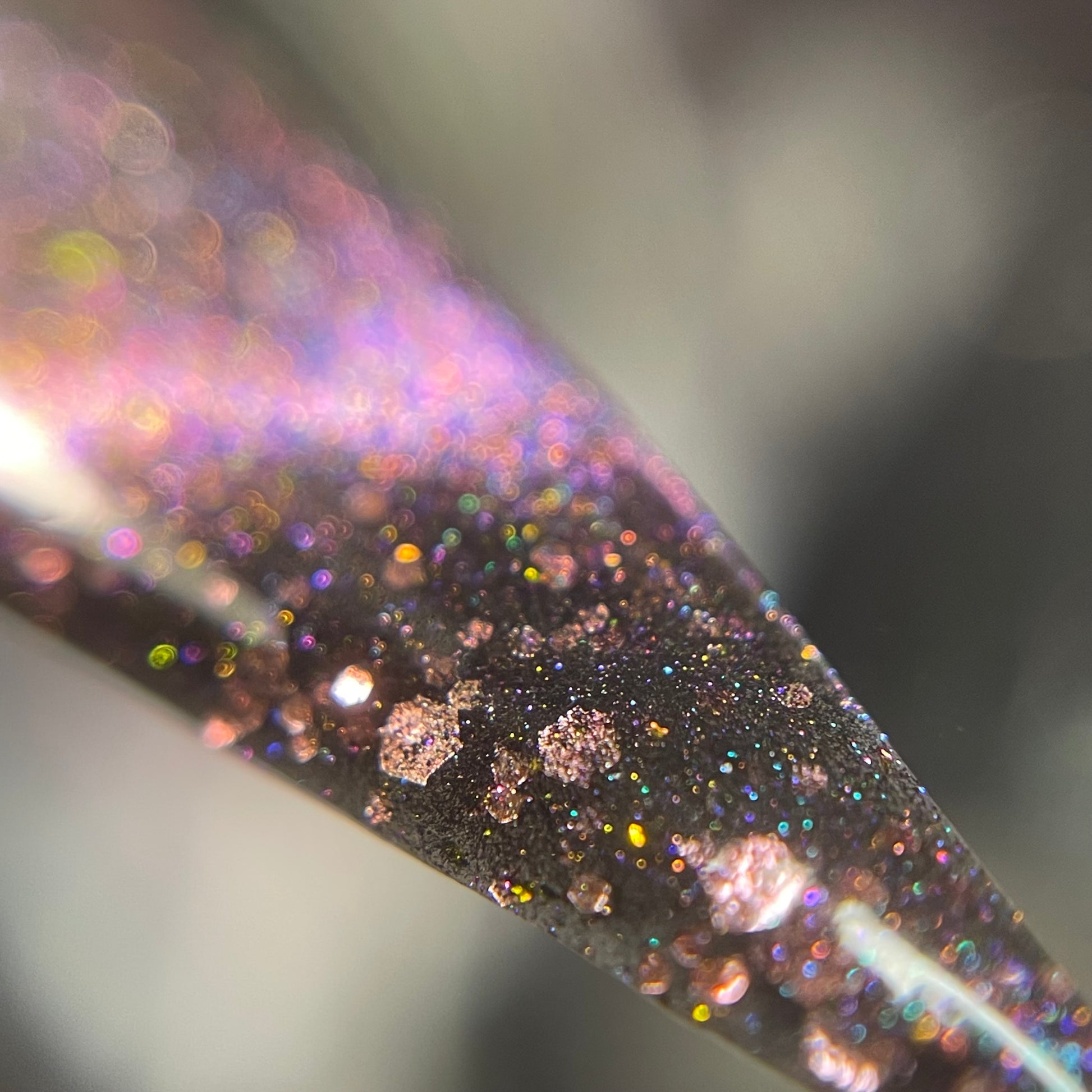 Cherry Coke-Magnetic bursts with a rich cherry cola base, intensified by striking blue and magenta magnetic tones. Glitter and loaded shimmer create a dazzling effect, while rose gold hexes add a fiery sparkle. This shade commands attention and is the ultimate summer must-have for those ready to stand out and be lovestruck.