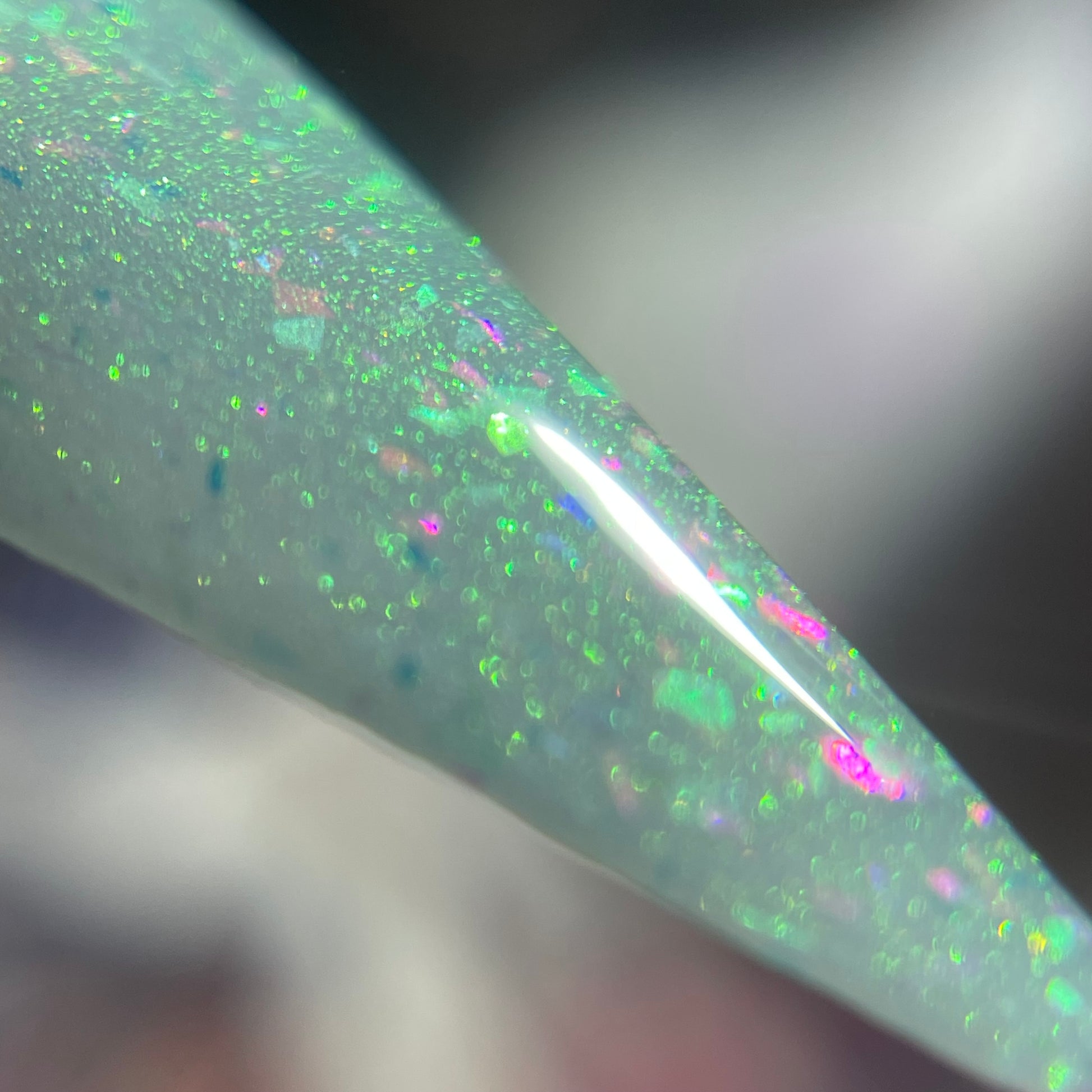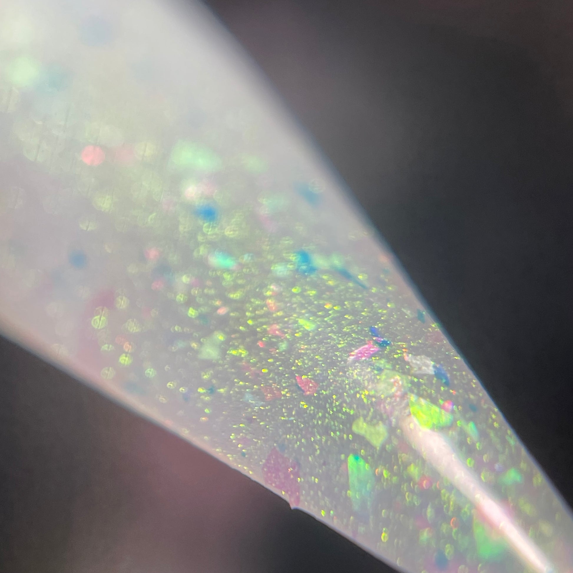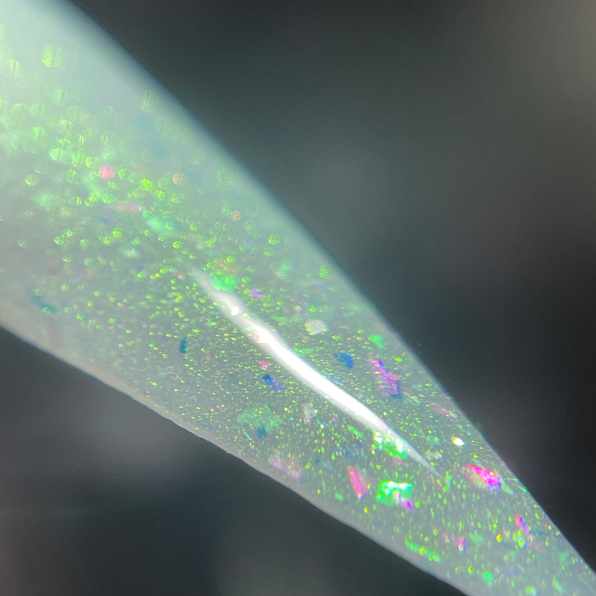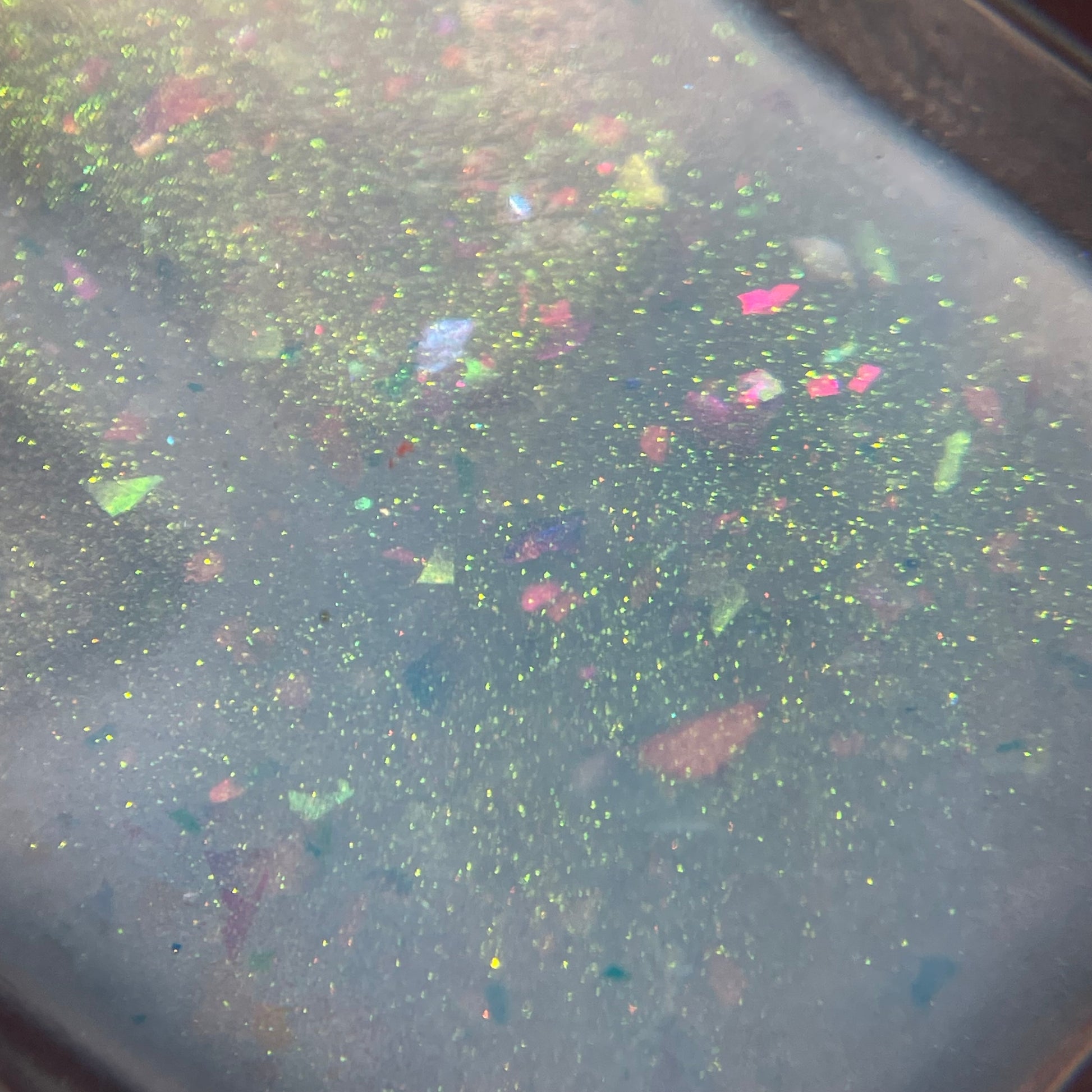 A delicate blue glow in the dark with flakies of iridescent colors and OGUP in green/gold and fun mix of elements