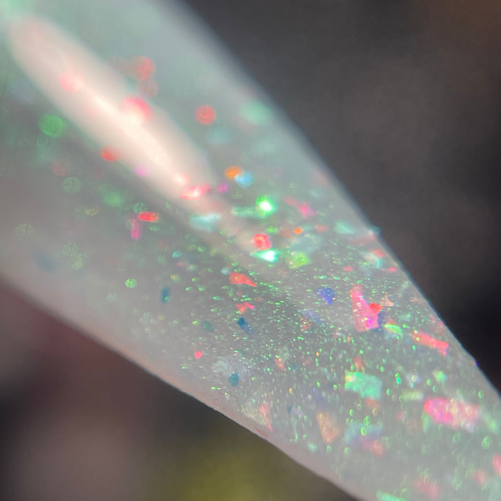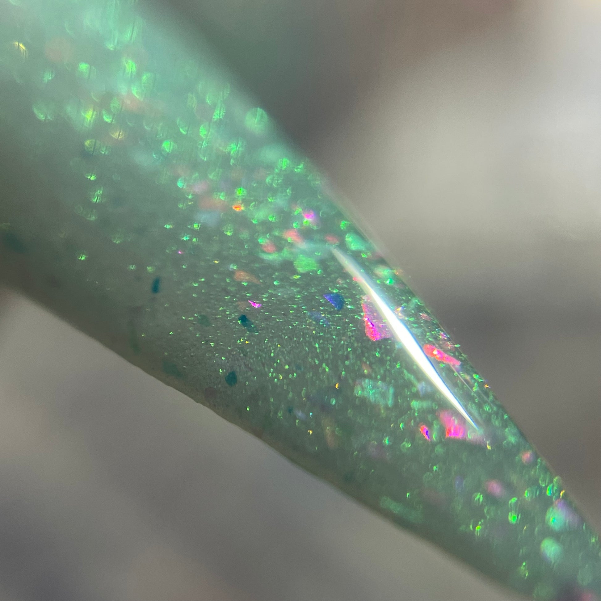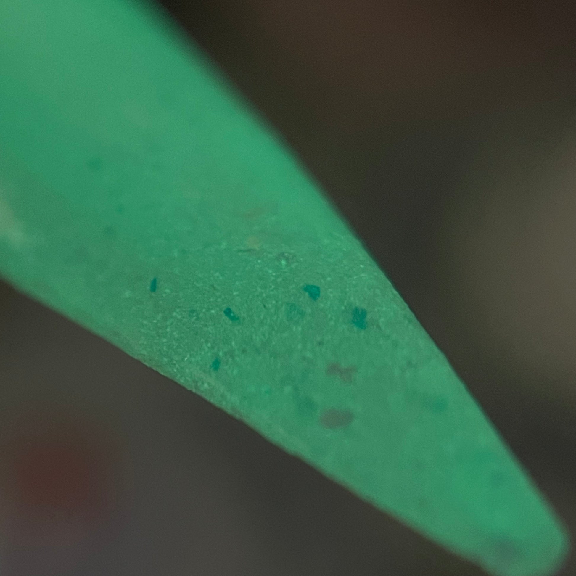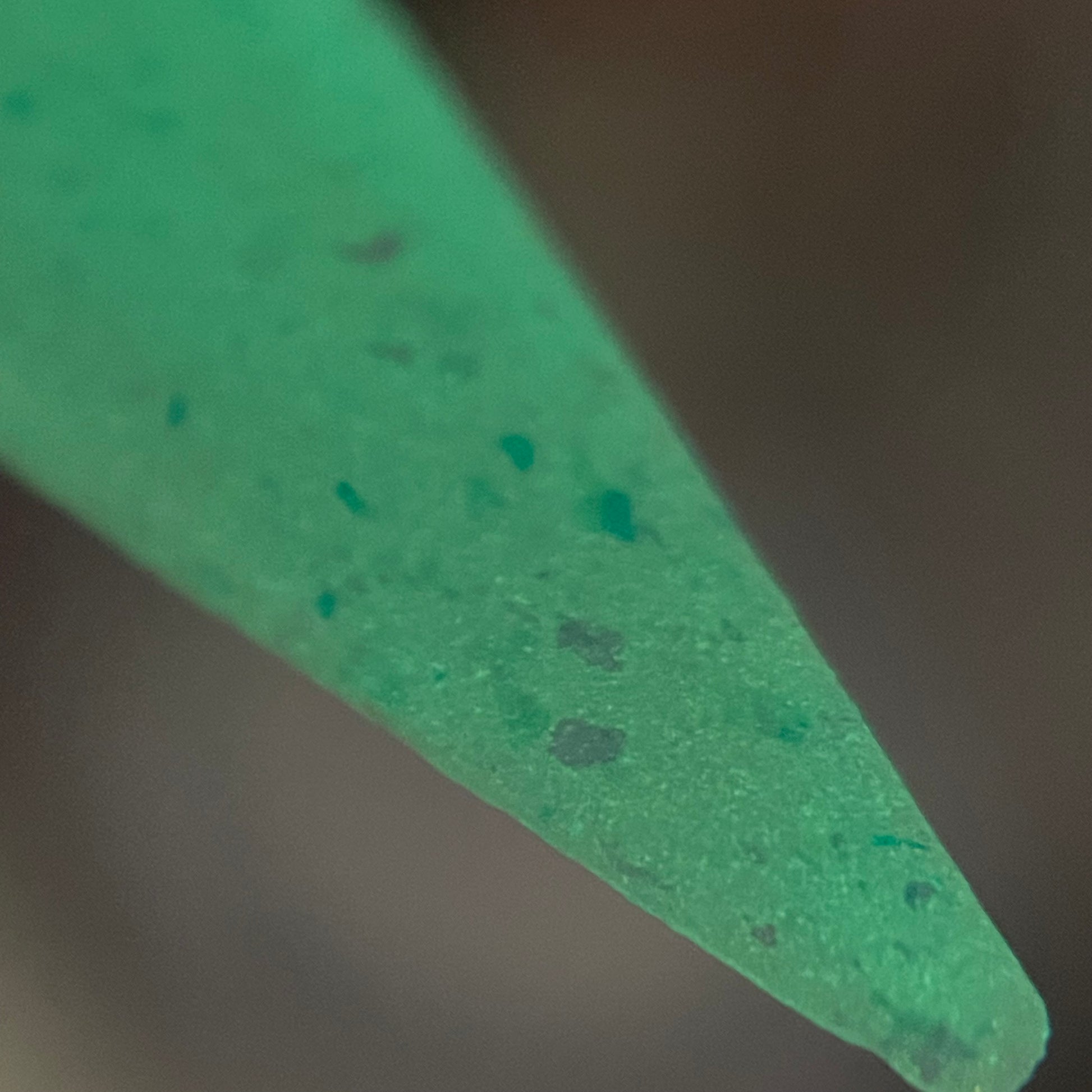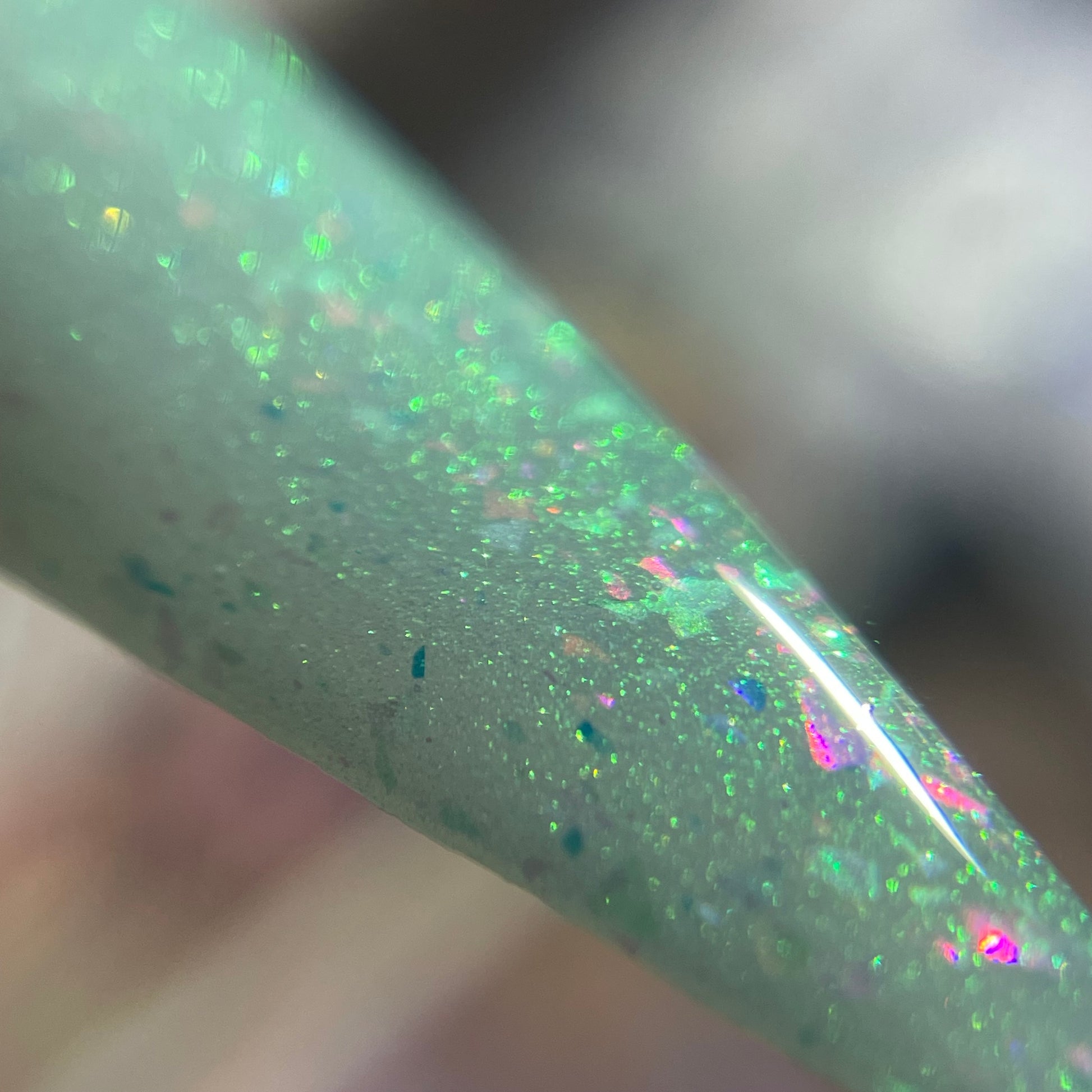 A delicate blue glow in the dark with flakies of iridescent colors and OGUP in green/gold and fun mix of elements