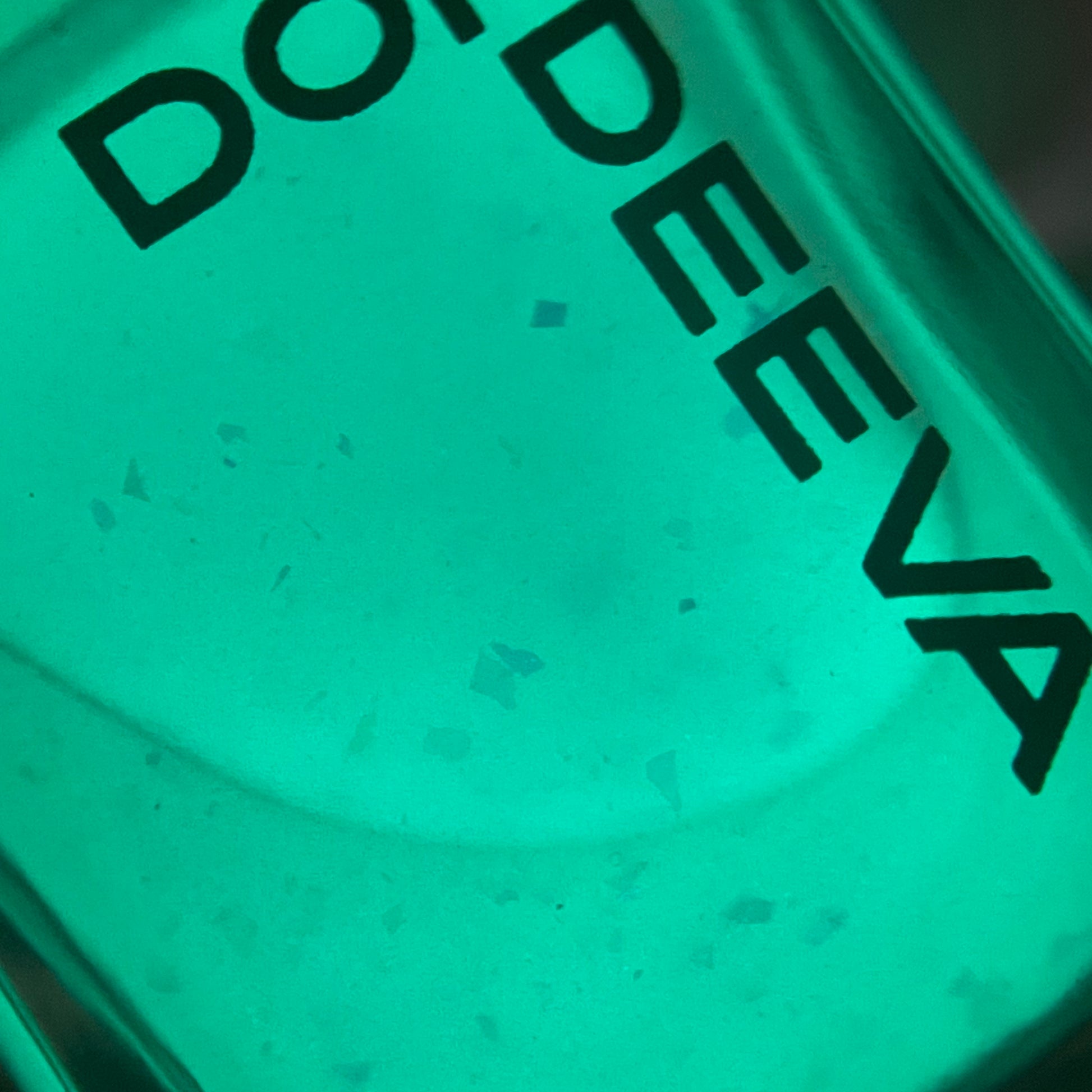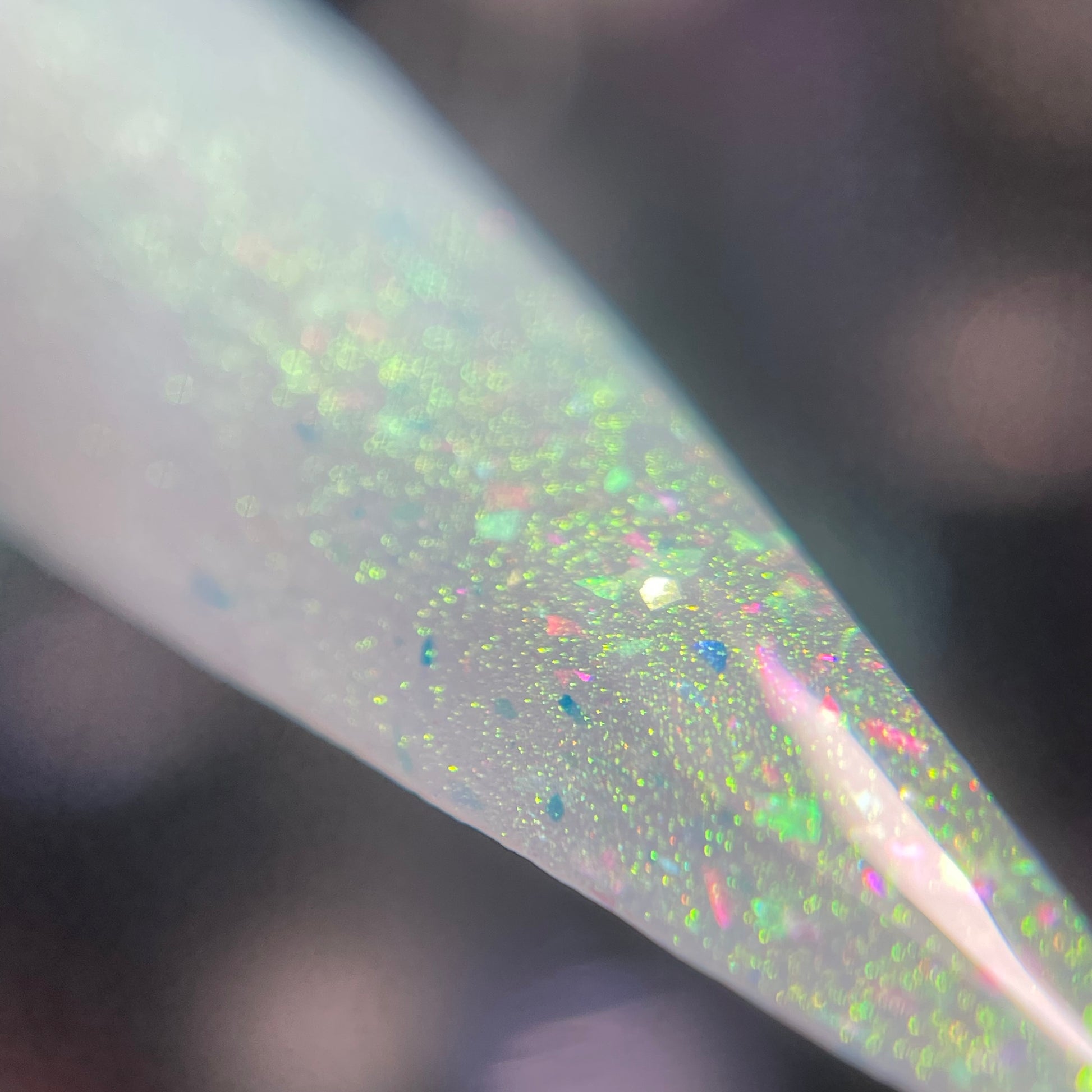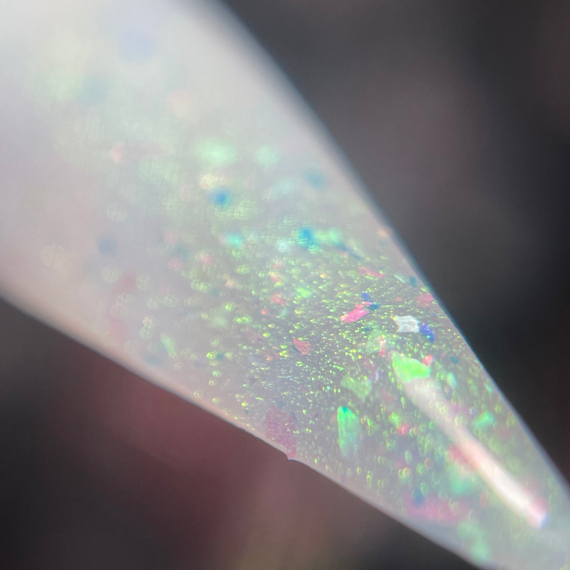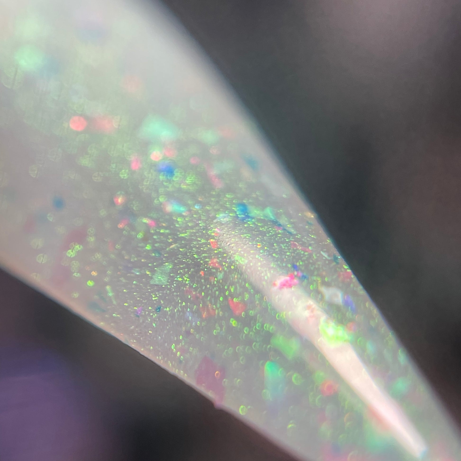 A delicate blue glow in the dark with flakies of iridescent colors and OGUP in green/gold and fun mix of elements
