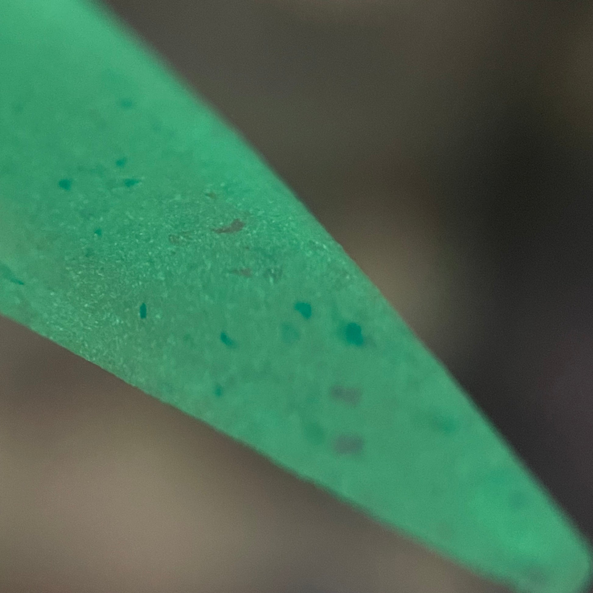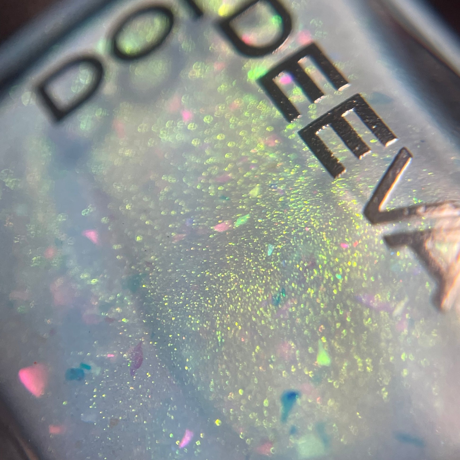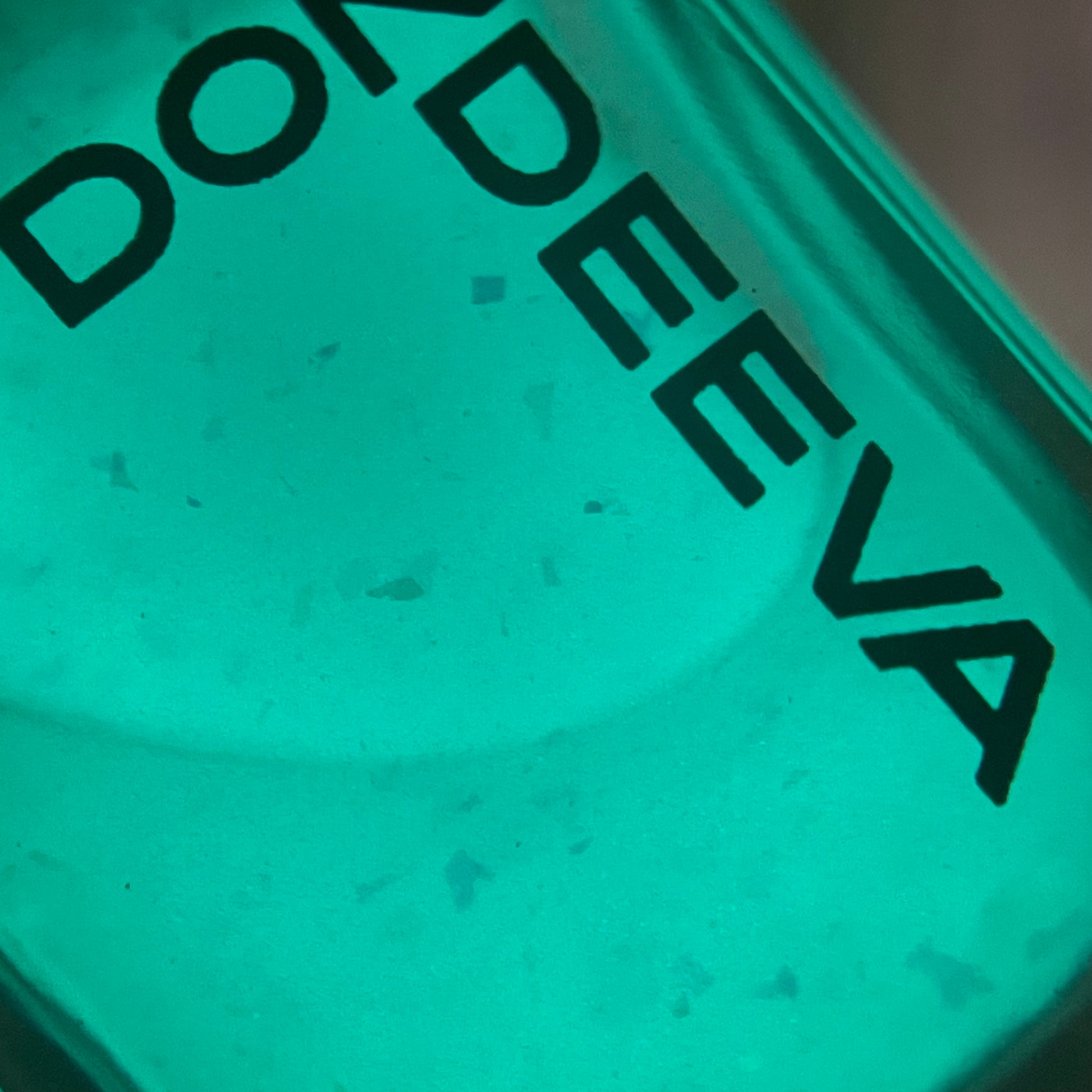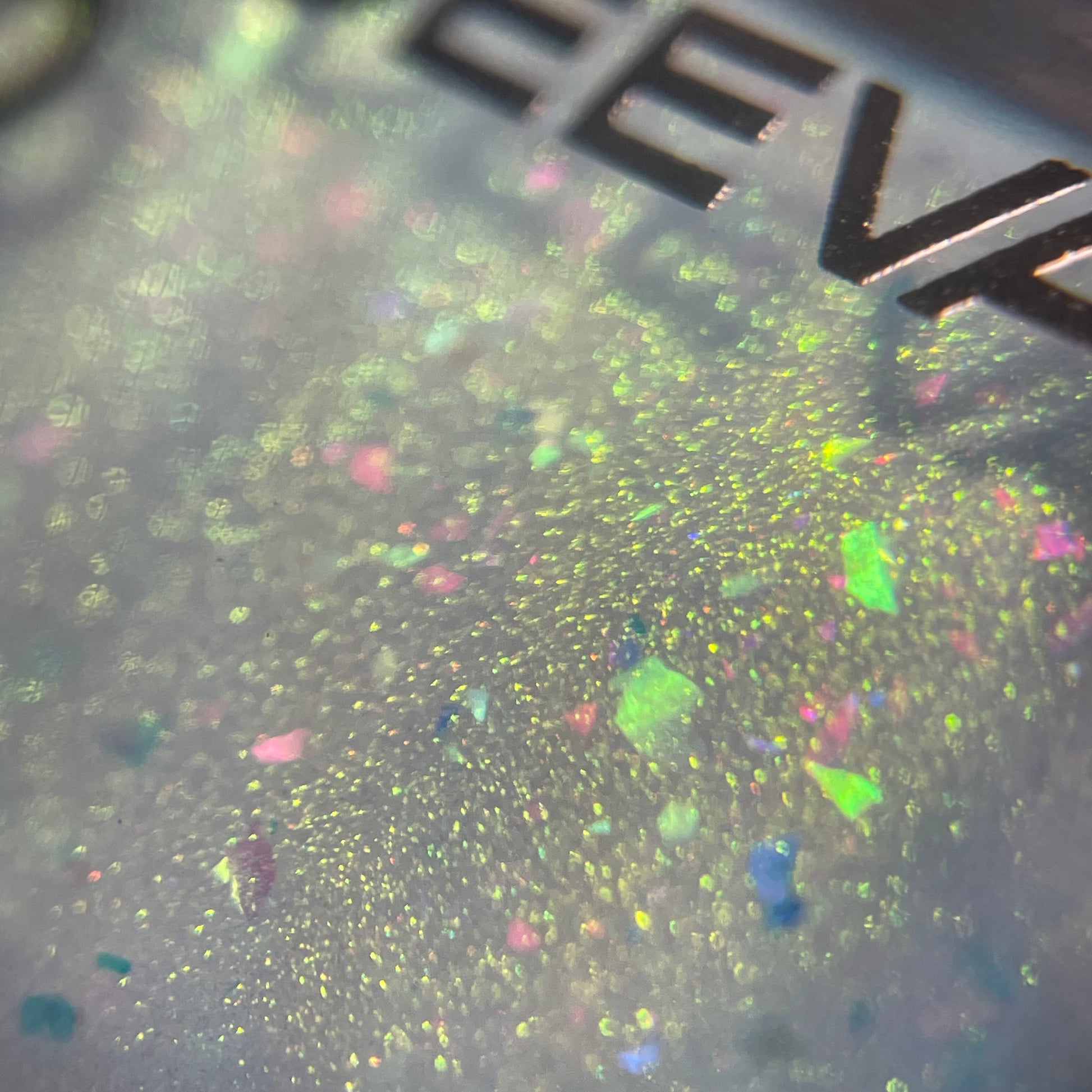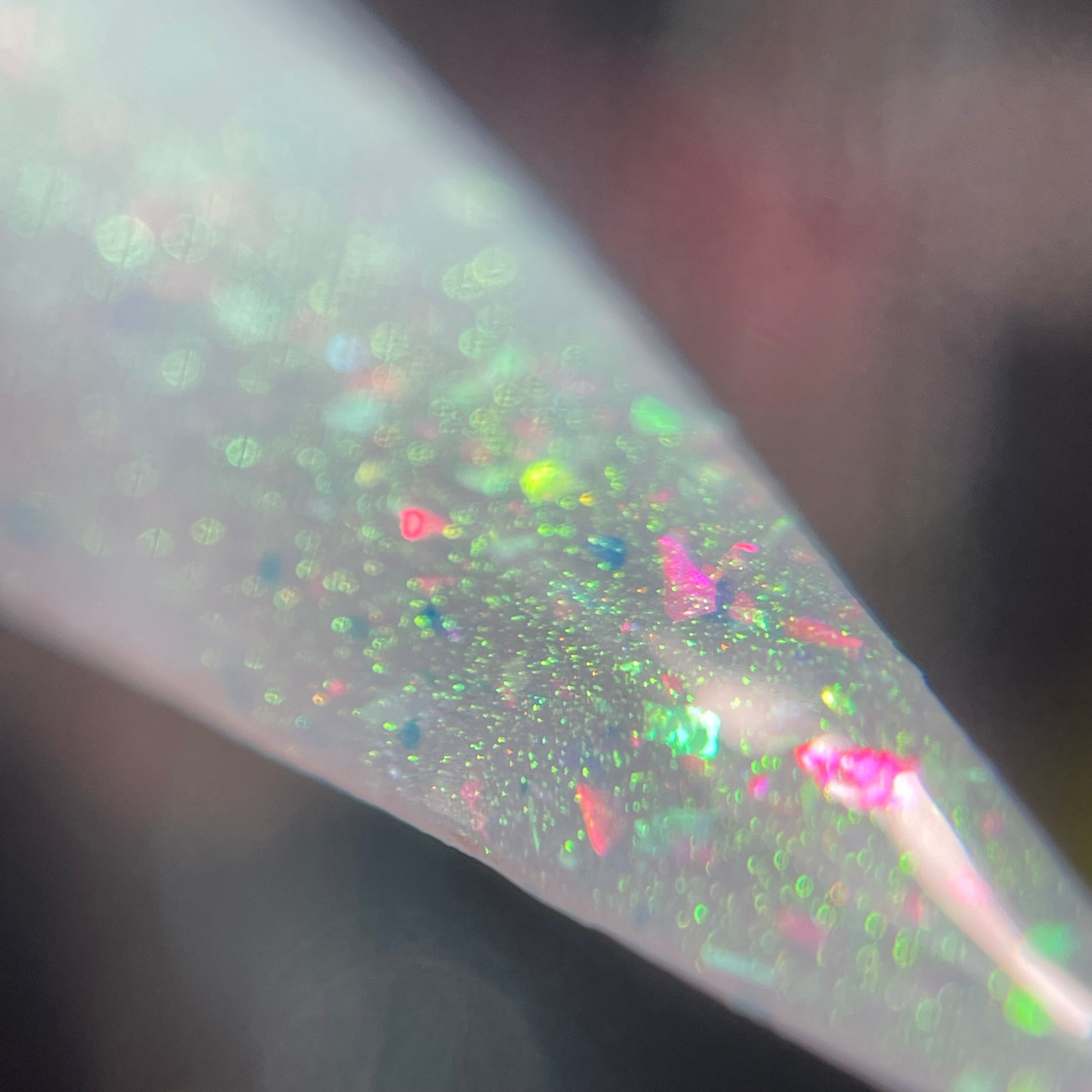 A delicate blue glow in the dark with flakies of iridescent colors and OGUP in green/gold and fun mix of elements
