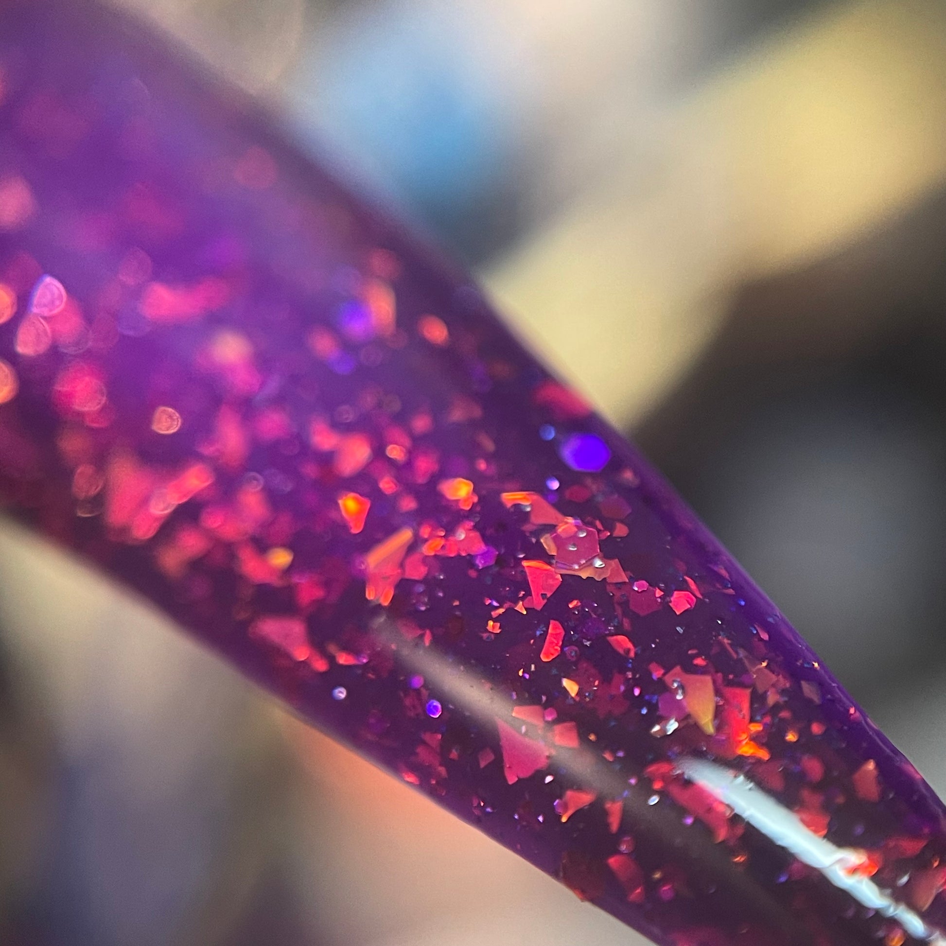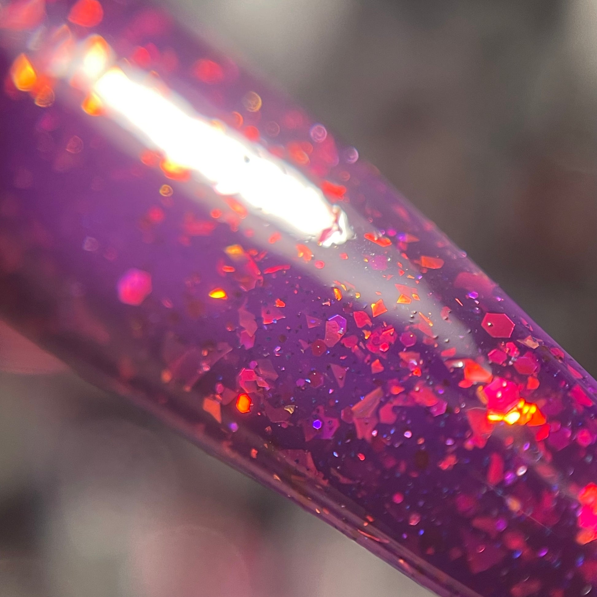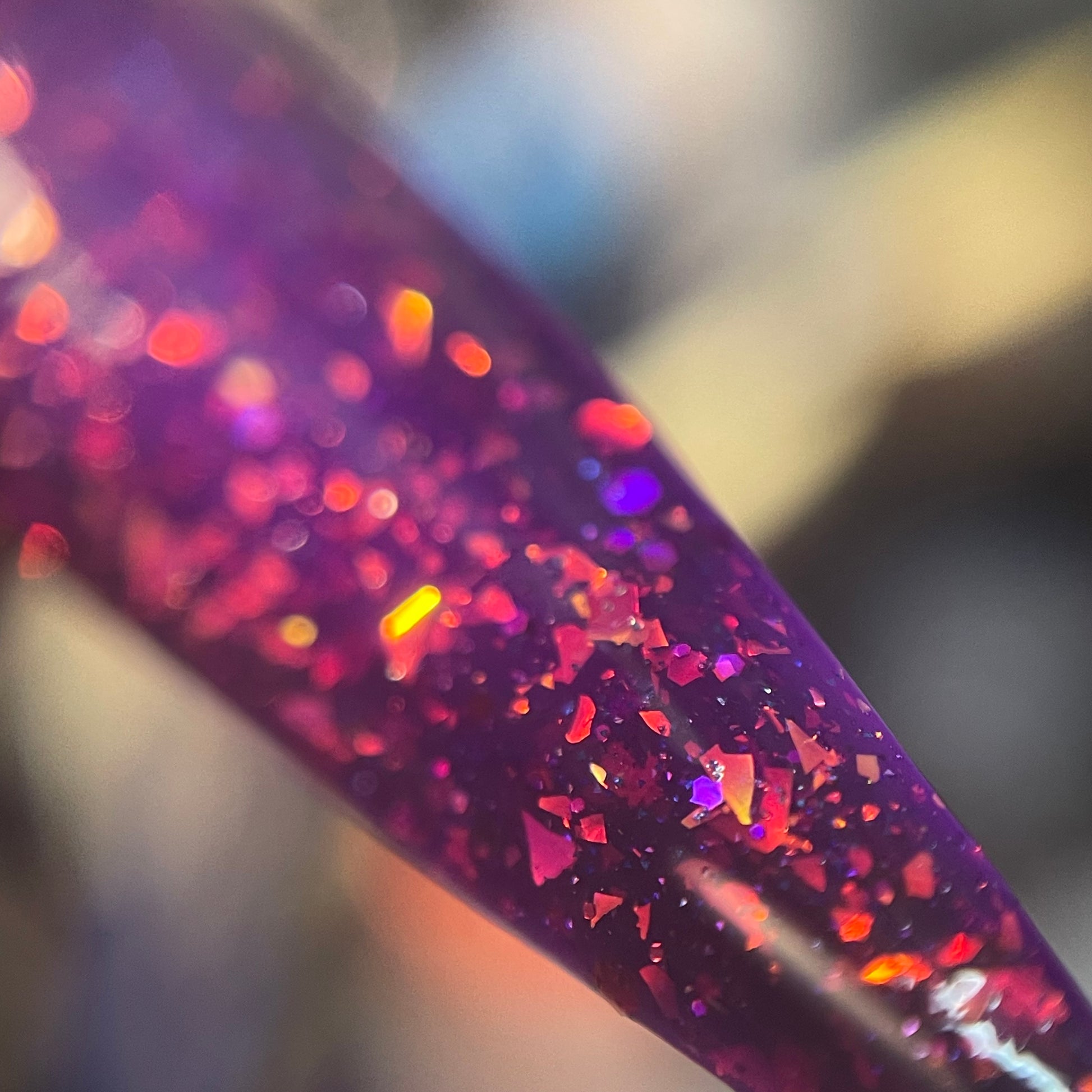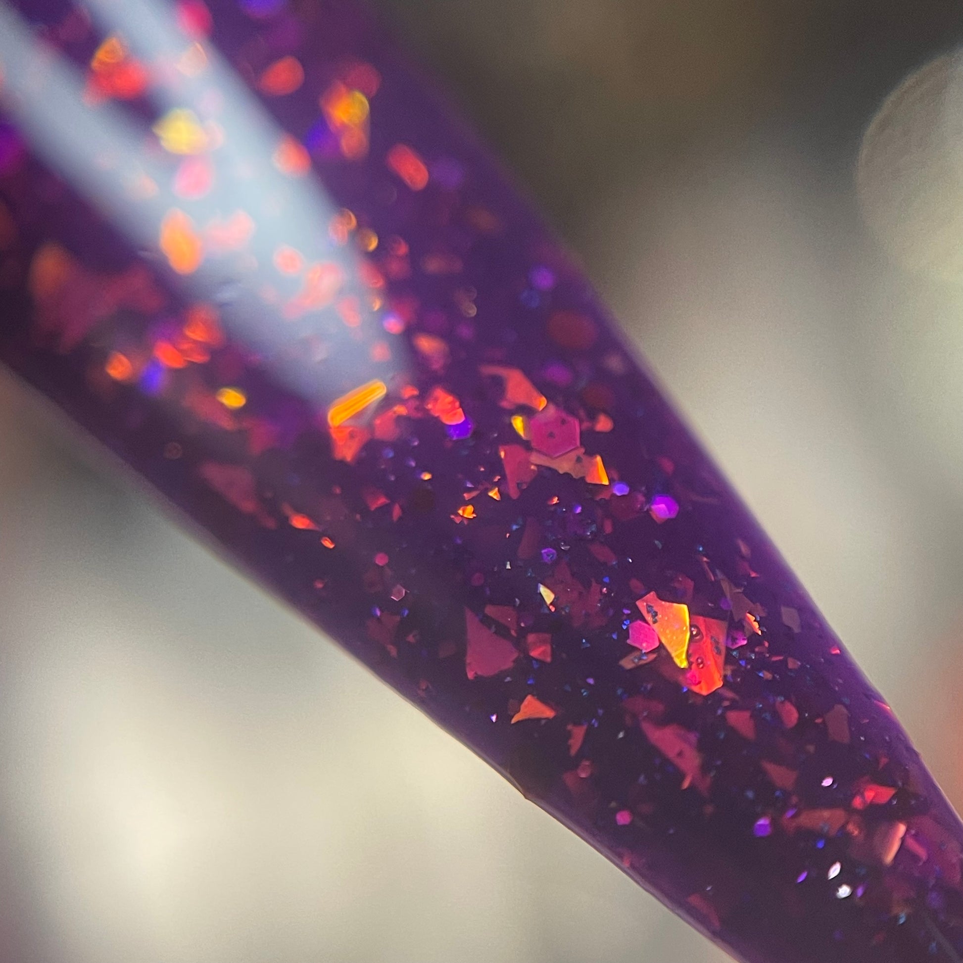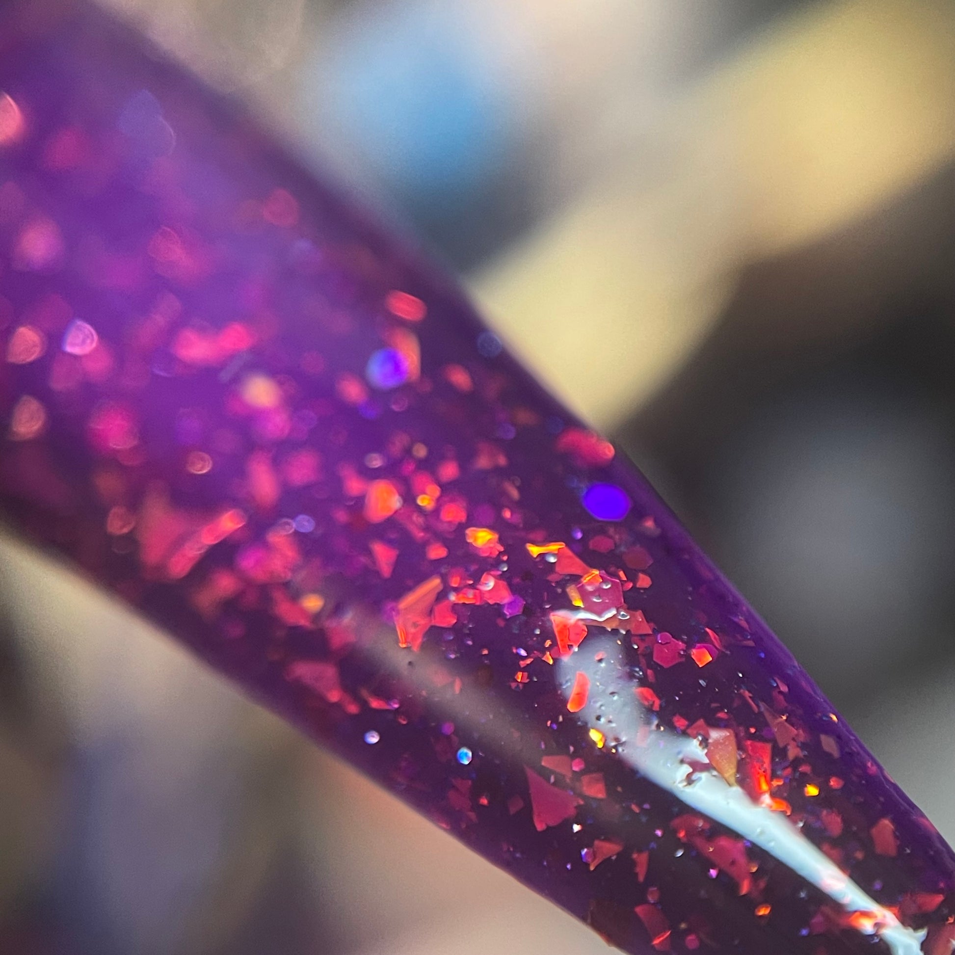 A deep grape jelly with copper/gold flakes with hexes and sparse reflective glitter.