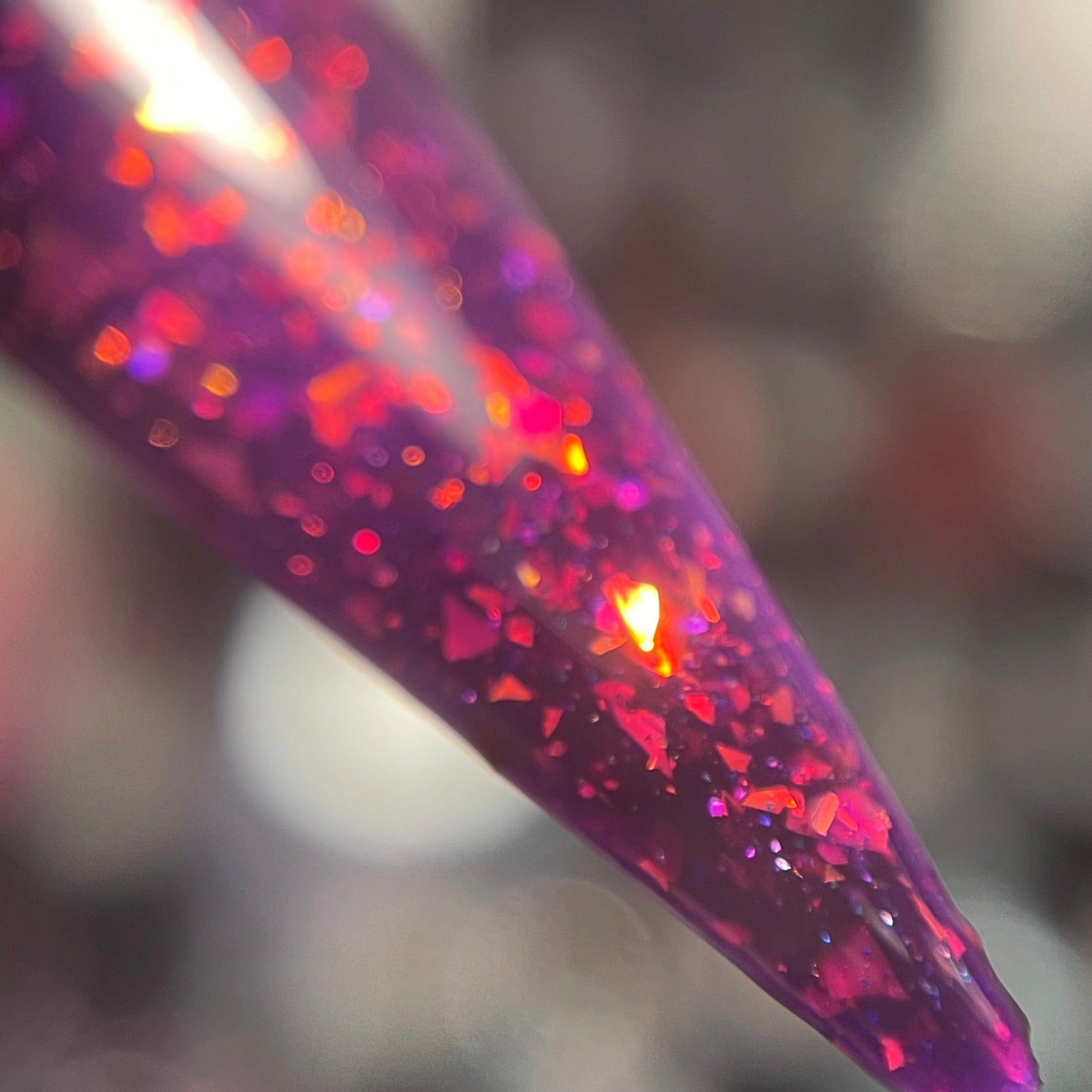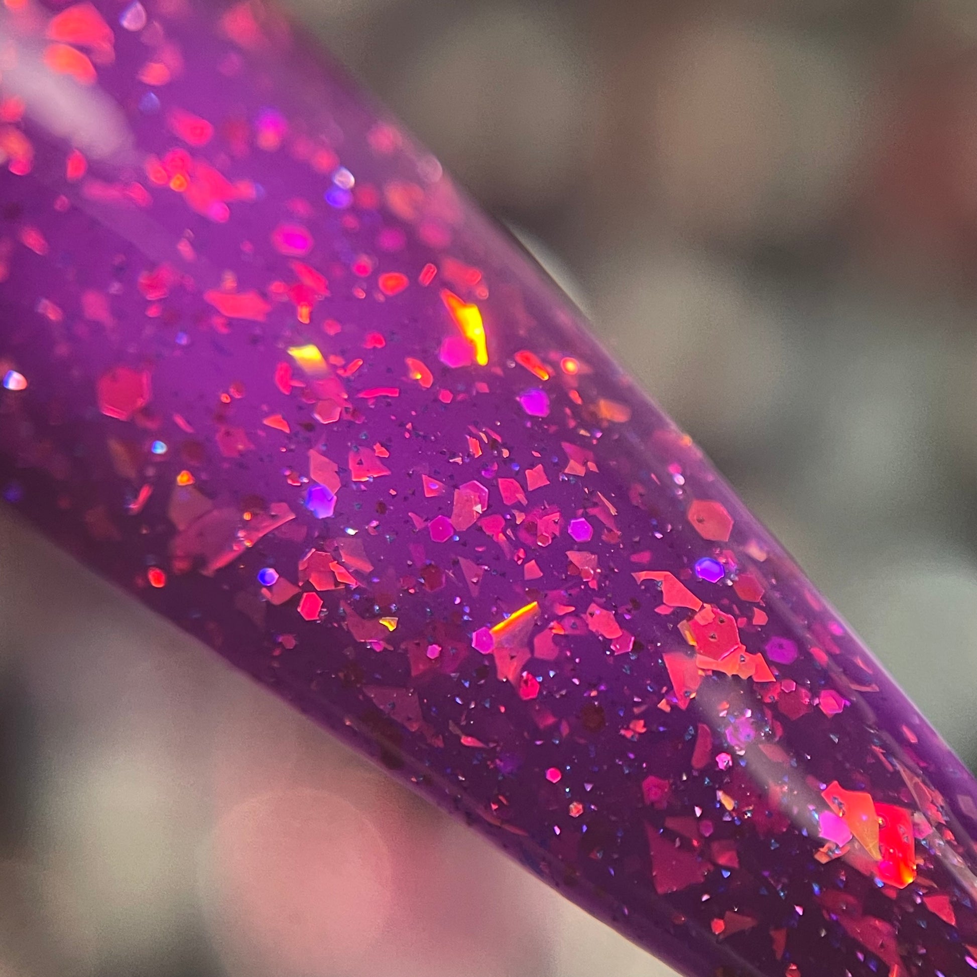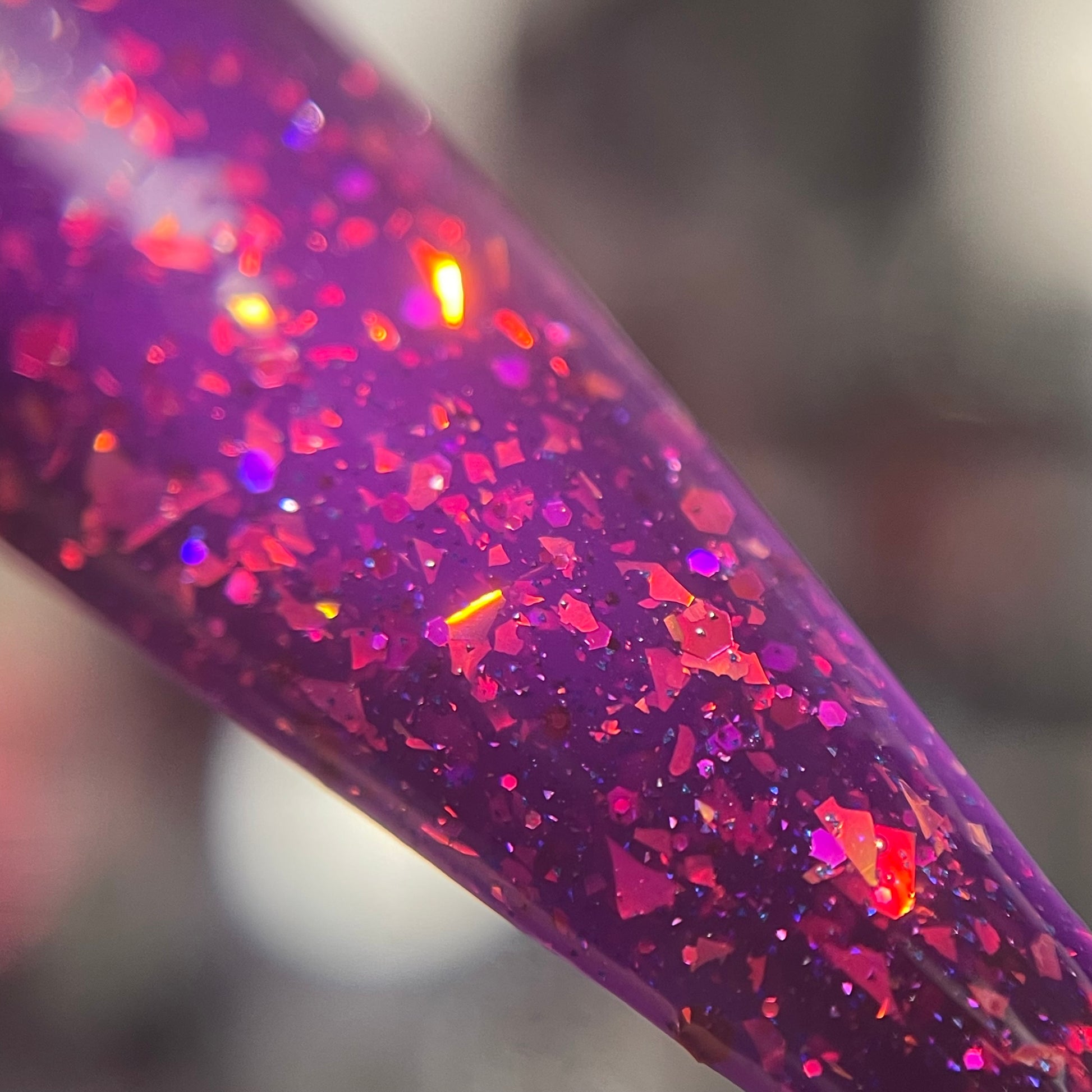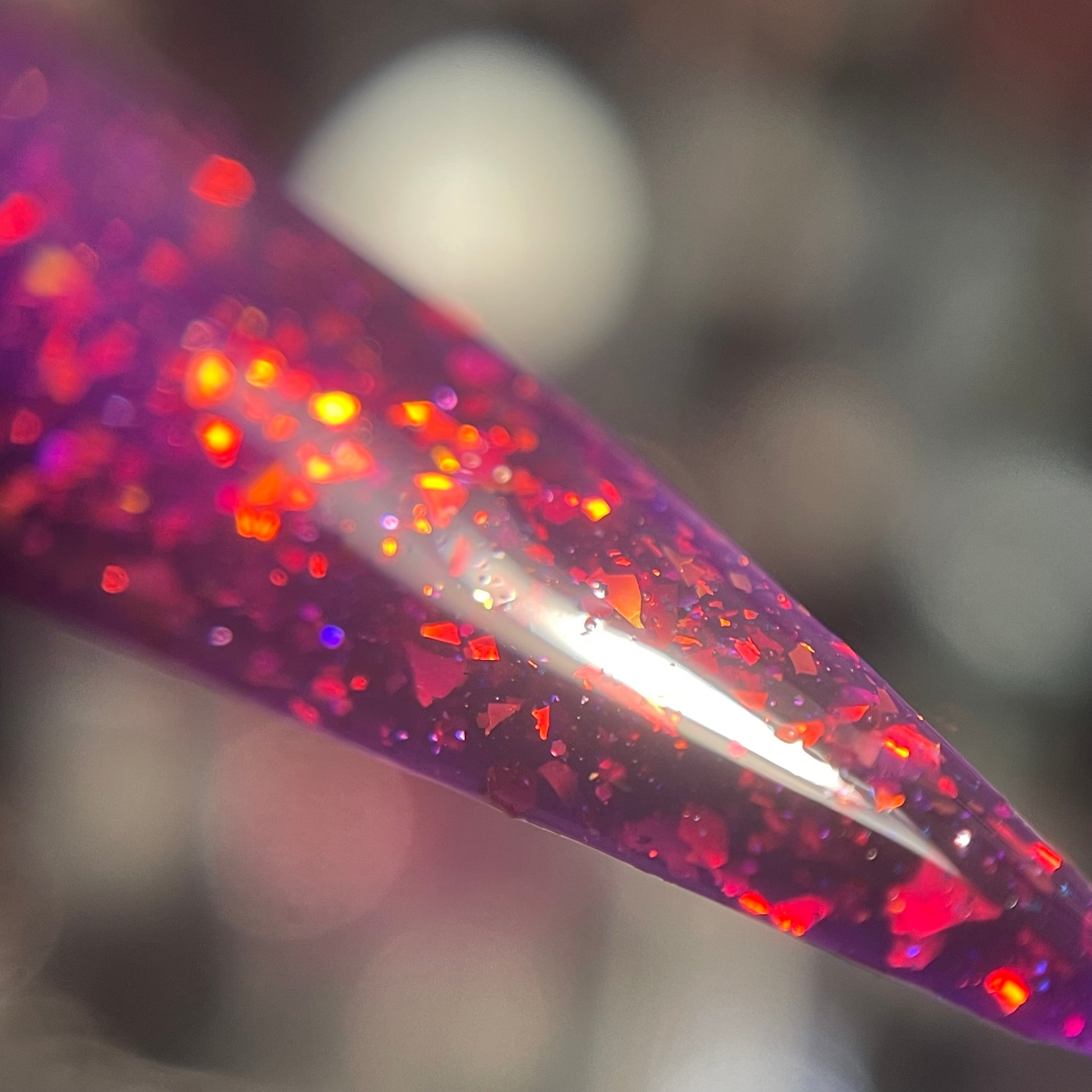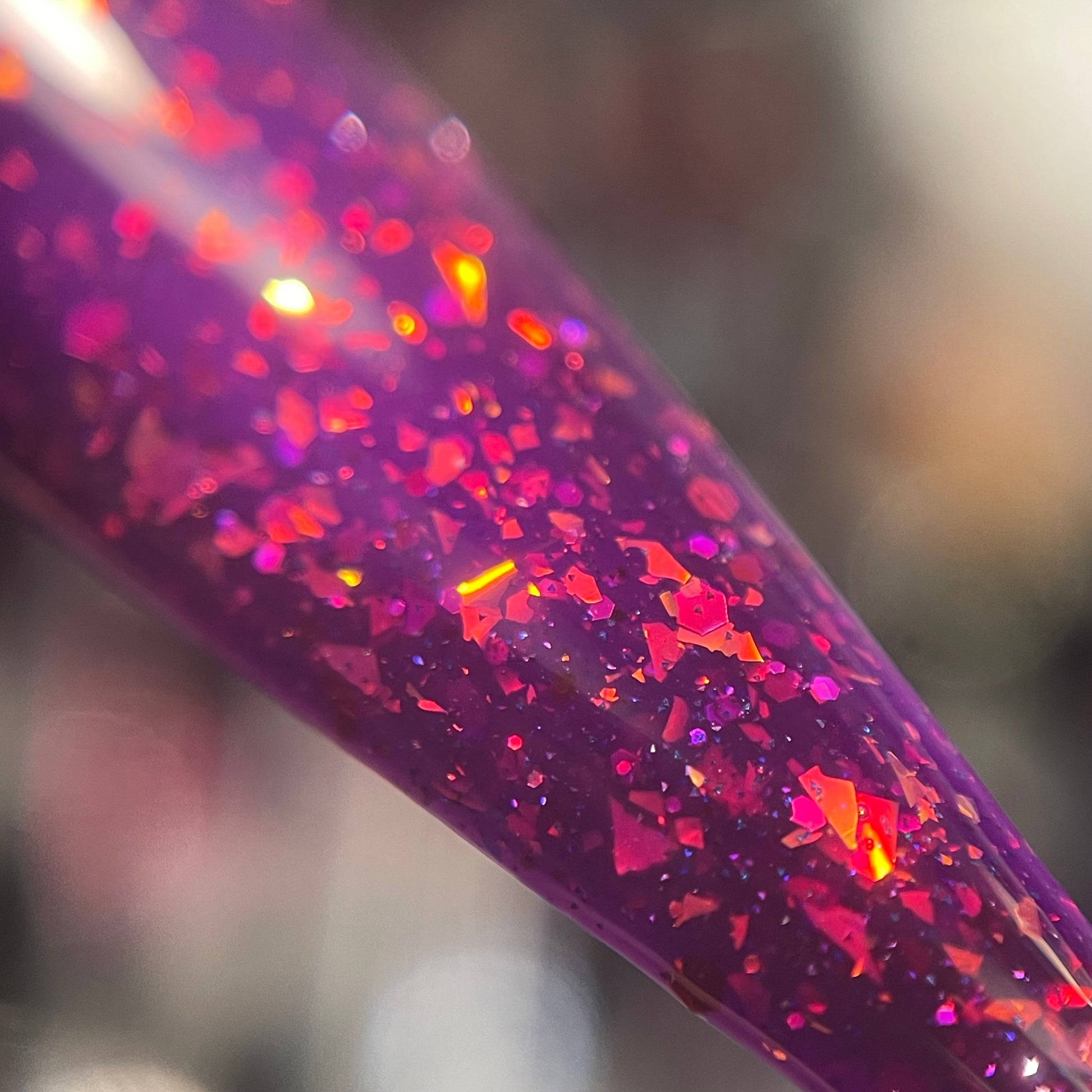 A deep grape jelly with copper/gold flakes with hexes and sparse reflective glitter.