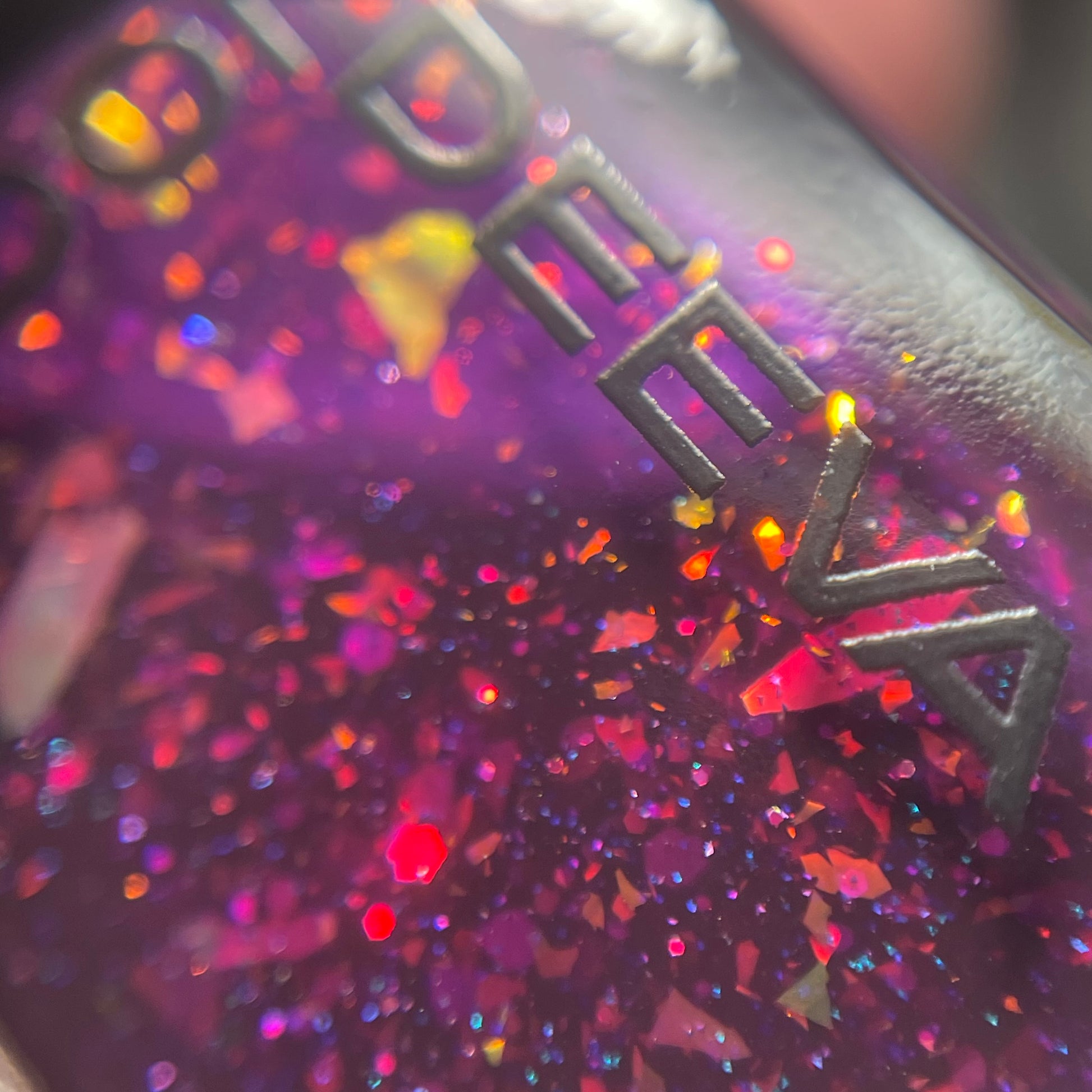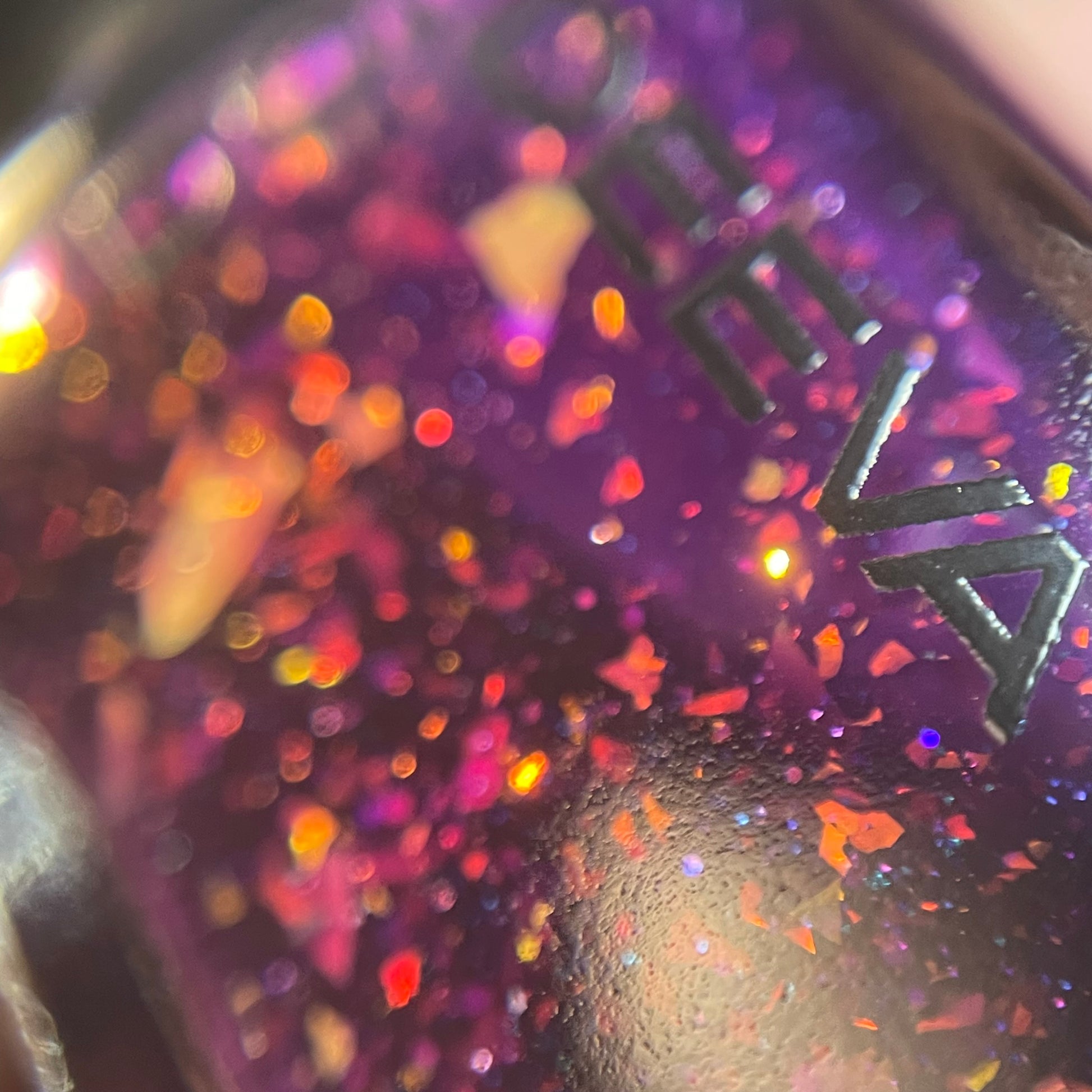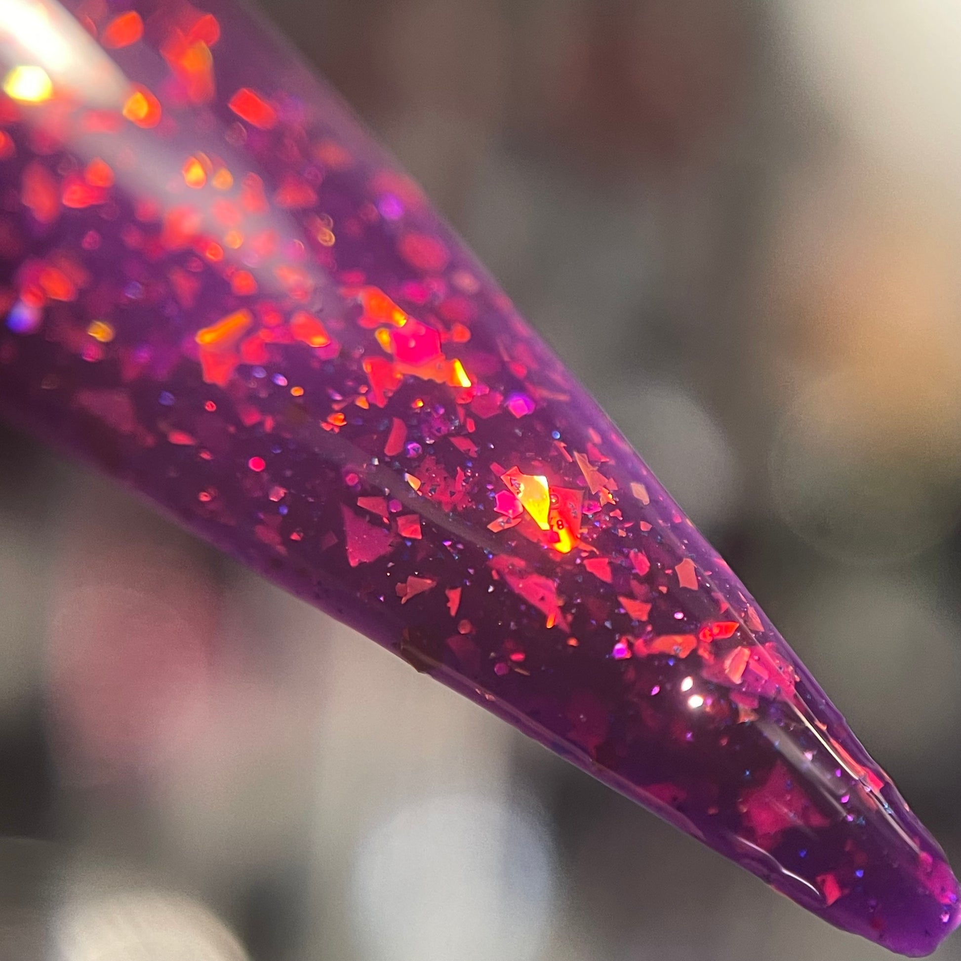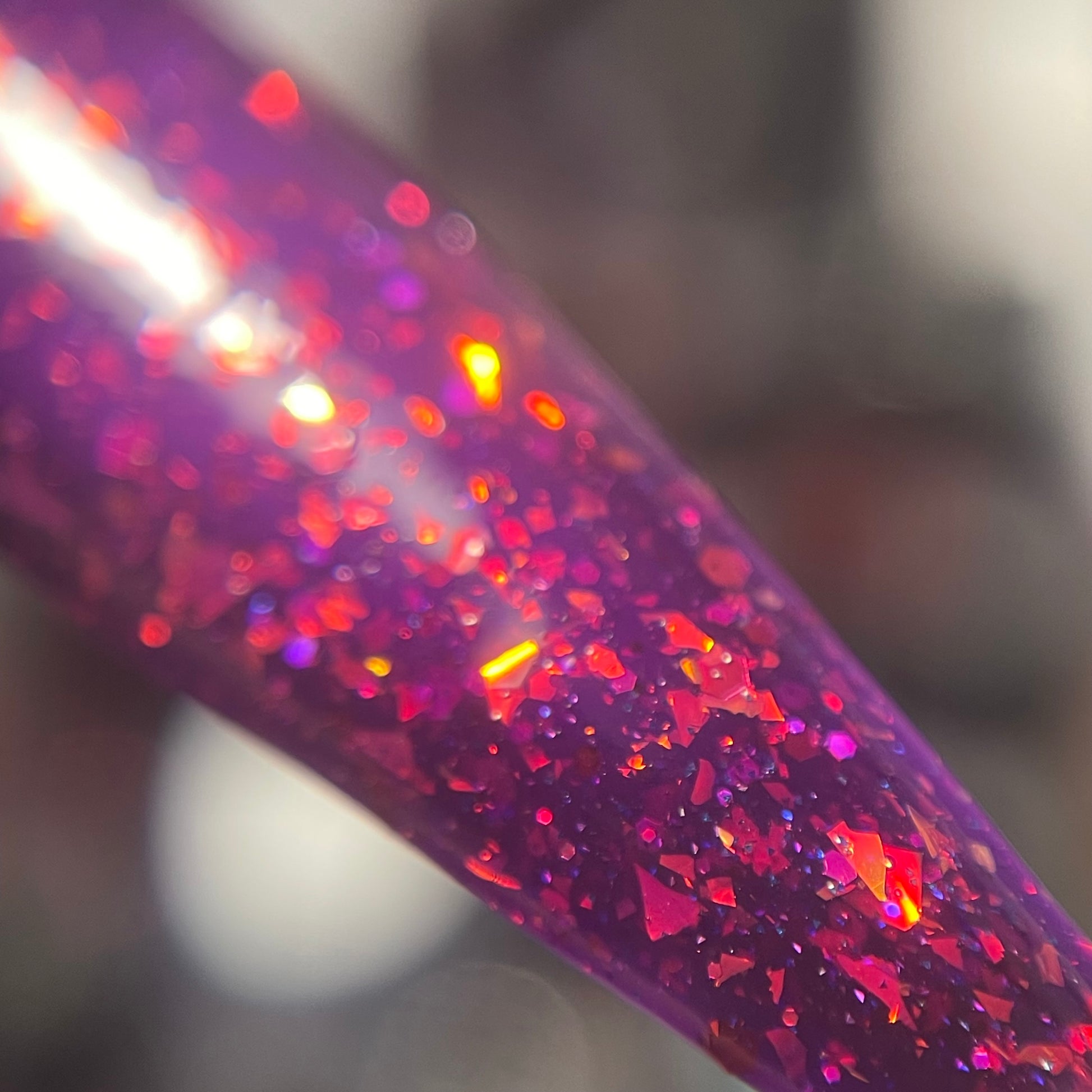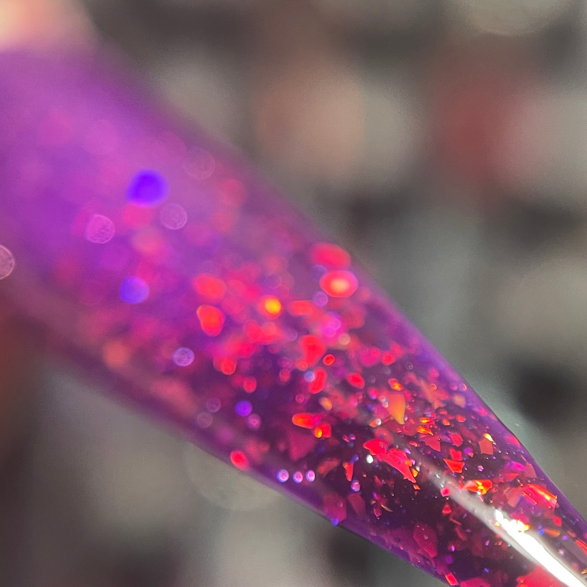 A deep grape jelly with copper/gold flakes with hexes and sparse reflective glitter.