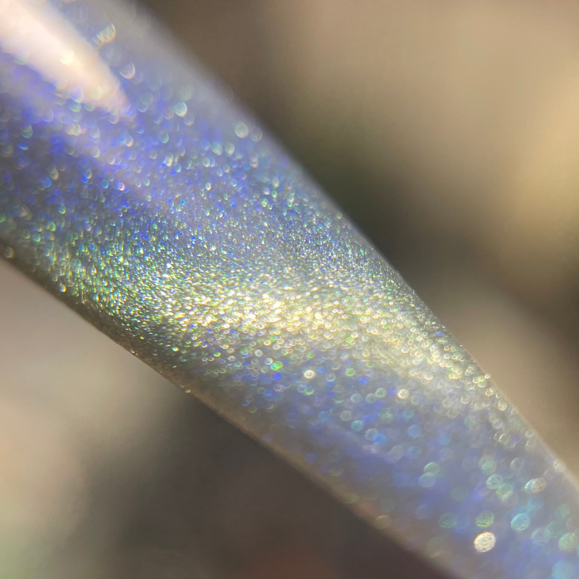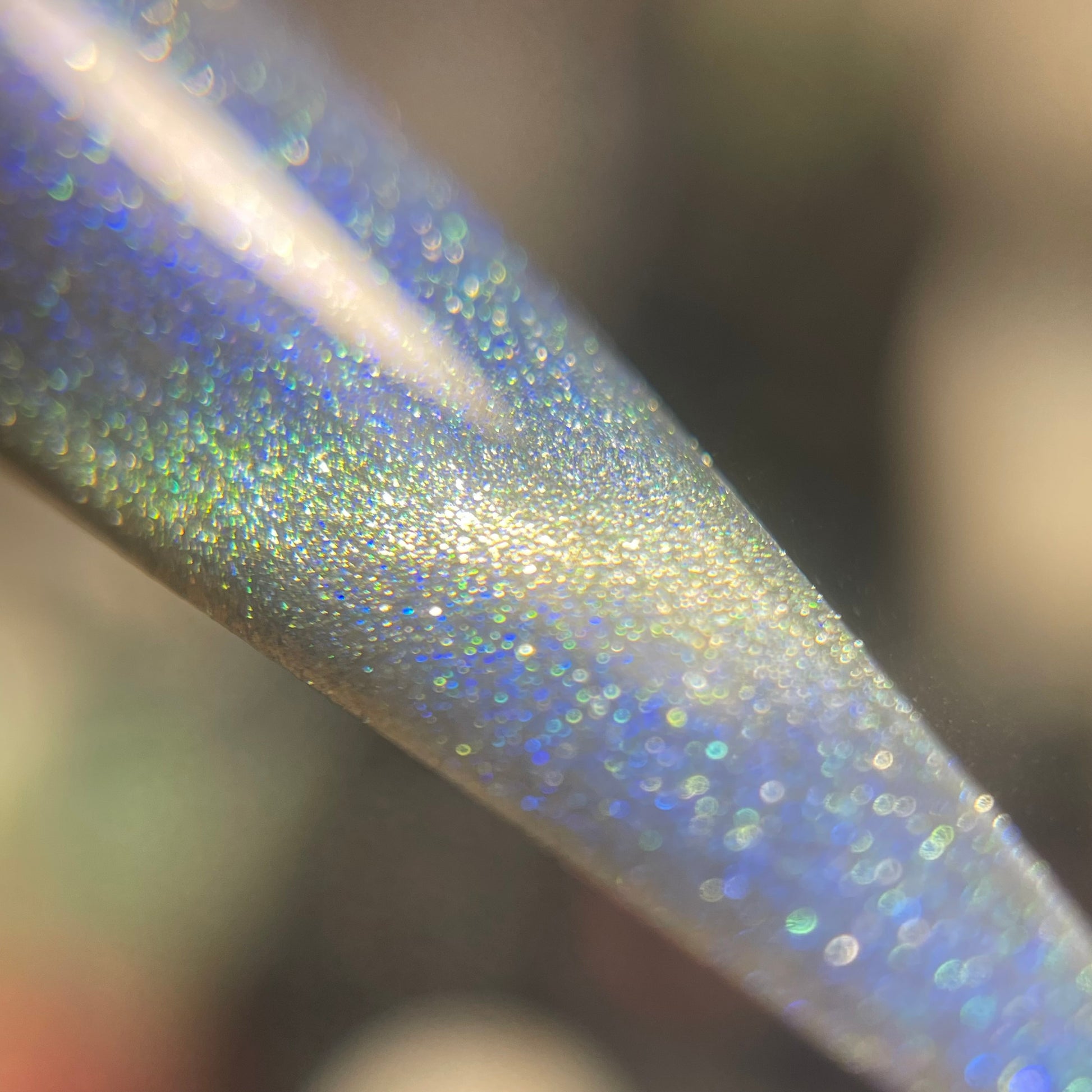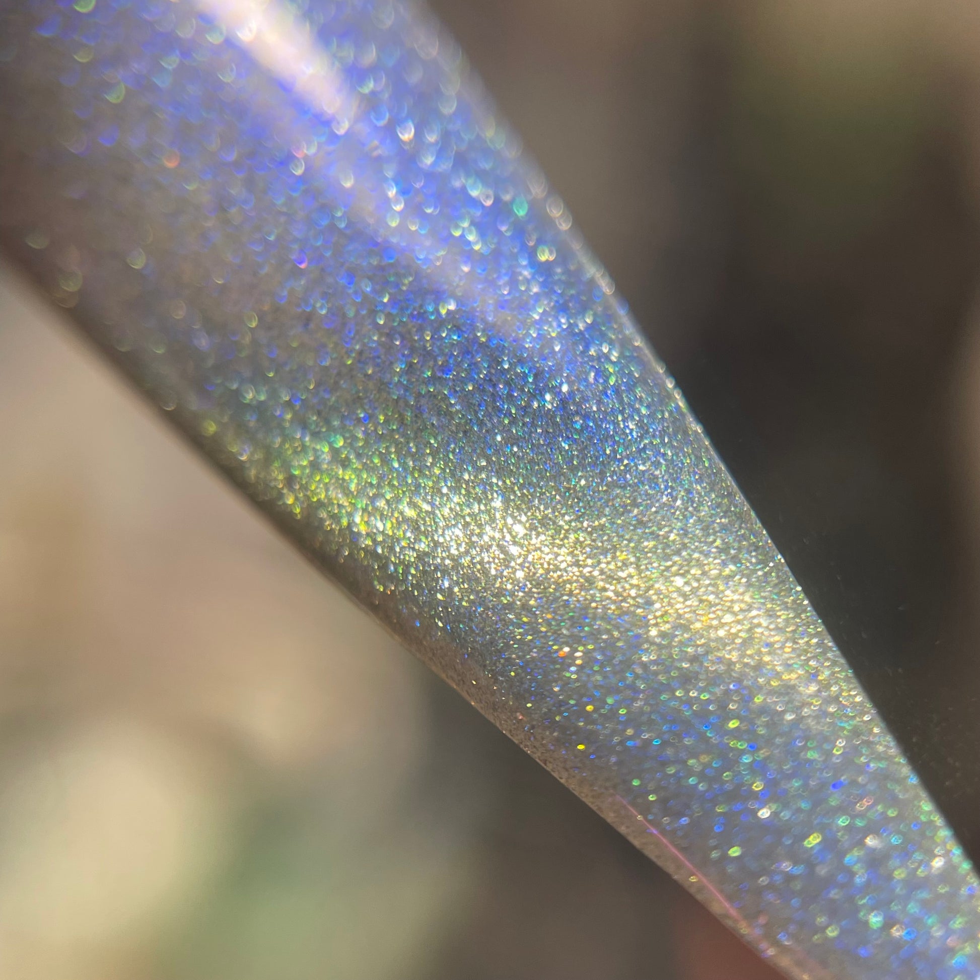 a silvery sapphire blue and holo green elements inside of a silvery magnetic.