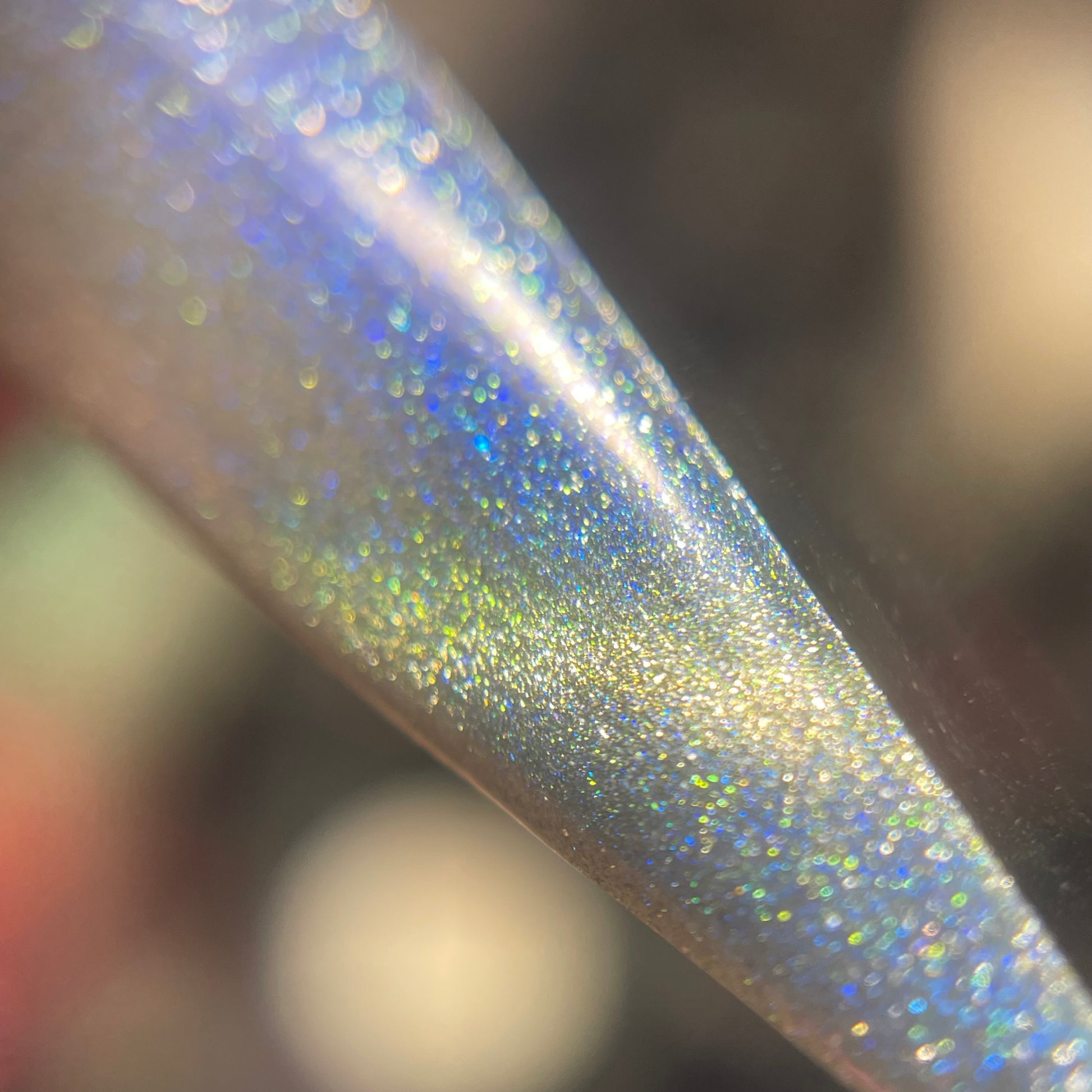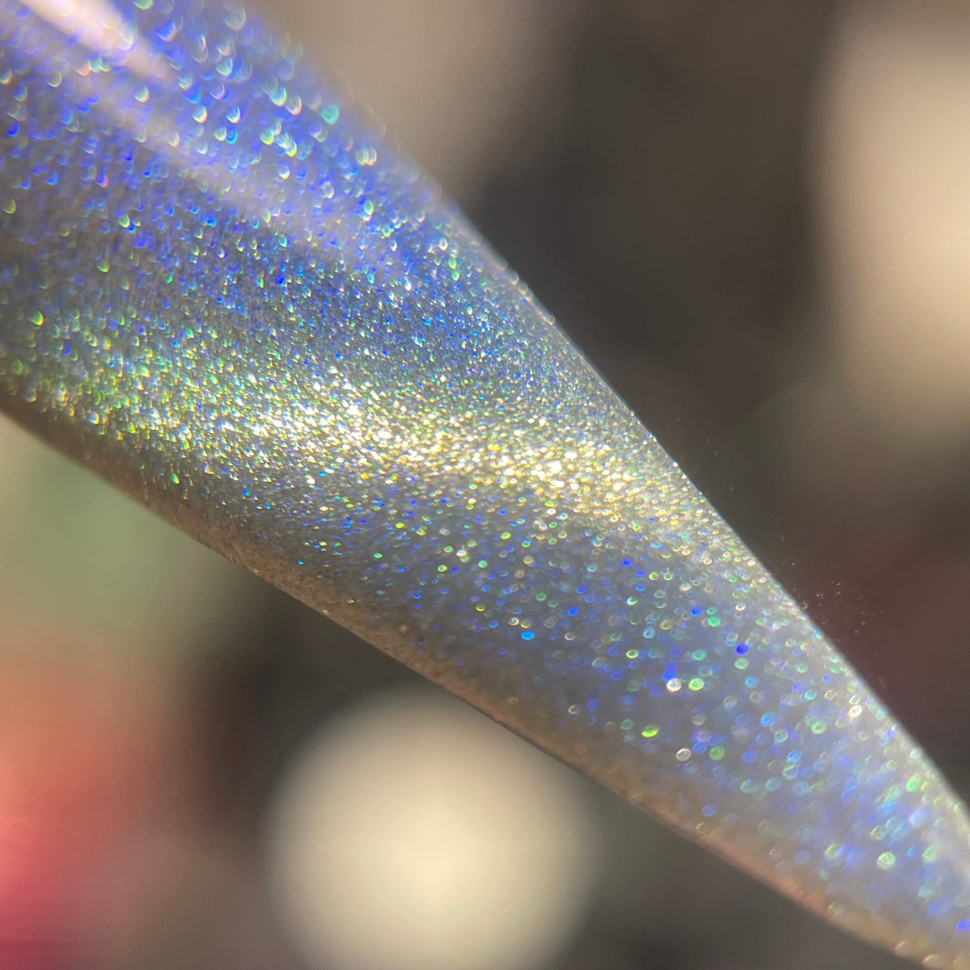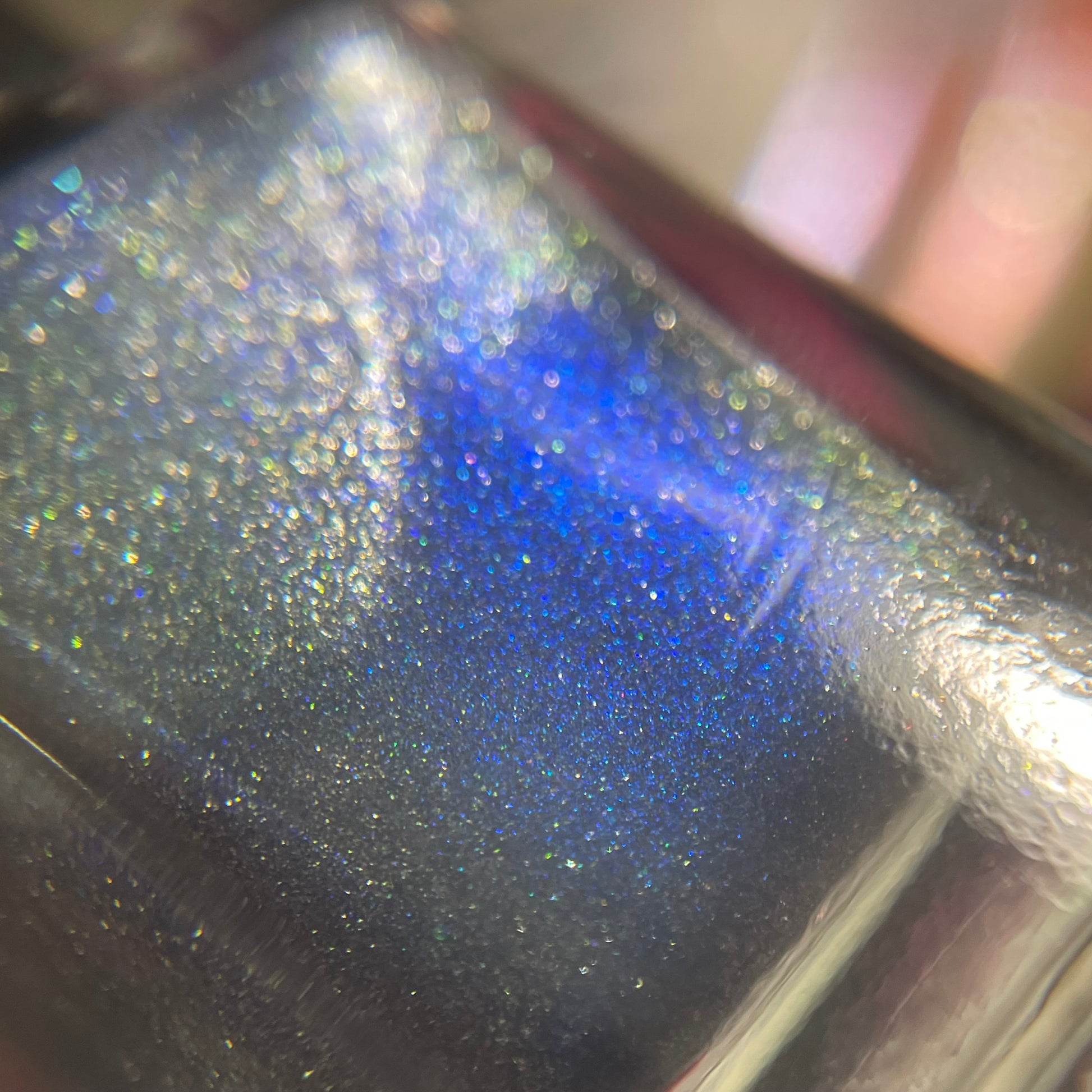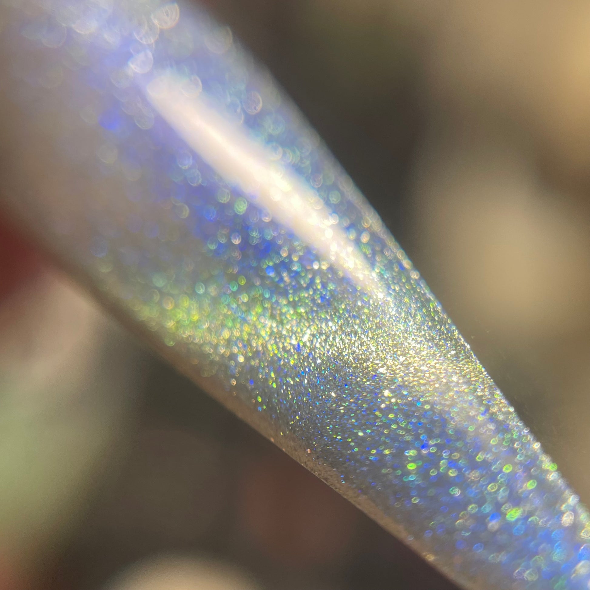 a silvery sapphire blue and holo green elements inside of a silvery magnetic.