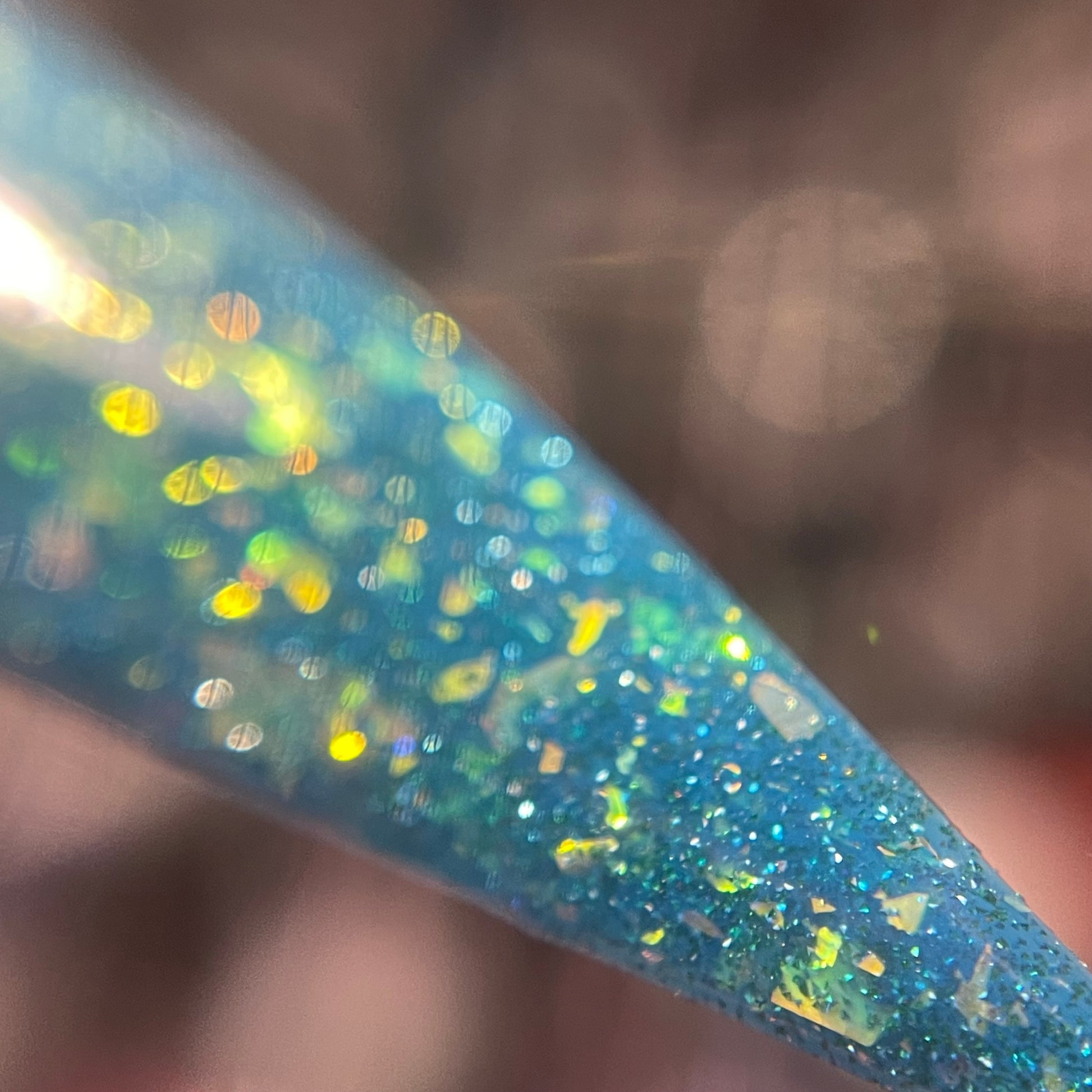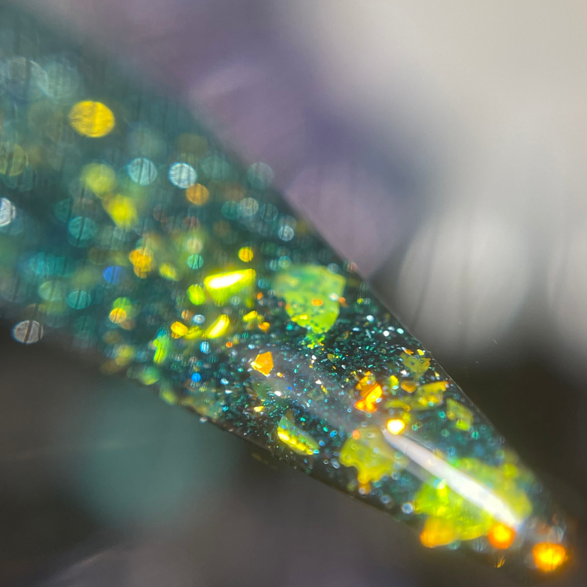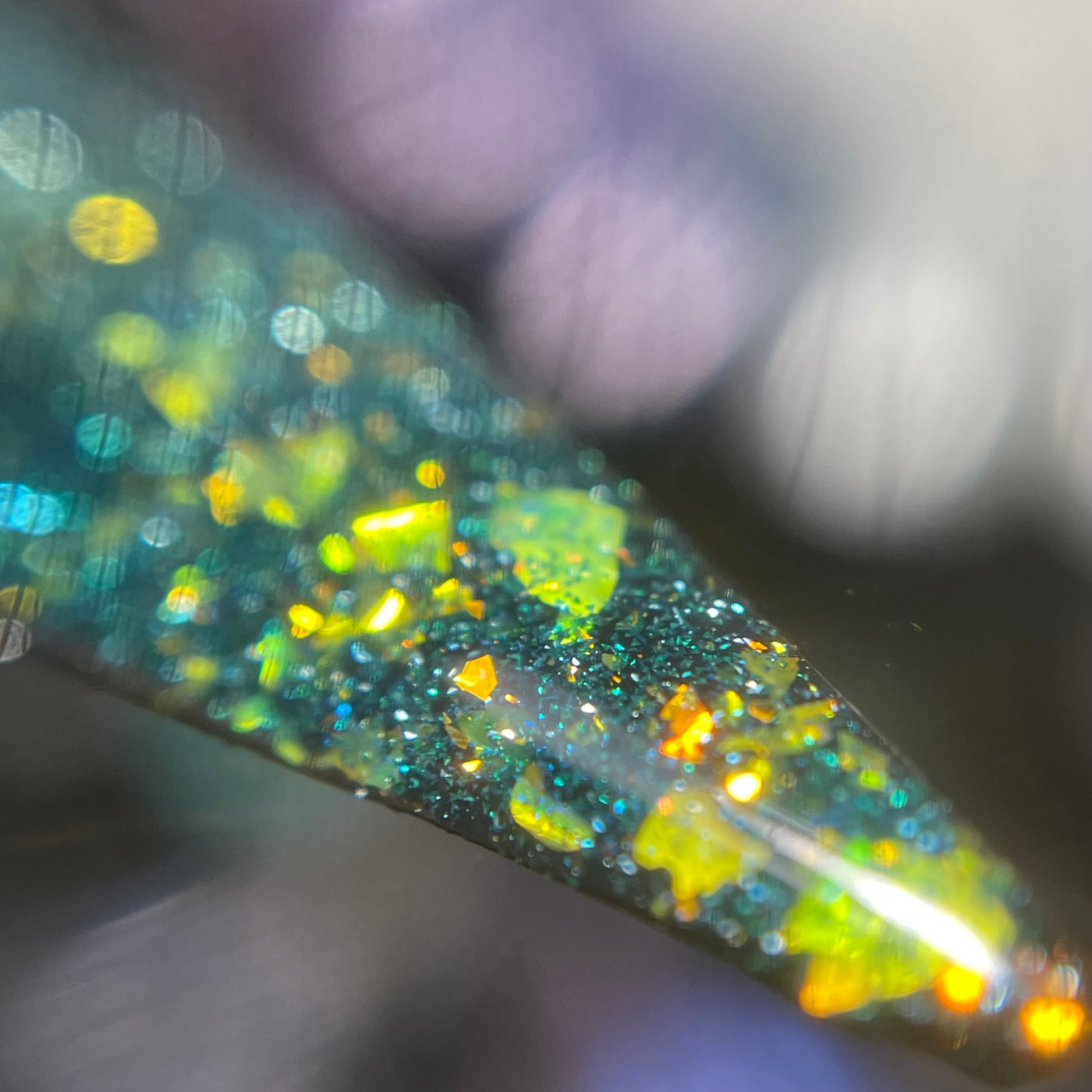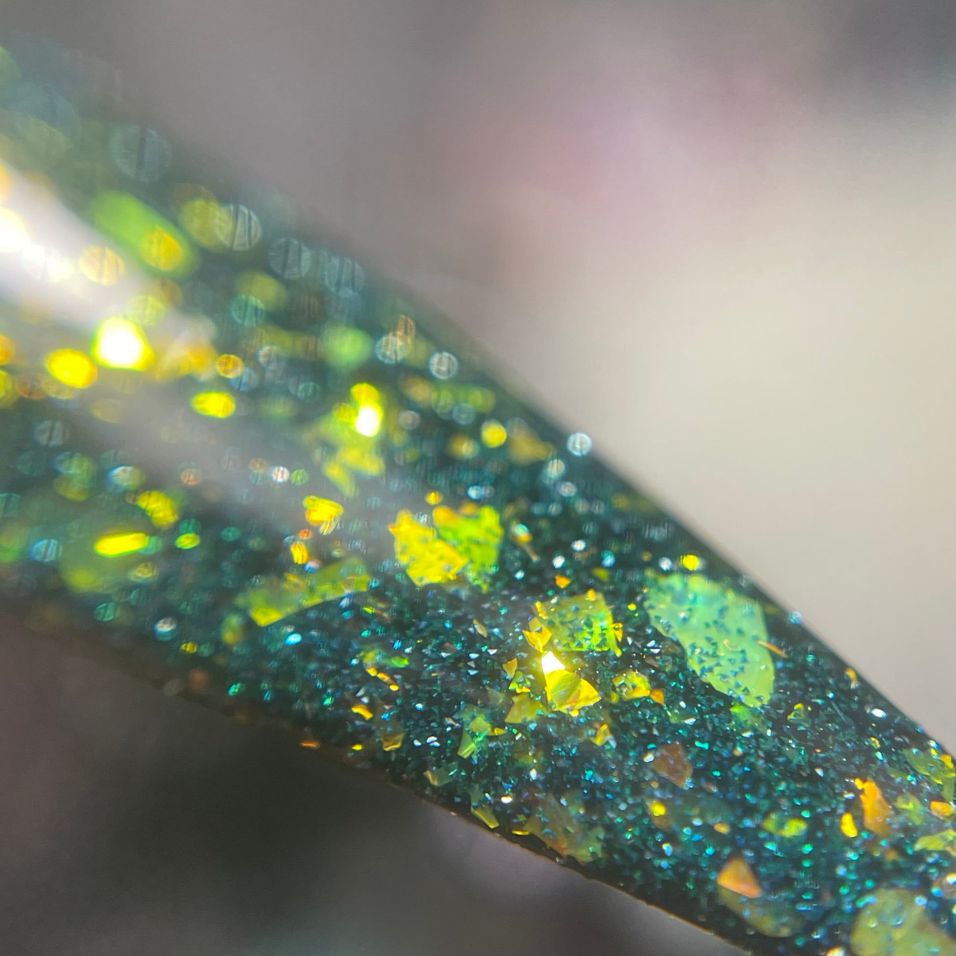 A b;ie base with a heavy shifty gold flakes, and a gorgeous green reflective running throughout this polish packs a pretty green punch