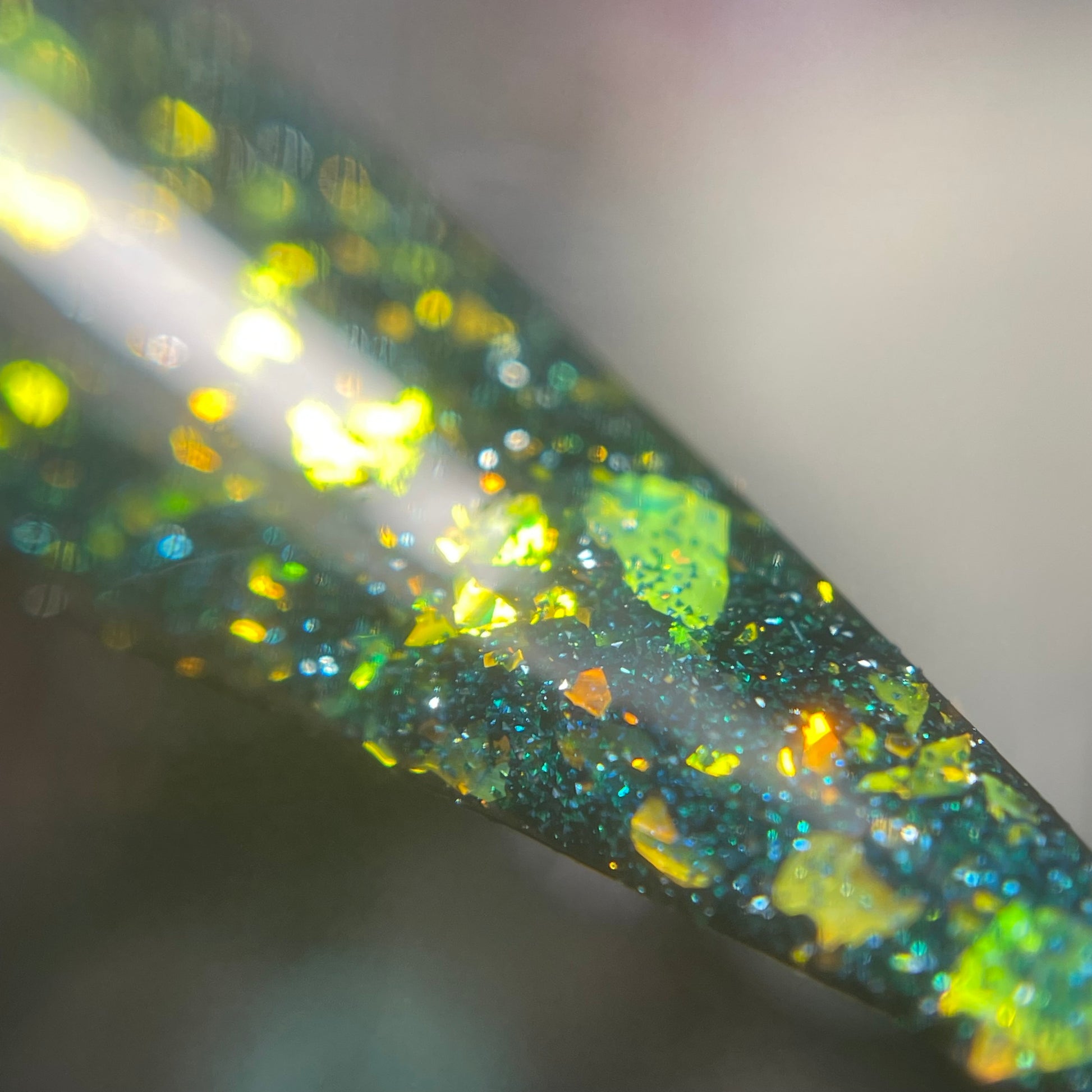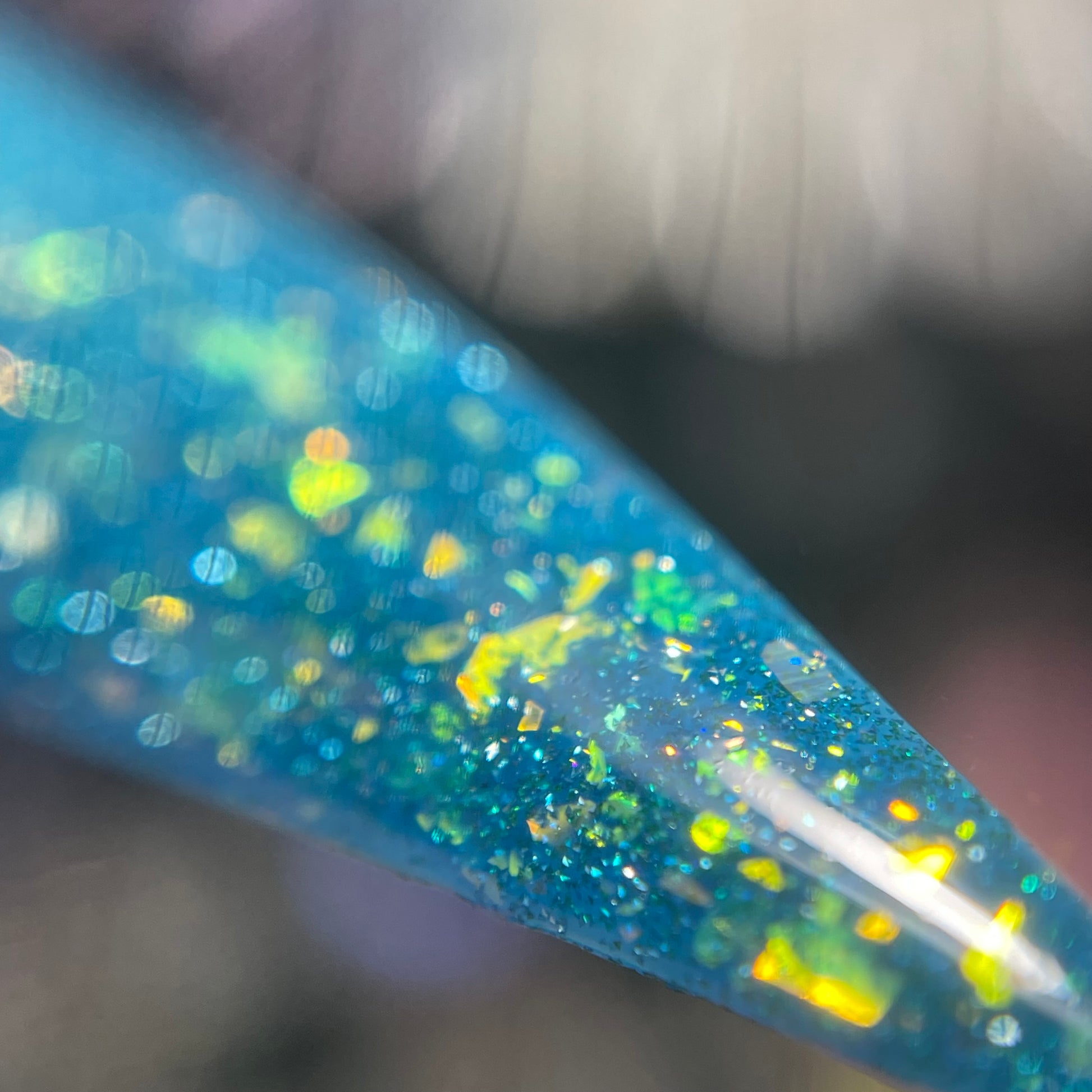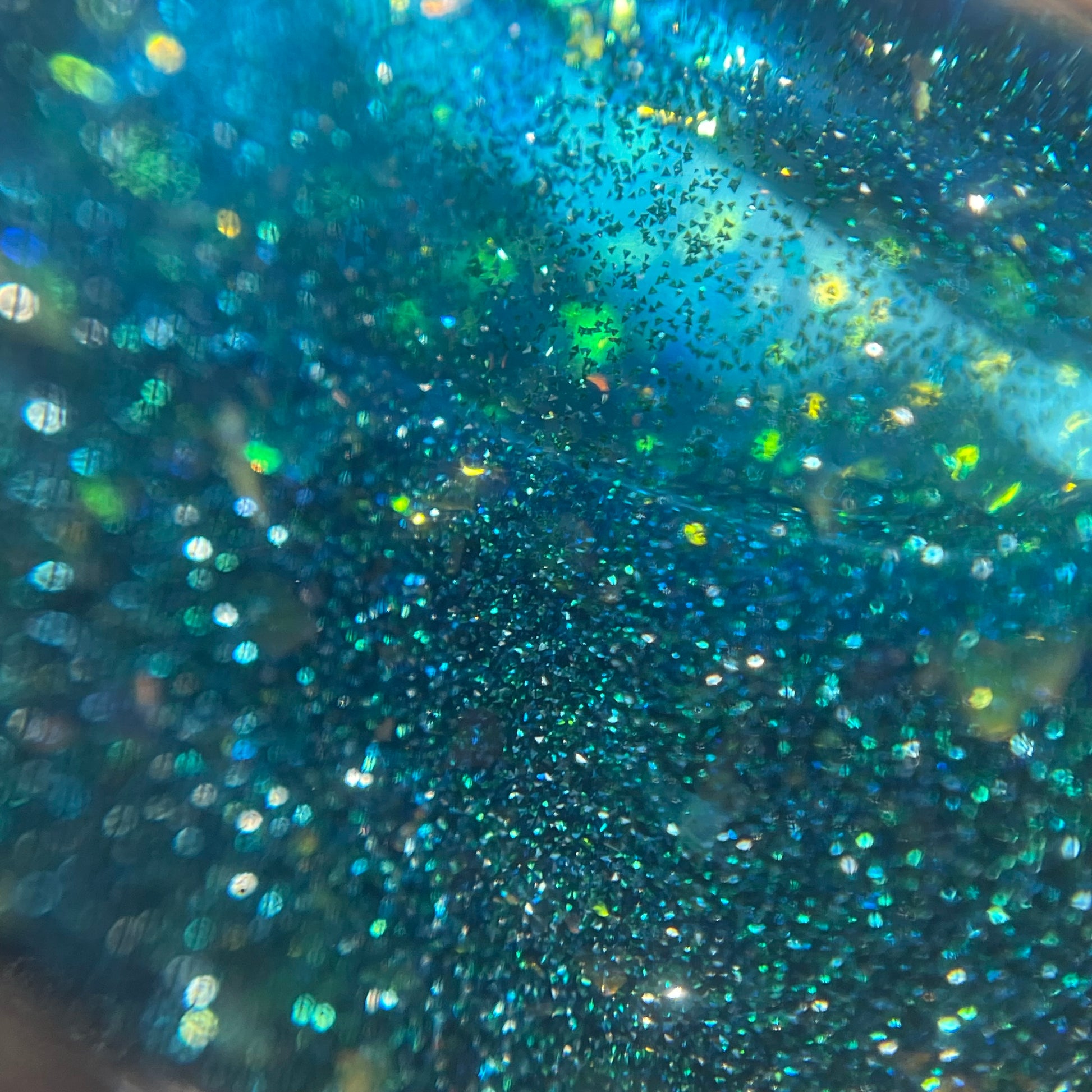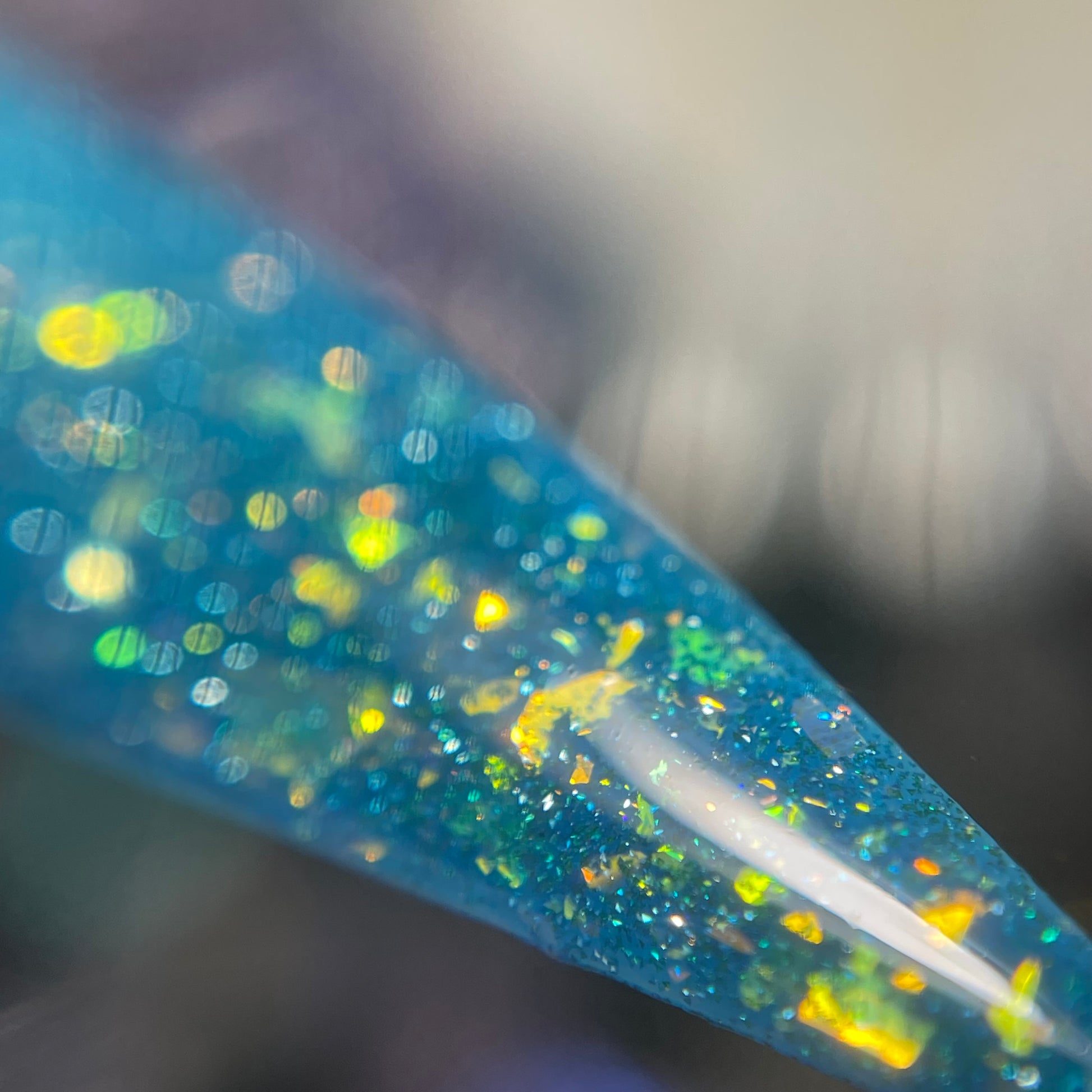 A b;ie base with a heavy shifty gold flakes, and a gorgeous green reflective running throughout this polish packs a pretty green punch
