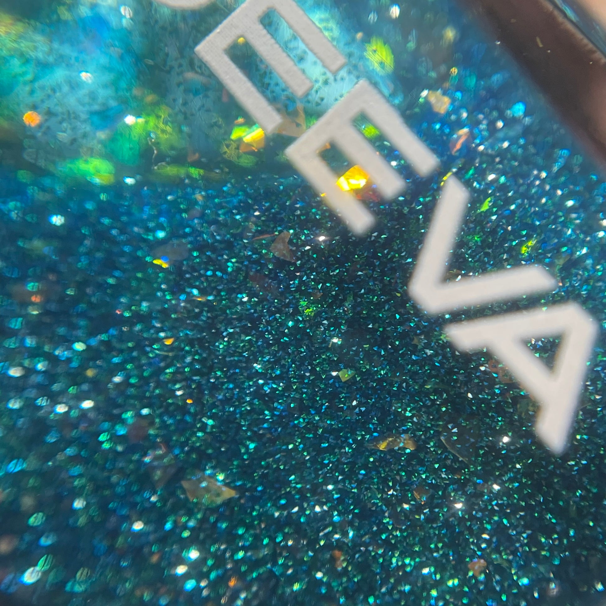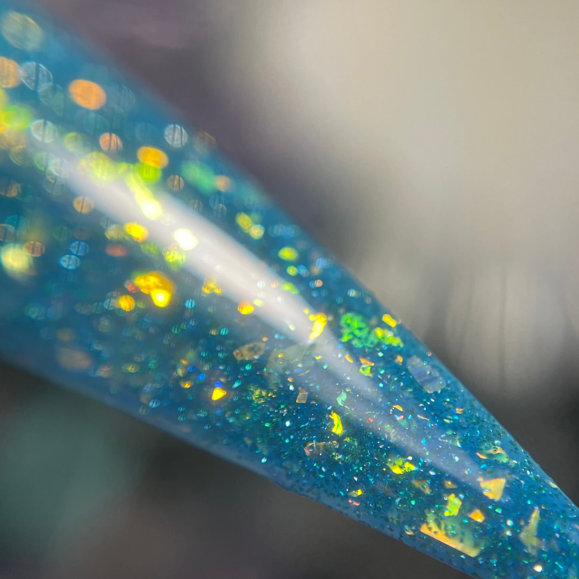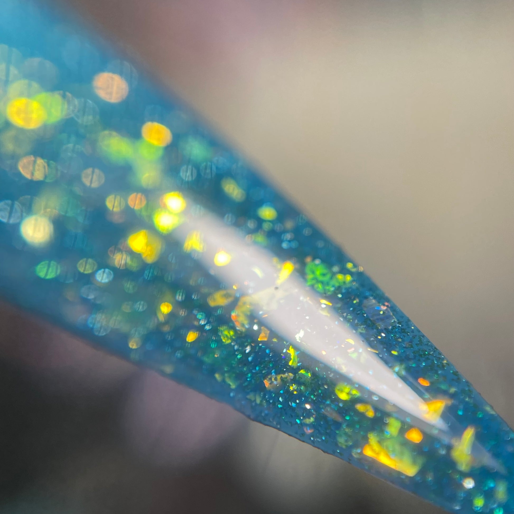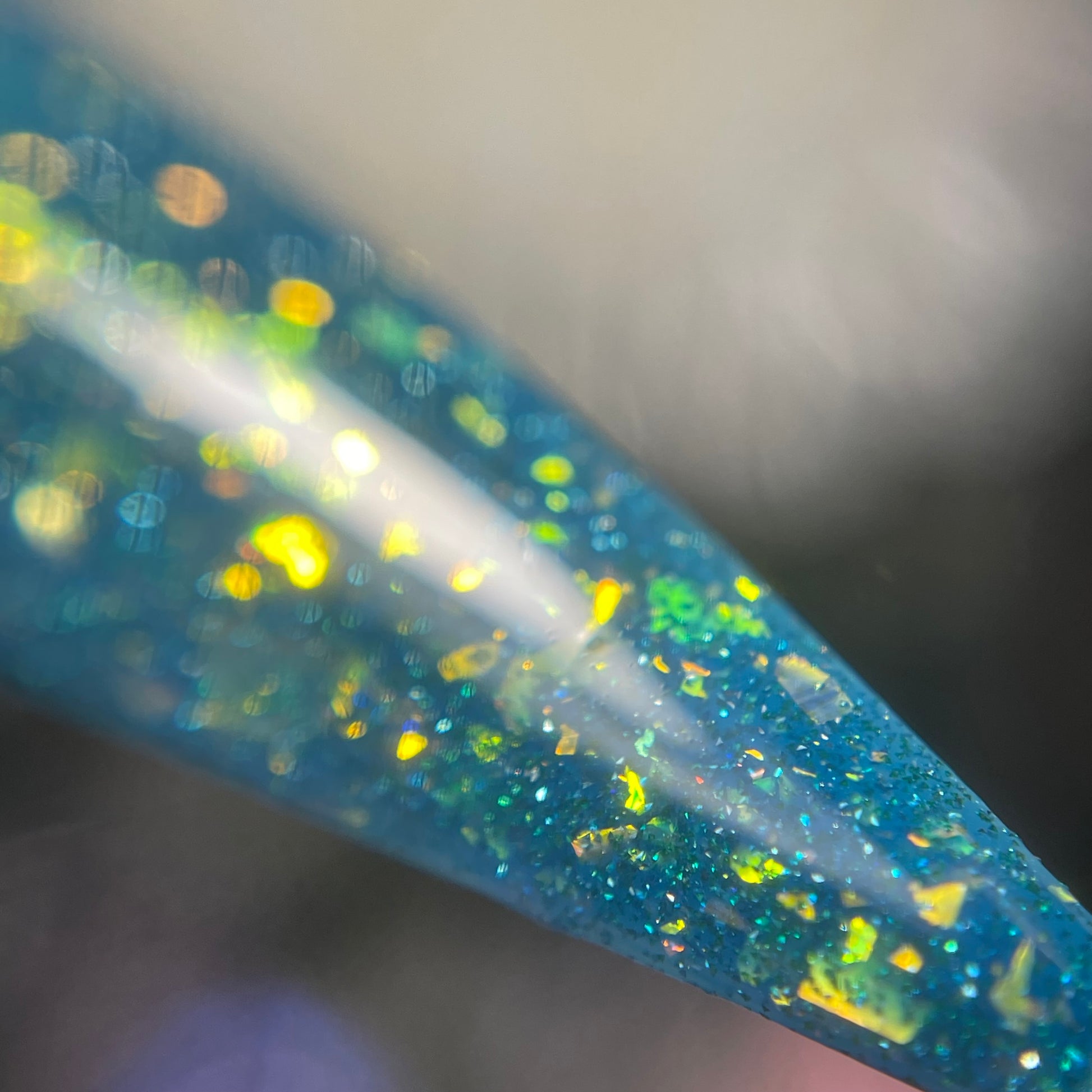 A b;ie base with a heavy shifty gold flakes, and a gorgeous green reflective running throughout this polish packs a pretty green punch