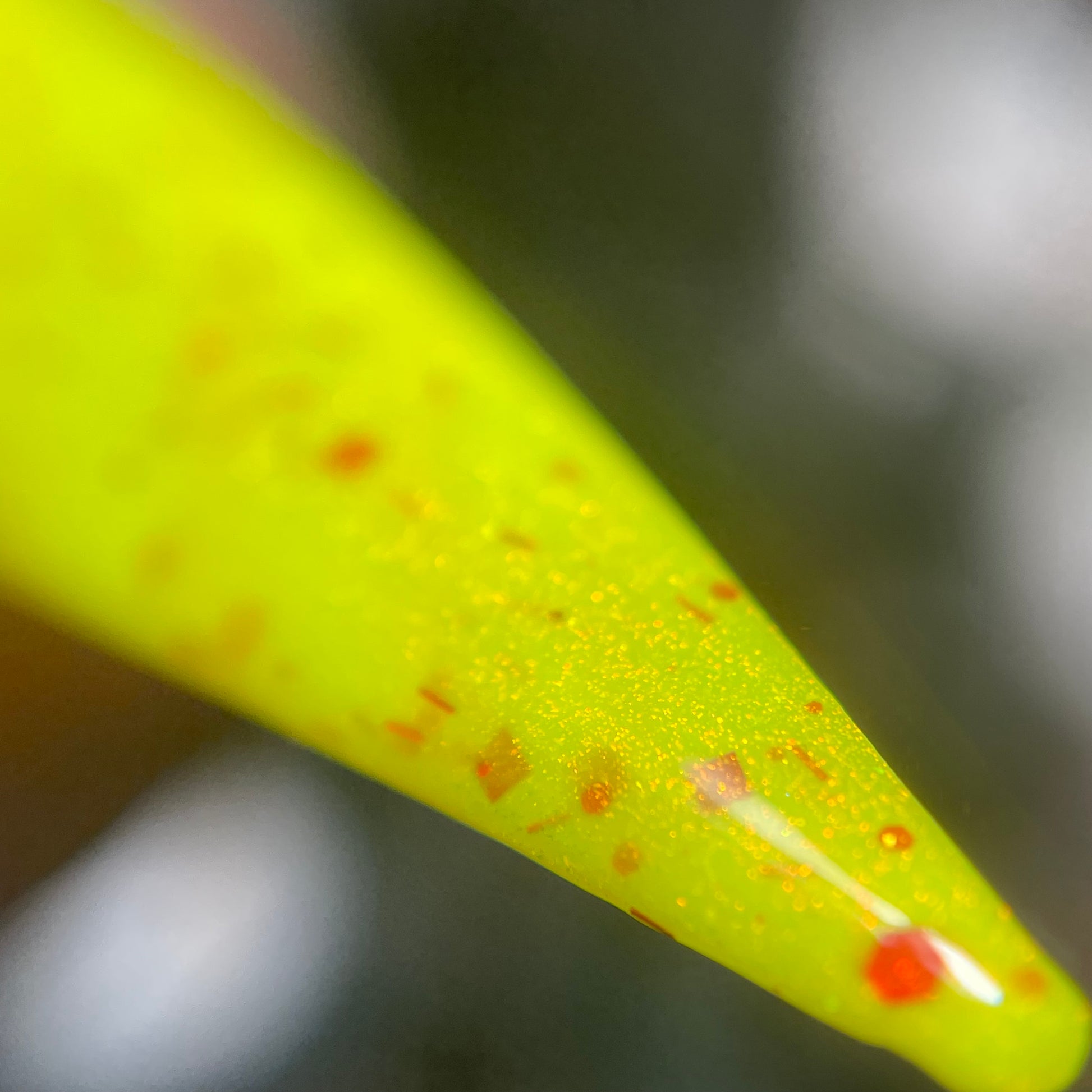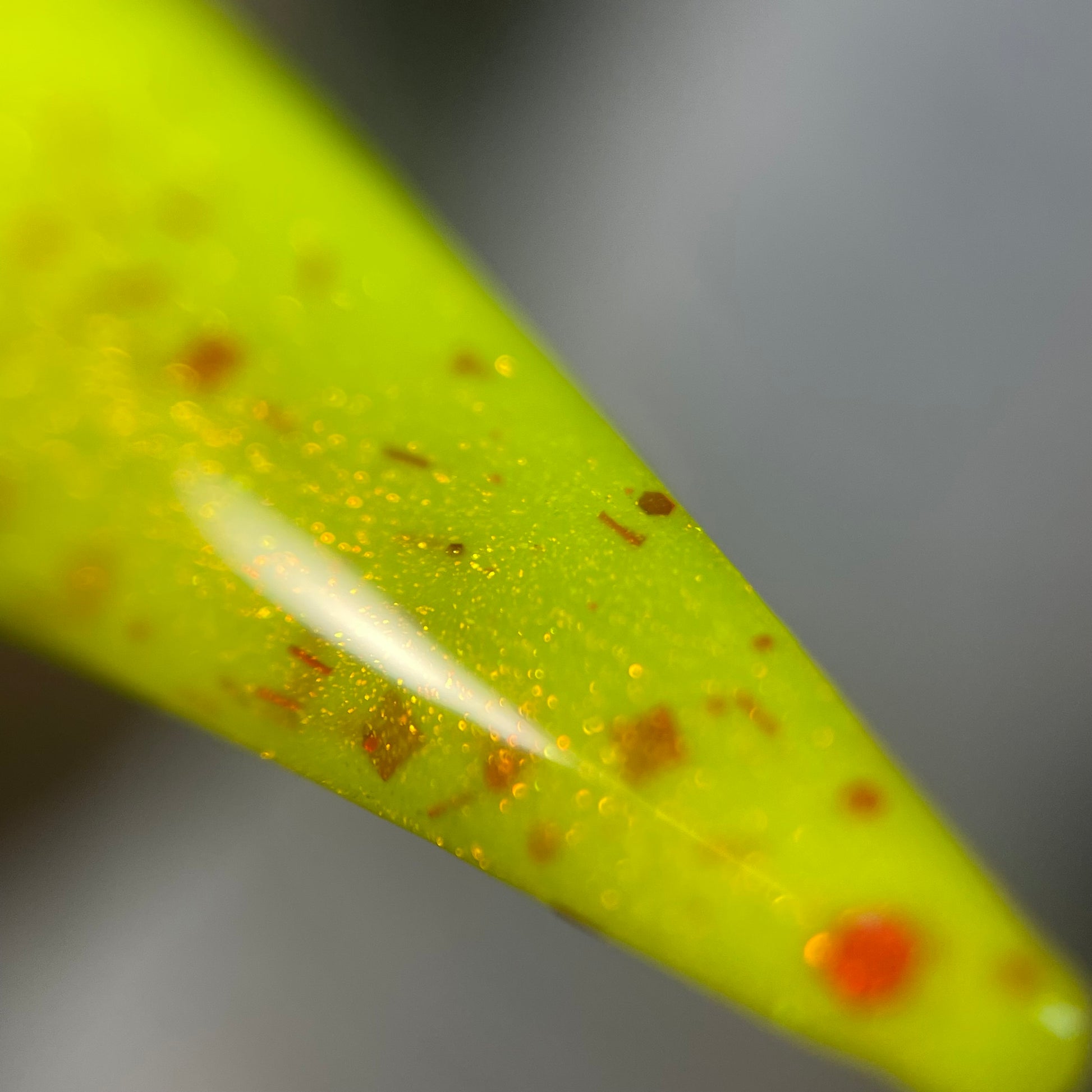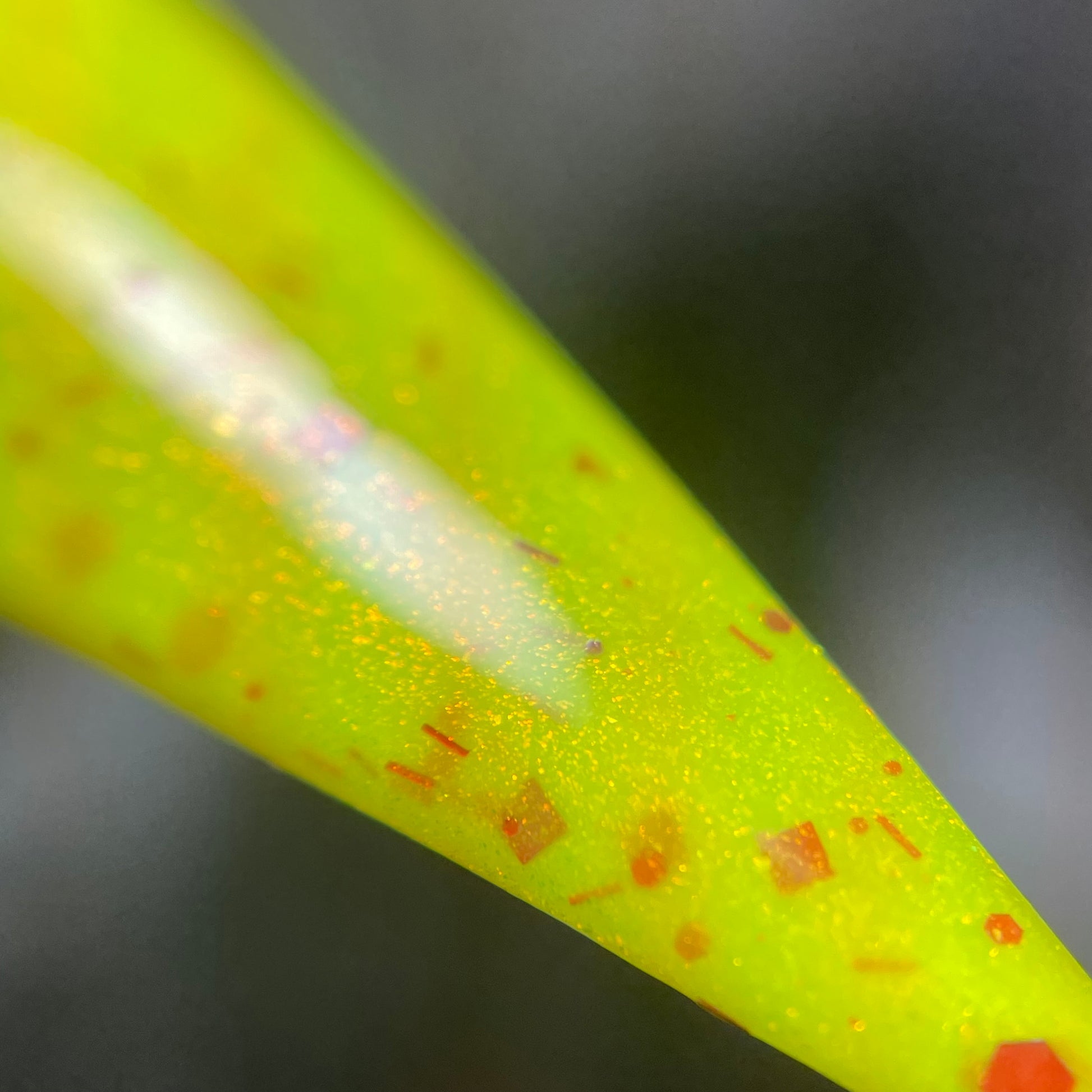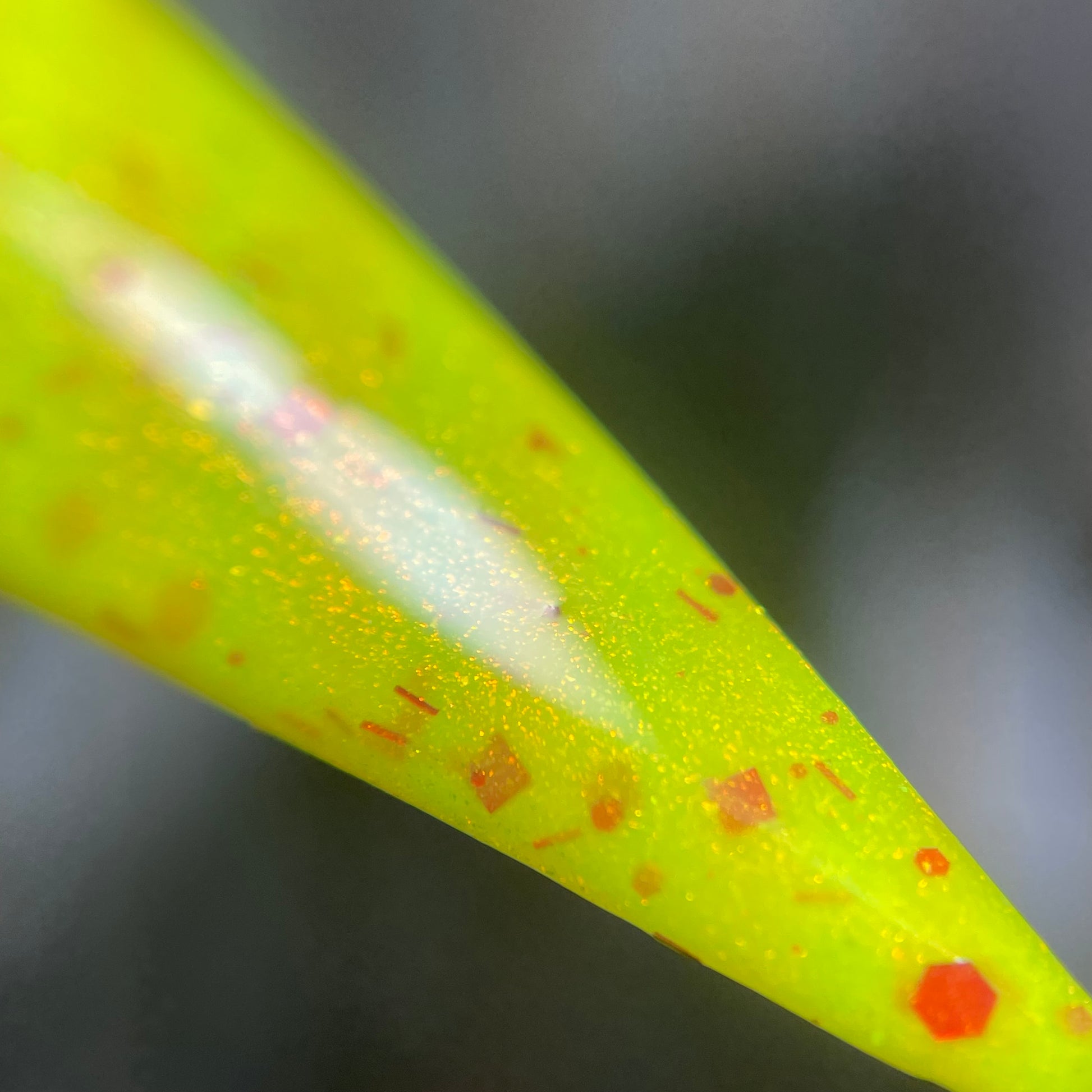 neon yellow highlighter yellow base color with red/green unicorn pee and red holo elements running throughout