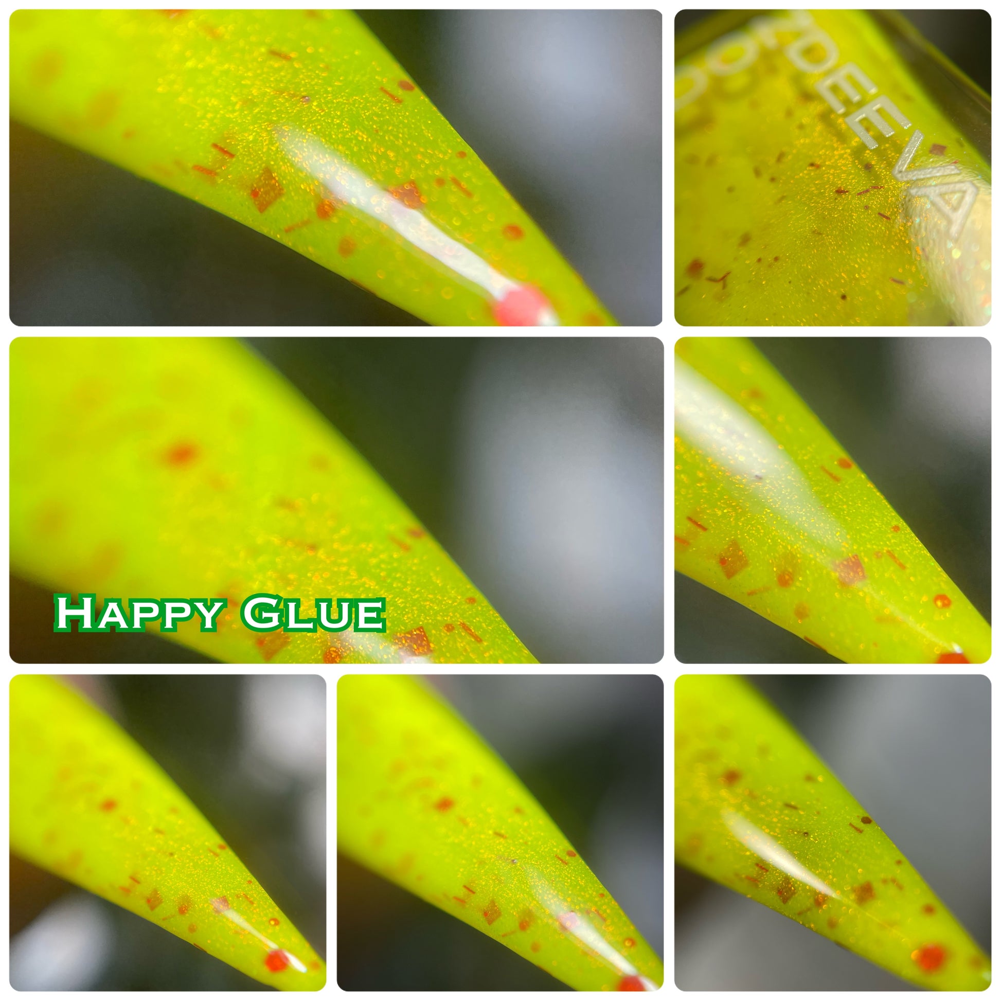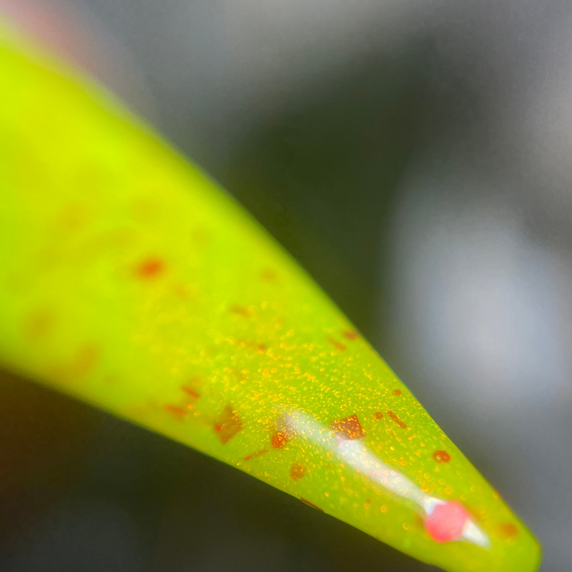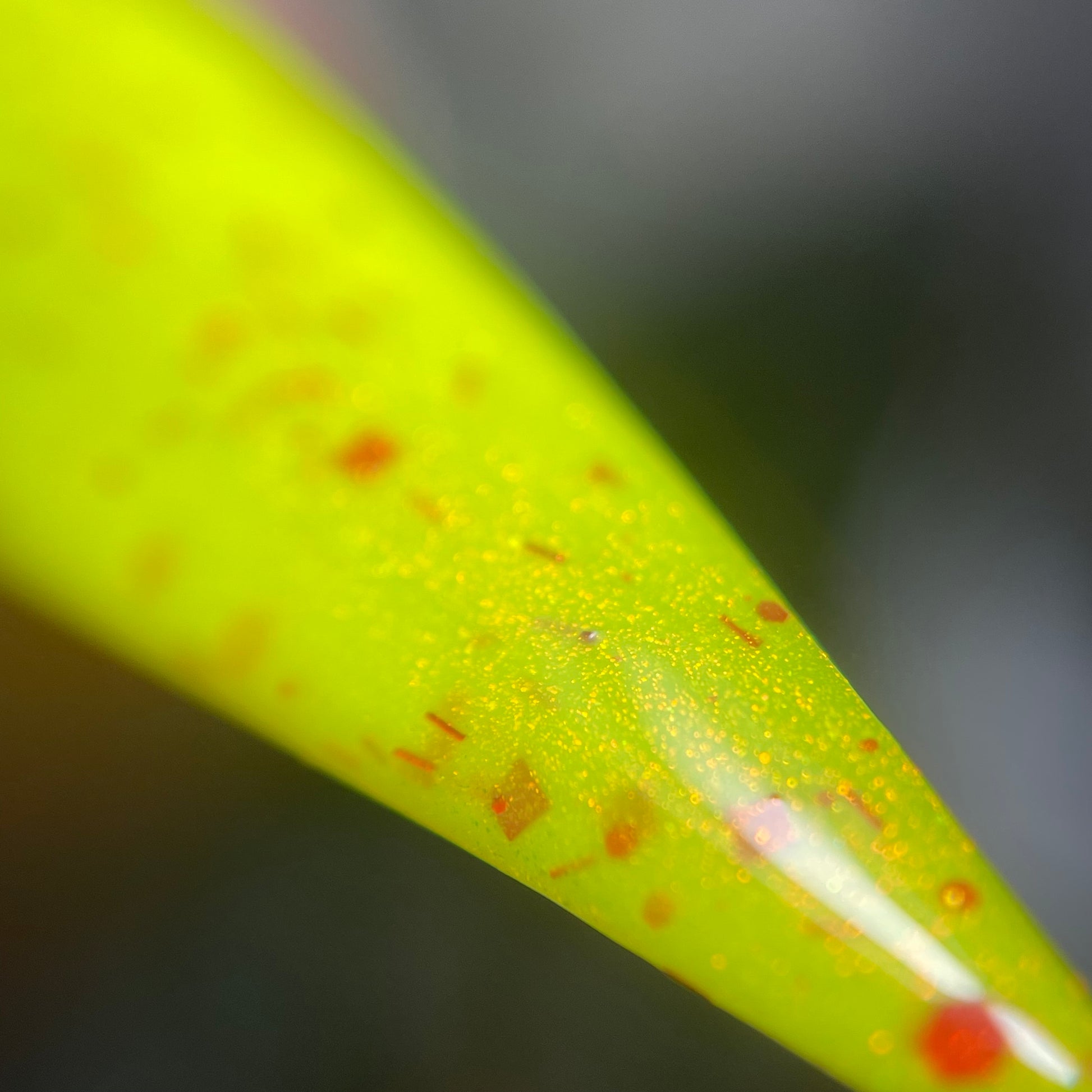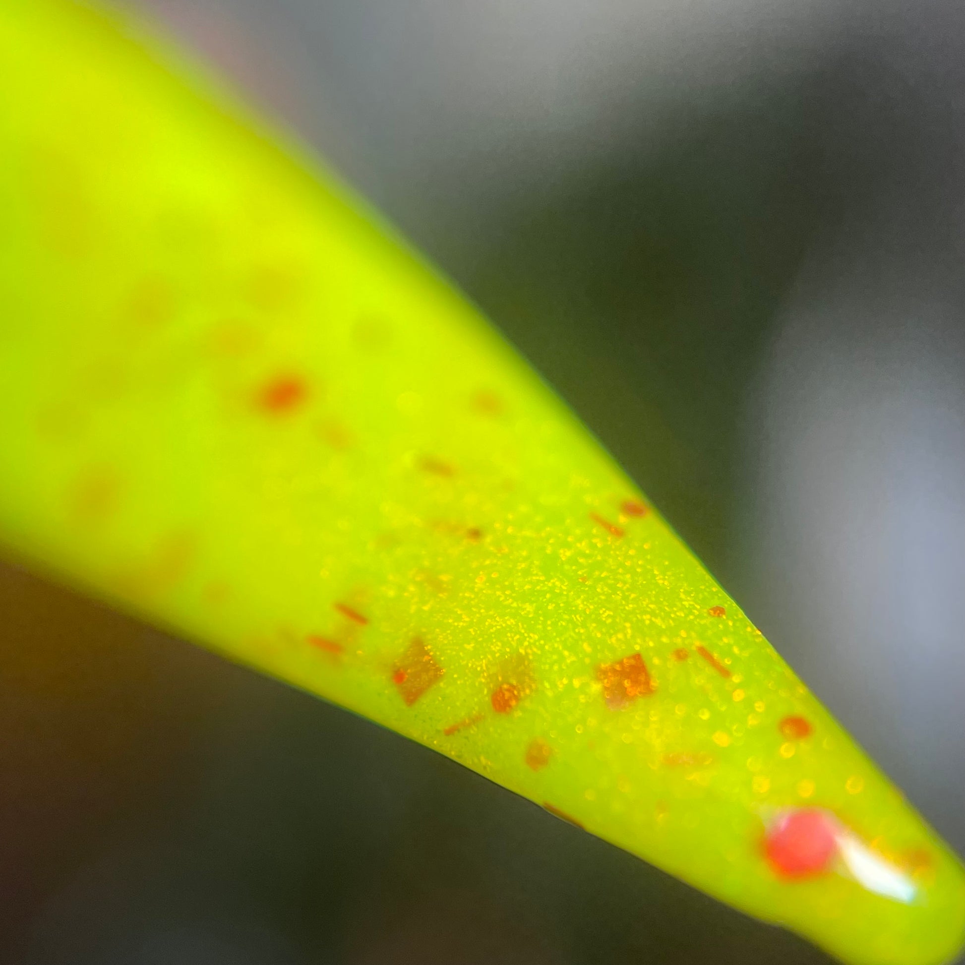 neon yellow highlighter yellow base color with red/green unicorn pee and red holo elements running throughout