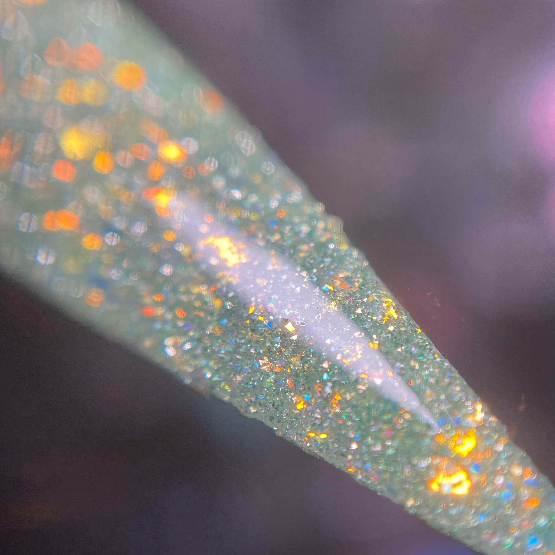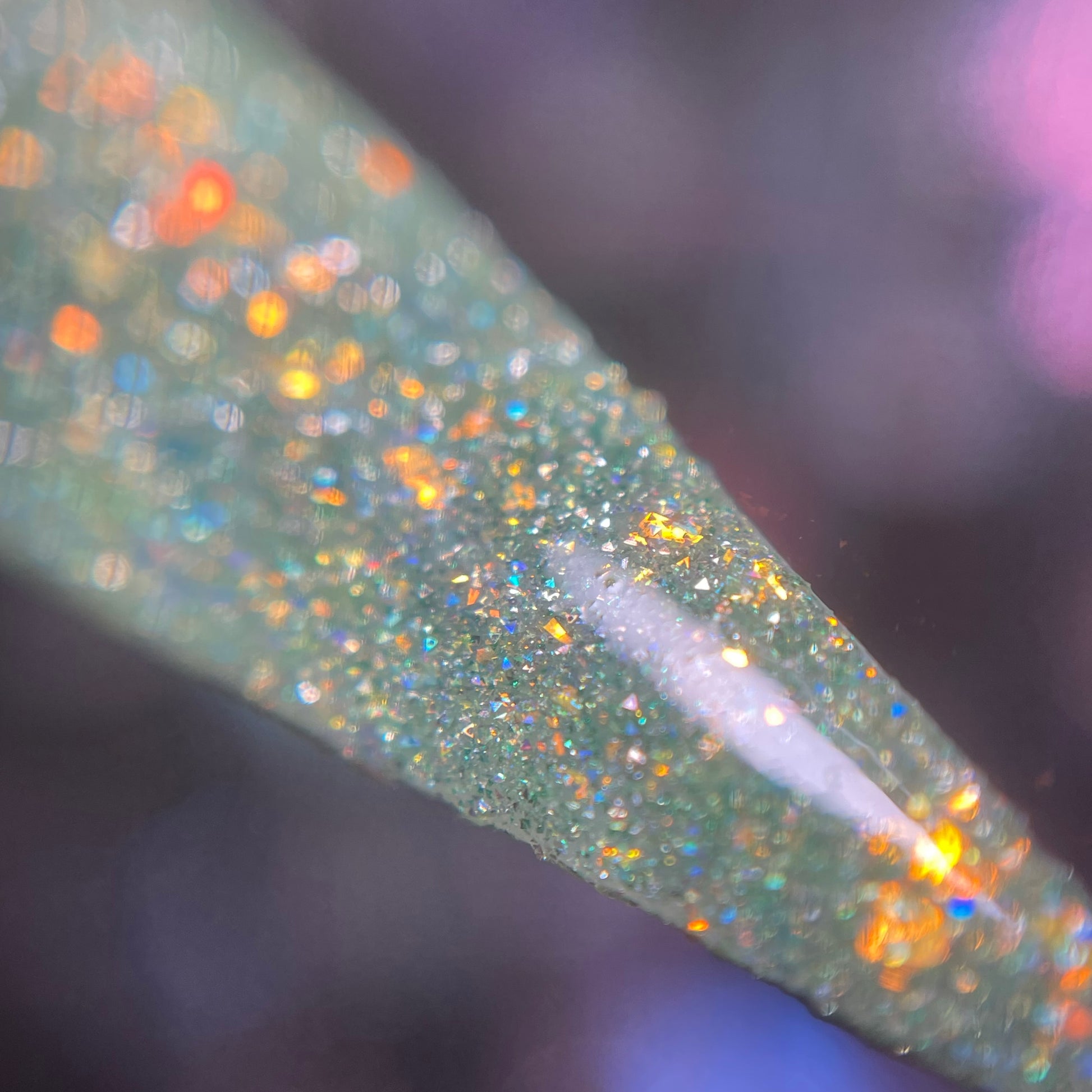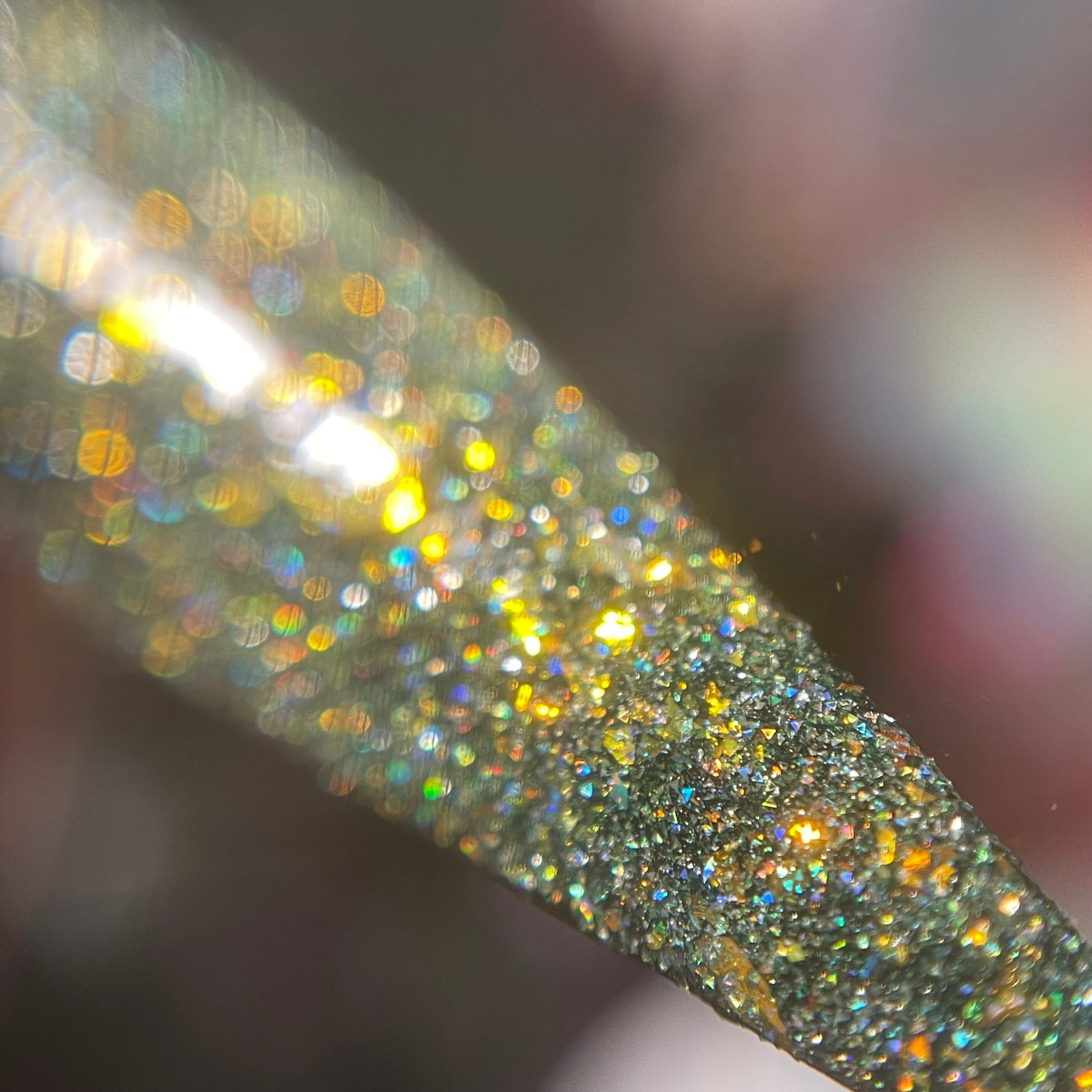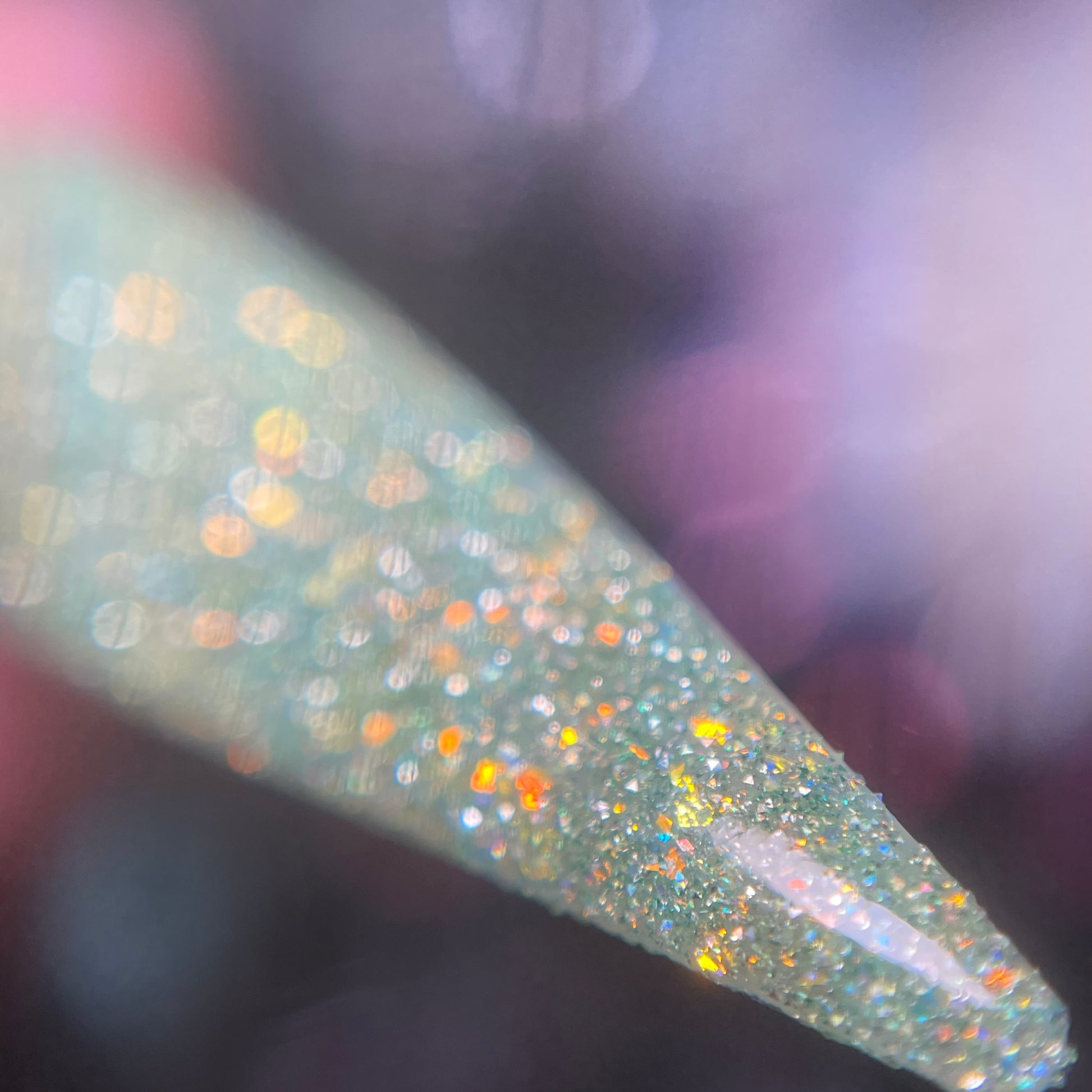 lime green reflective with all kinda elements and beautiful flakes, our non gel formula will give you good wear time without the harmful nailĀ