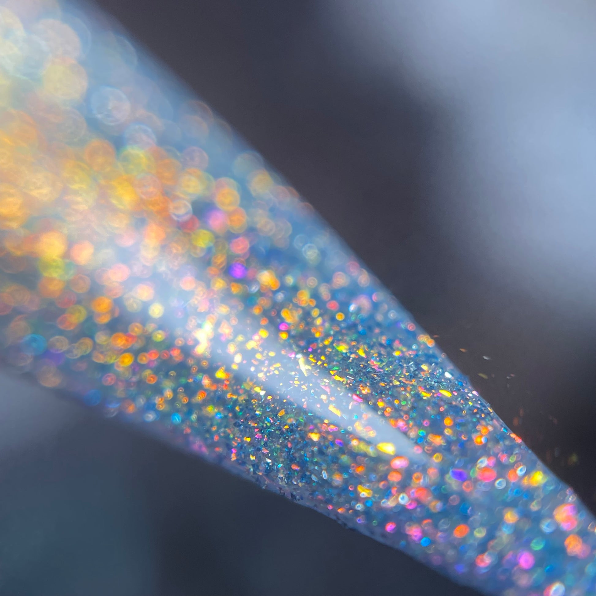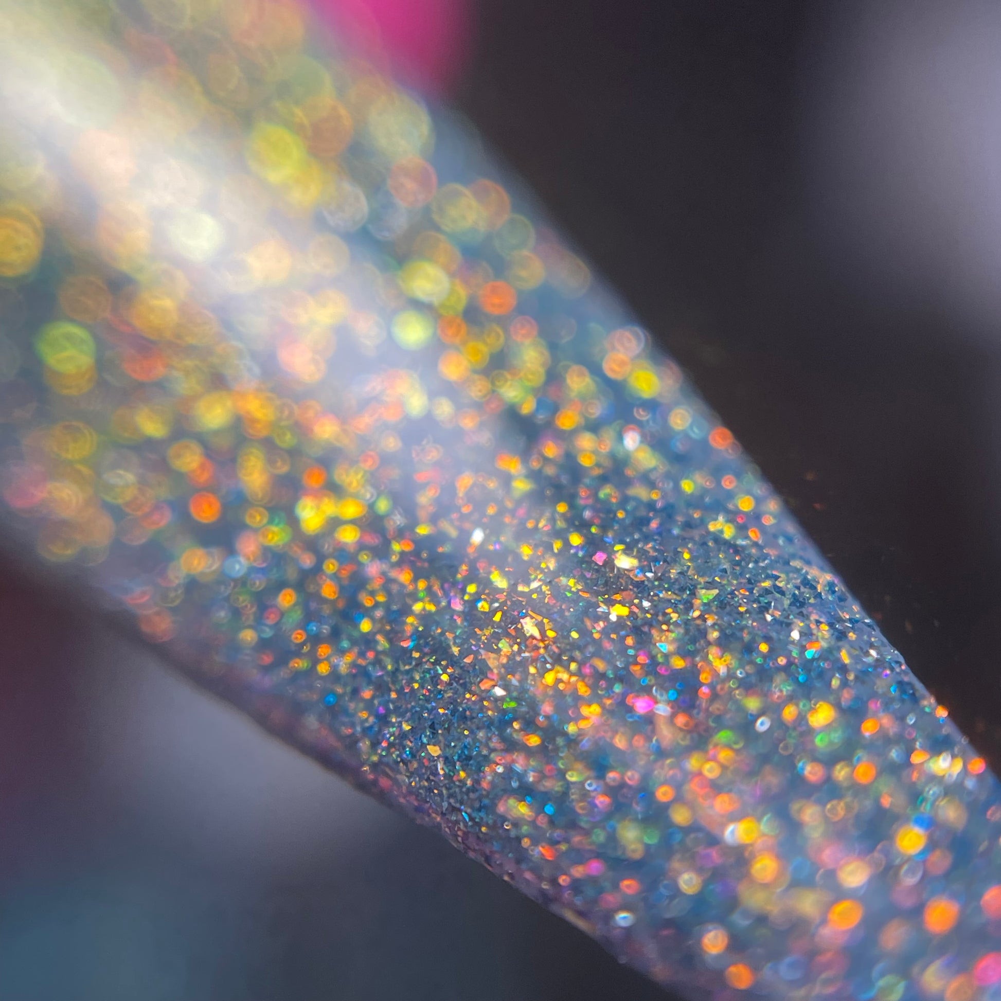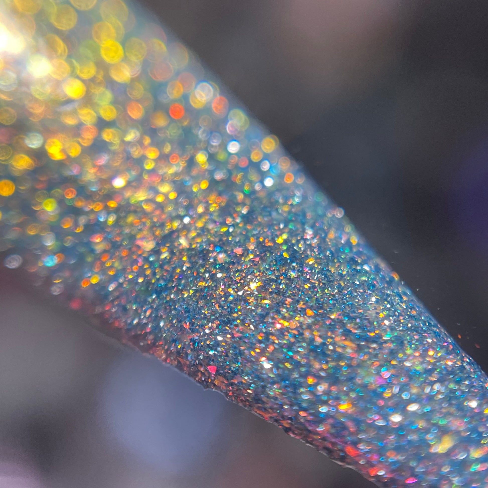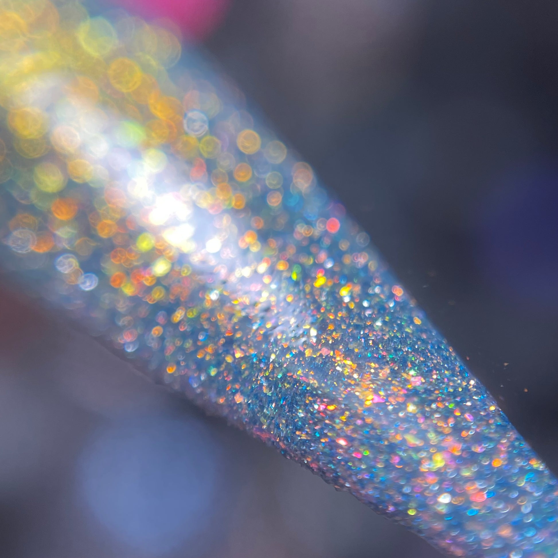 A gorgeous baby blue Steele color with heavy shifts of gold/pink and copper. Flakes and micro glass flakes.