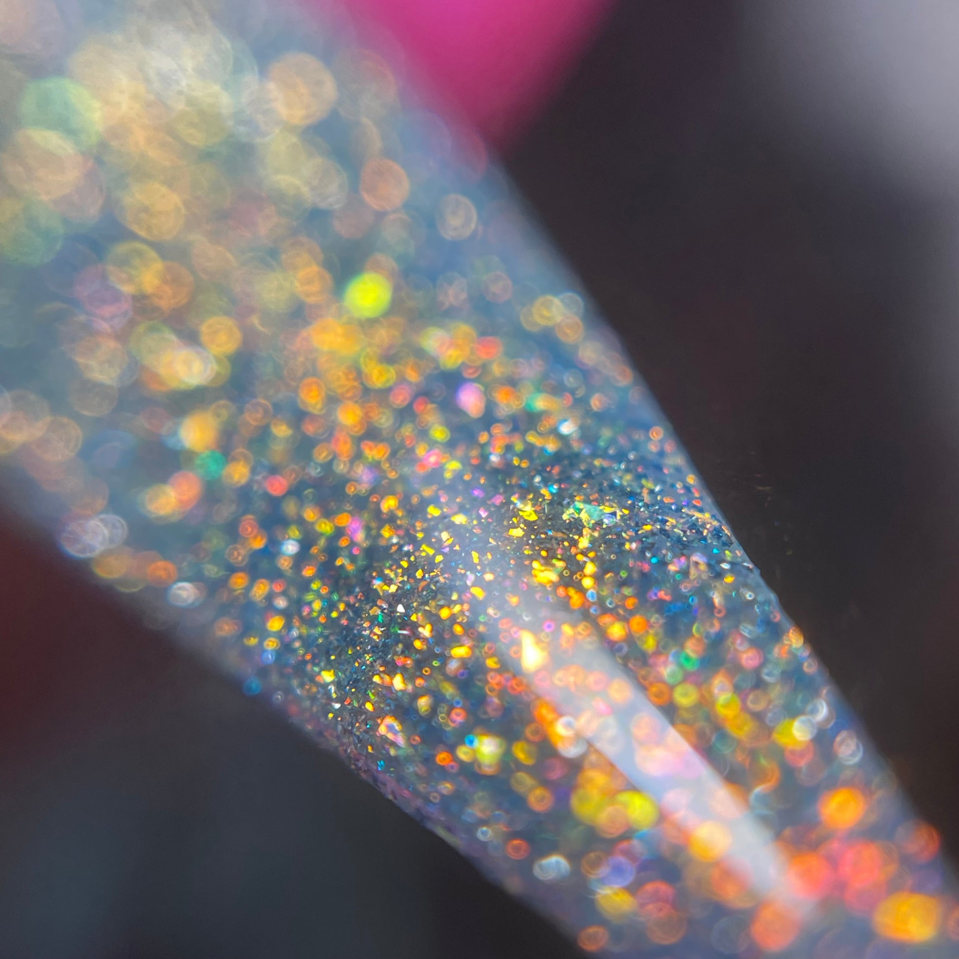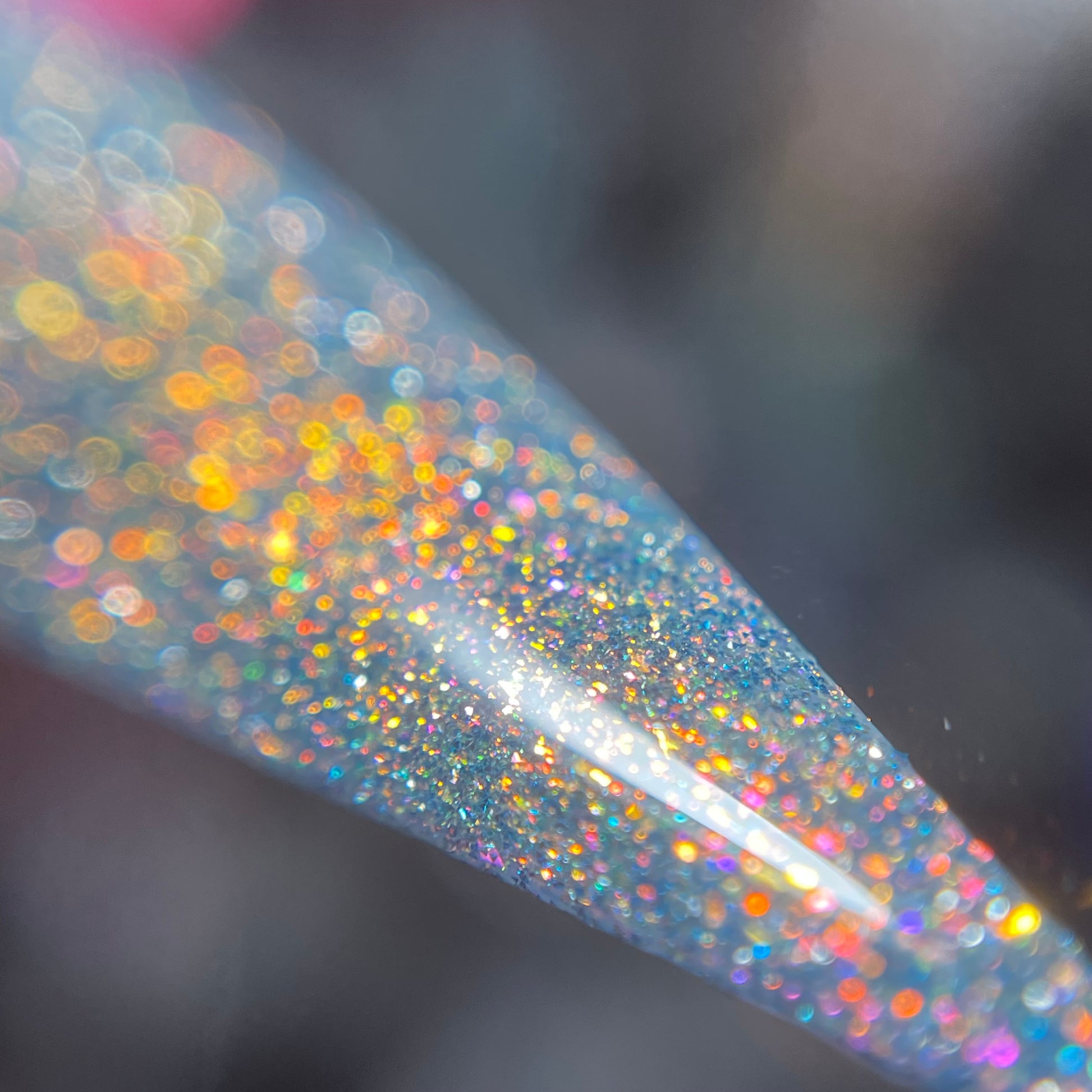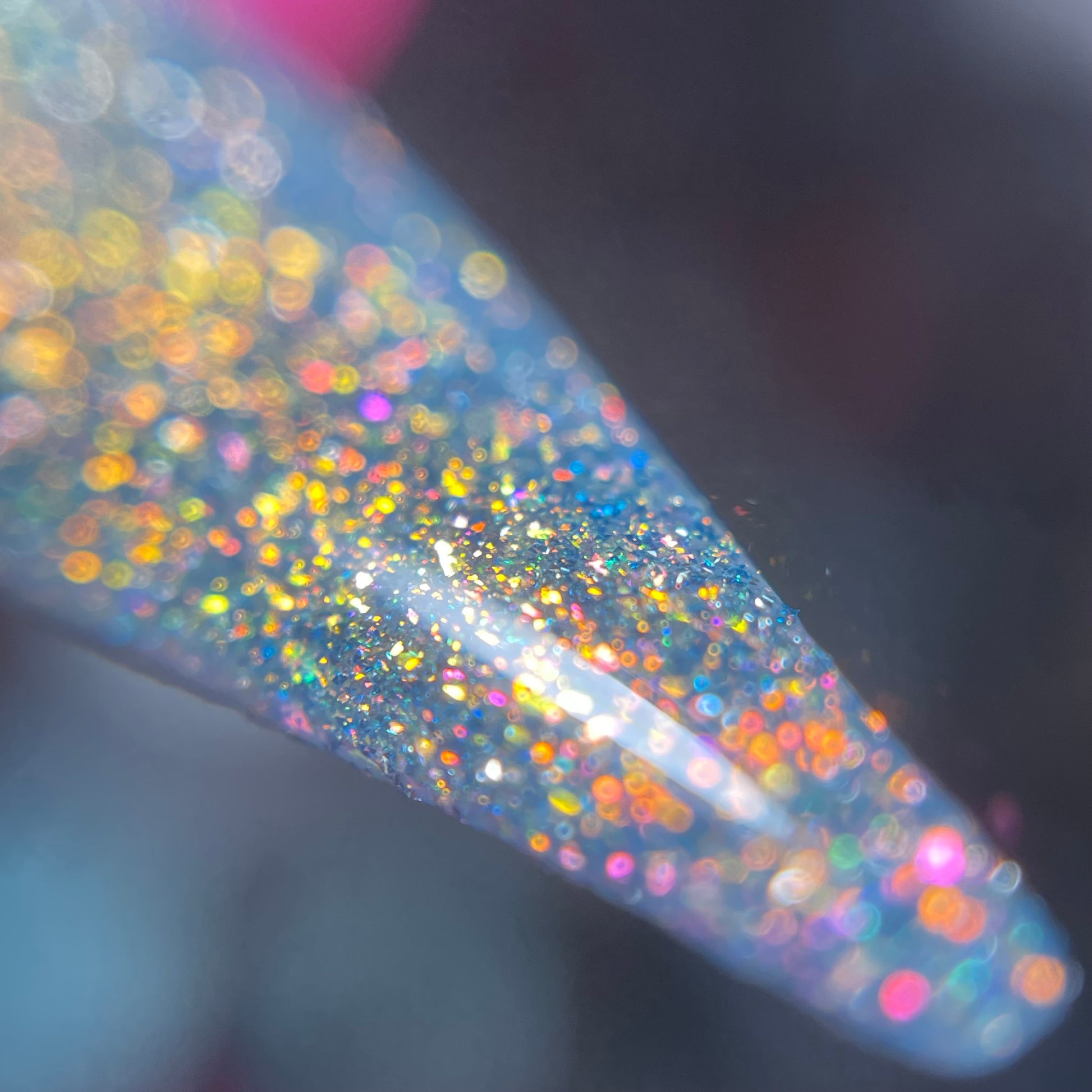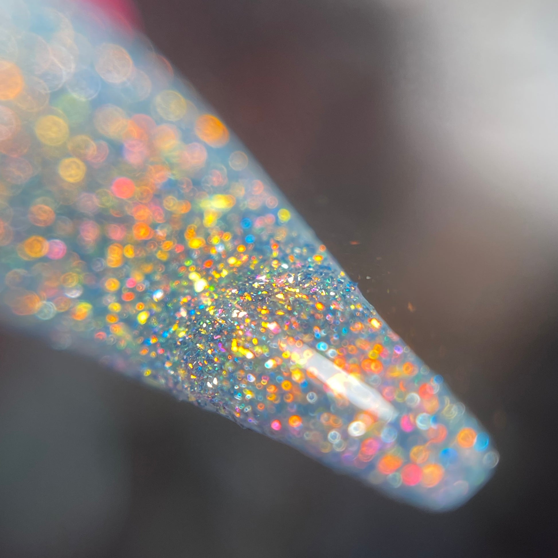 A gorgeous baby blue Steele color with heavy shifts of gold/pink and copper. Flakes and micro glass flakes.