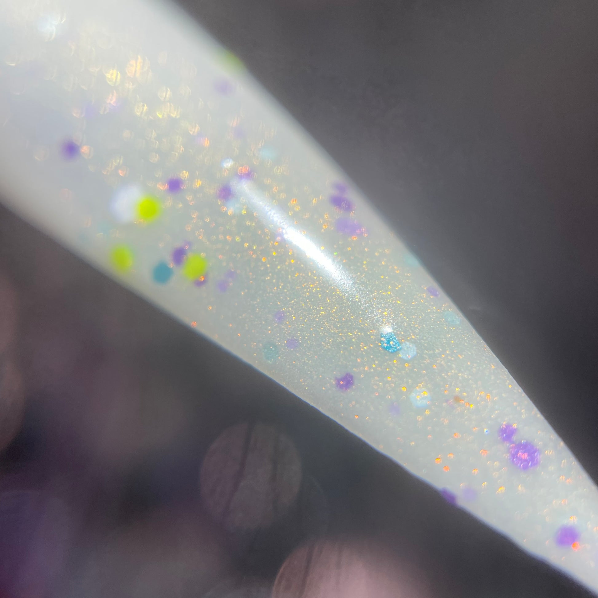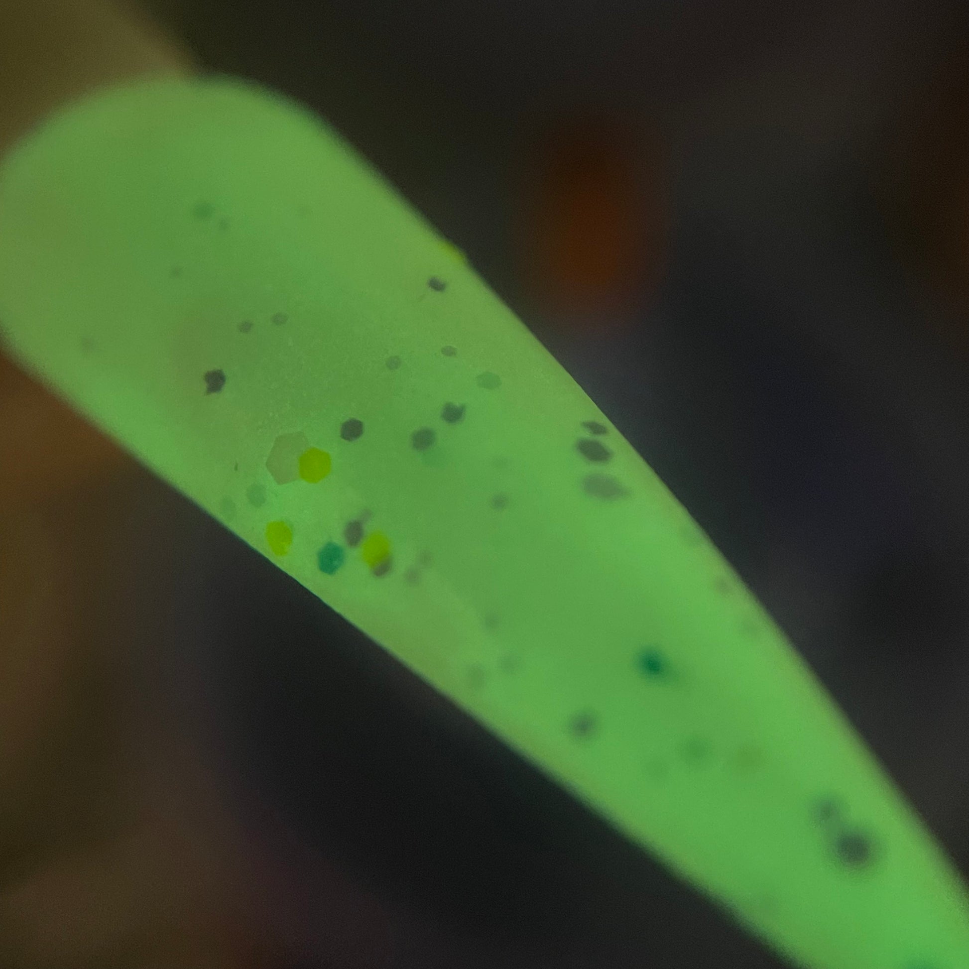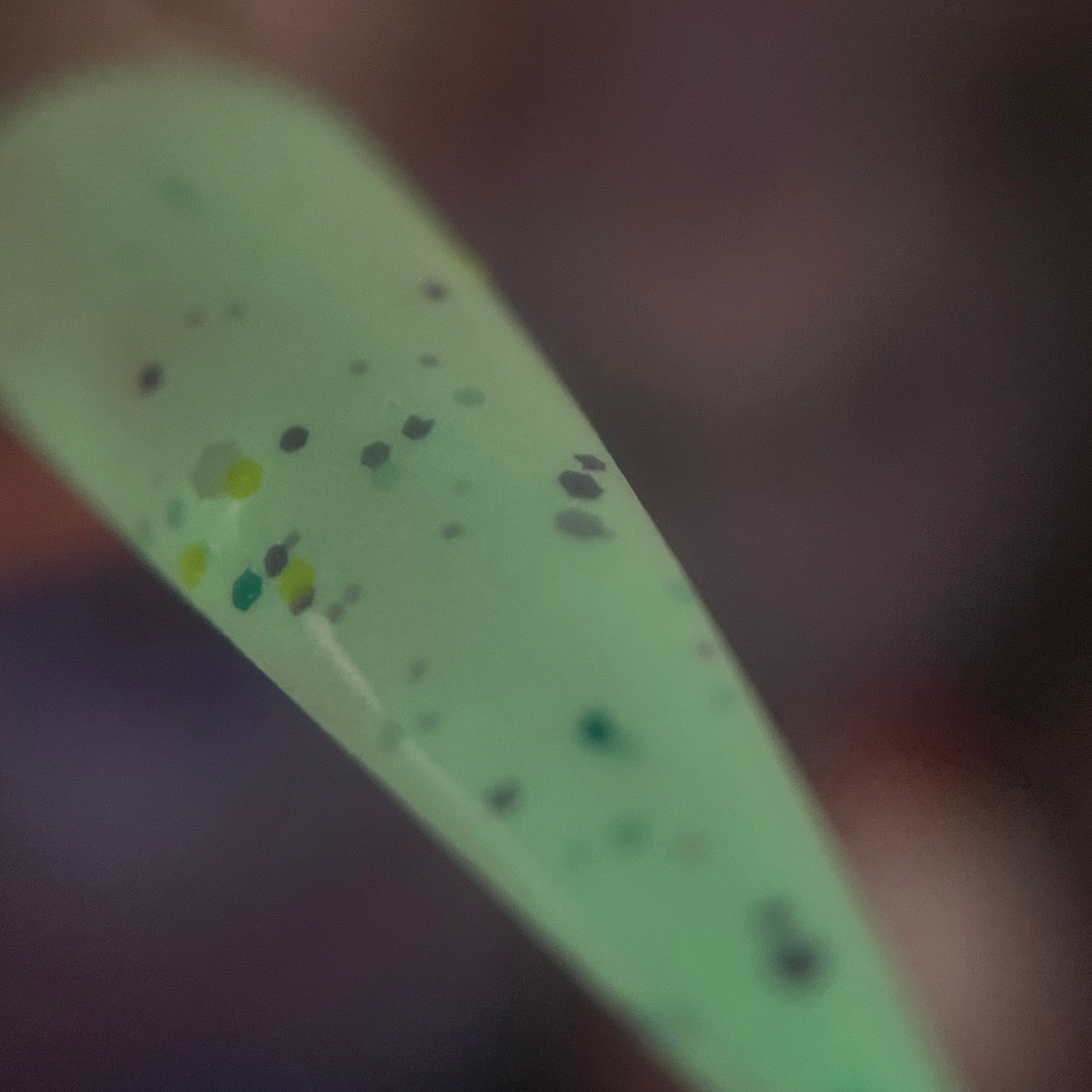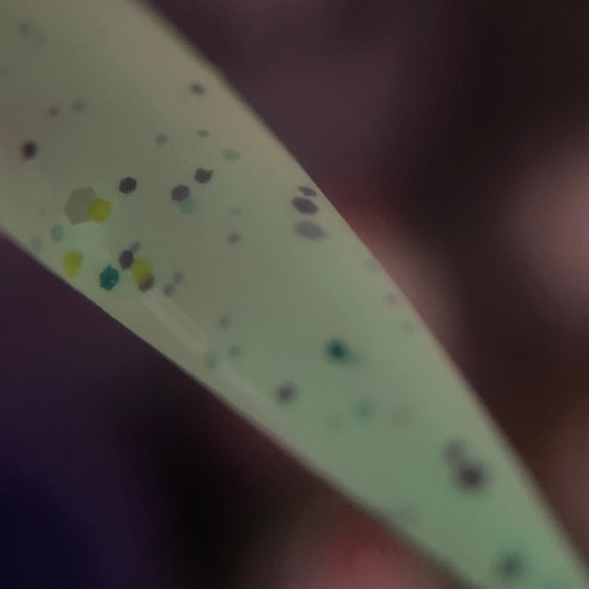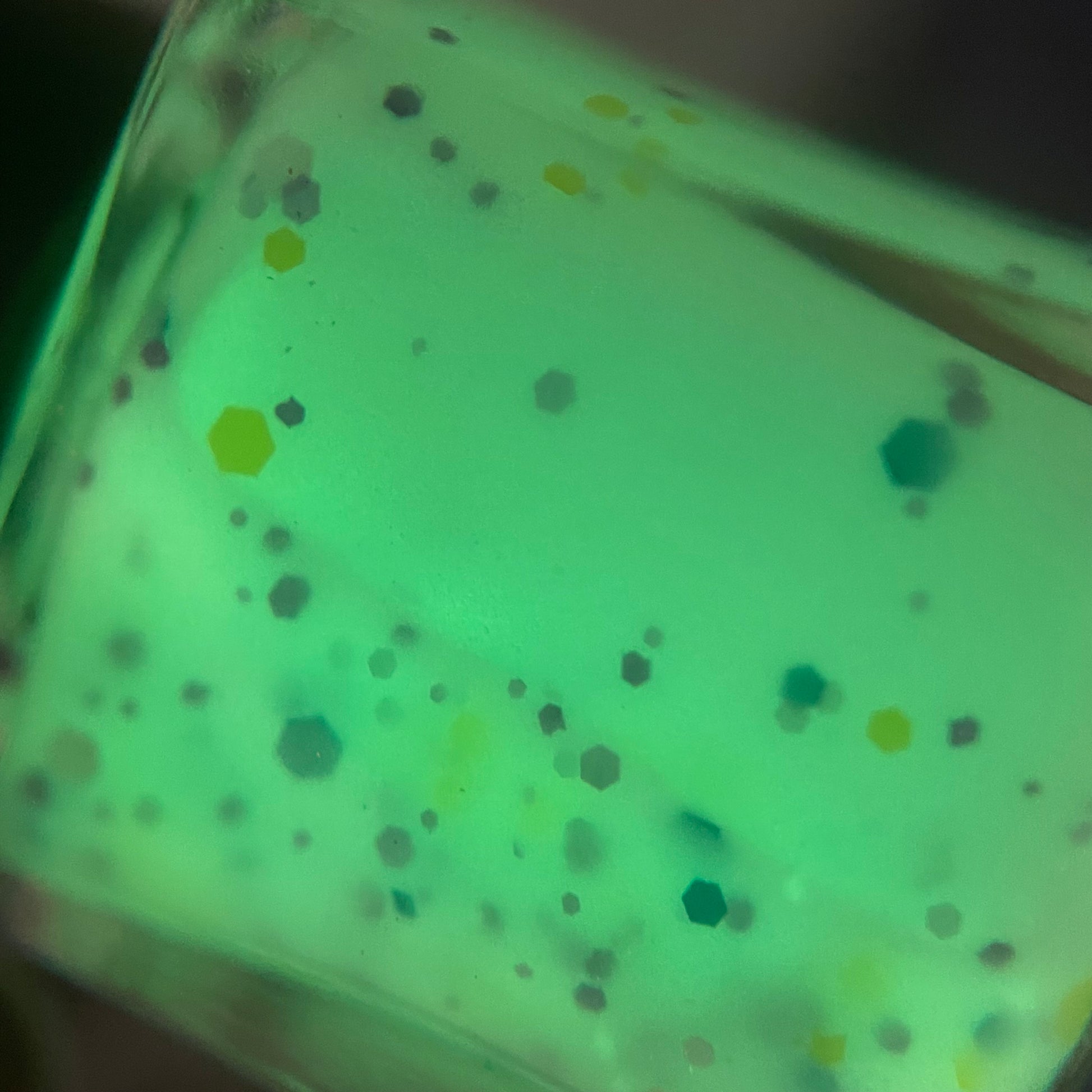 Rice Queen-OGUP/GITD dazzles with a gorgeous white-tingled base and a soft crellie texture, sprinkled with playful bursts of red and green unicorn pee OGUP colors. Watch it glow green in the dark, turning any moment into a magical experience. Fun, colorful, and just a little mischievous—because with Rice Queen, love definitely hurts!