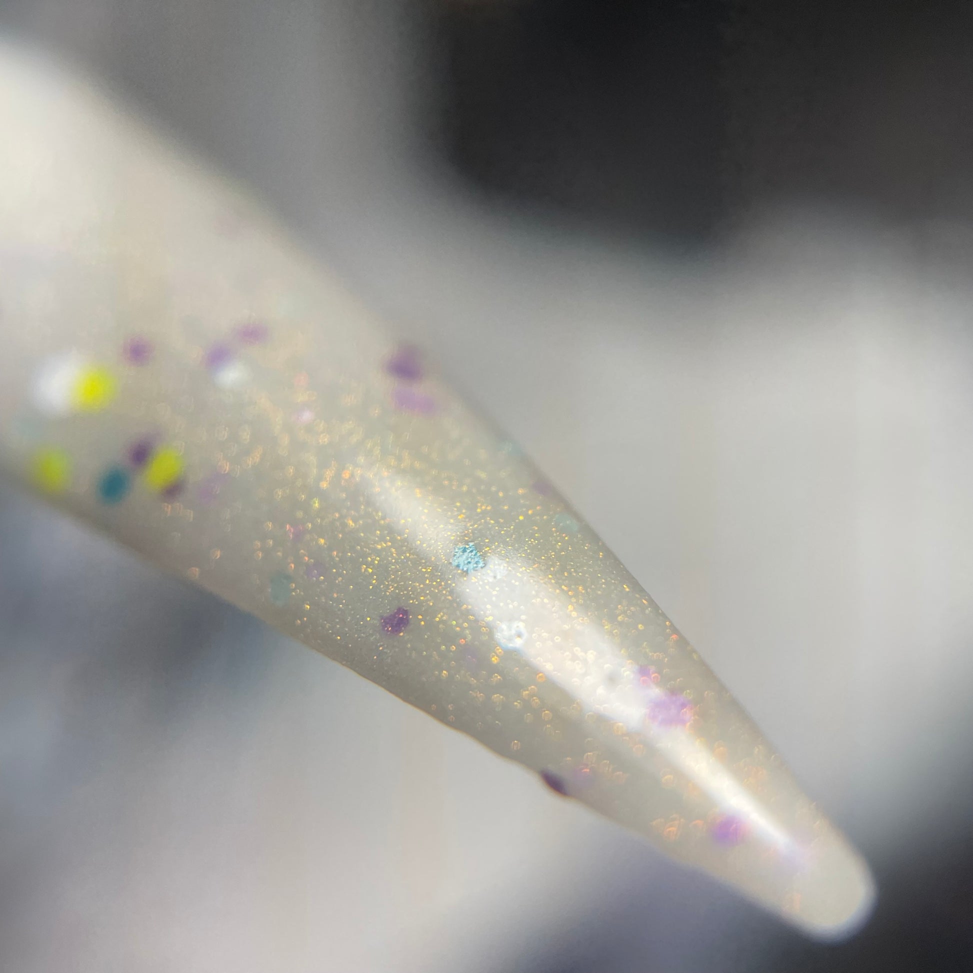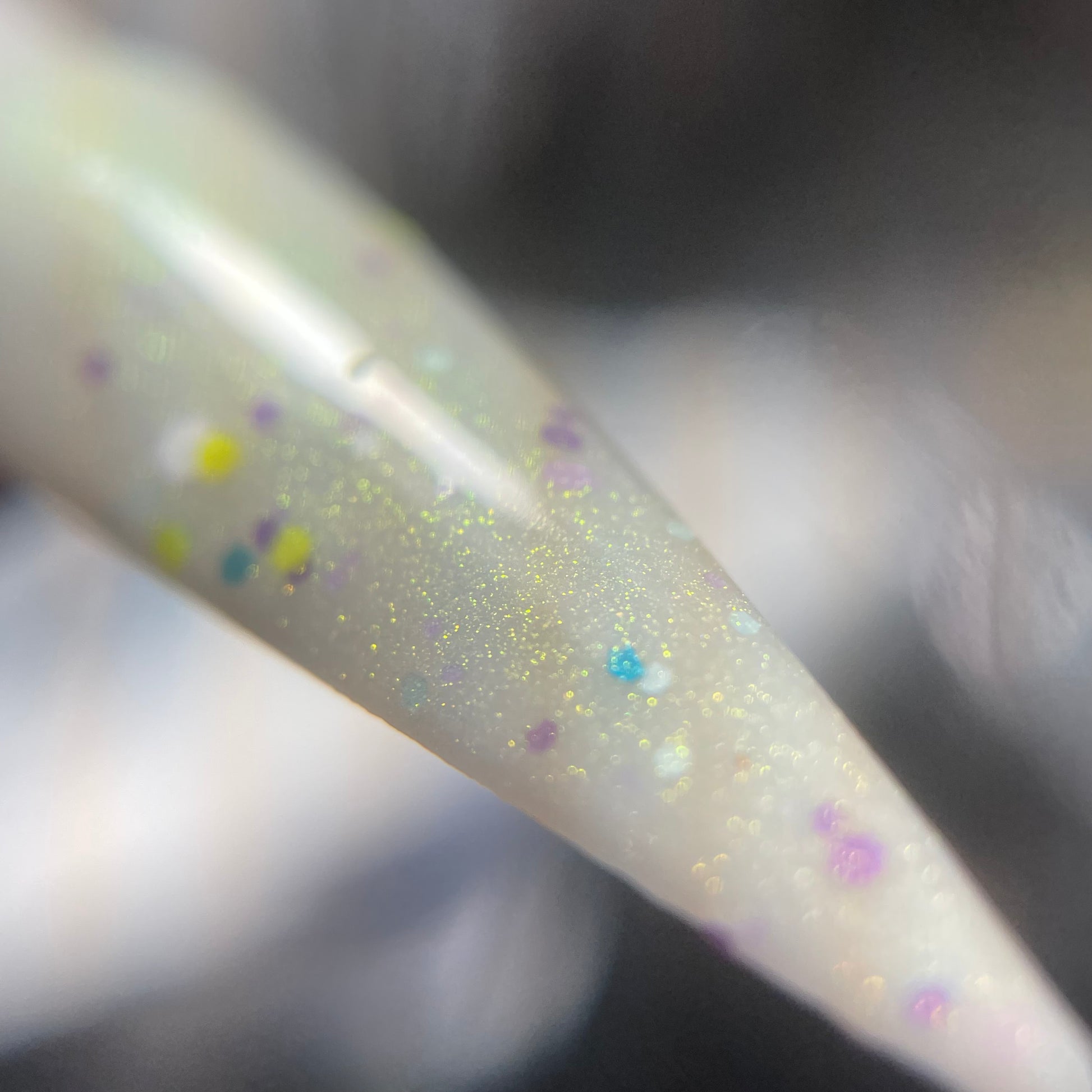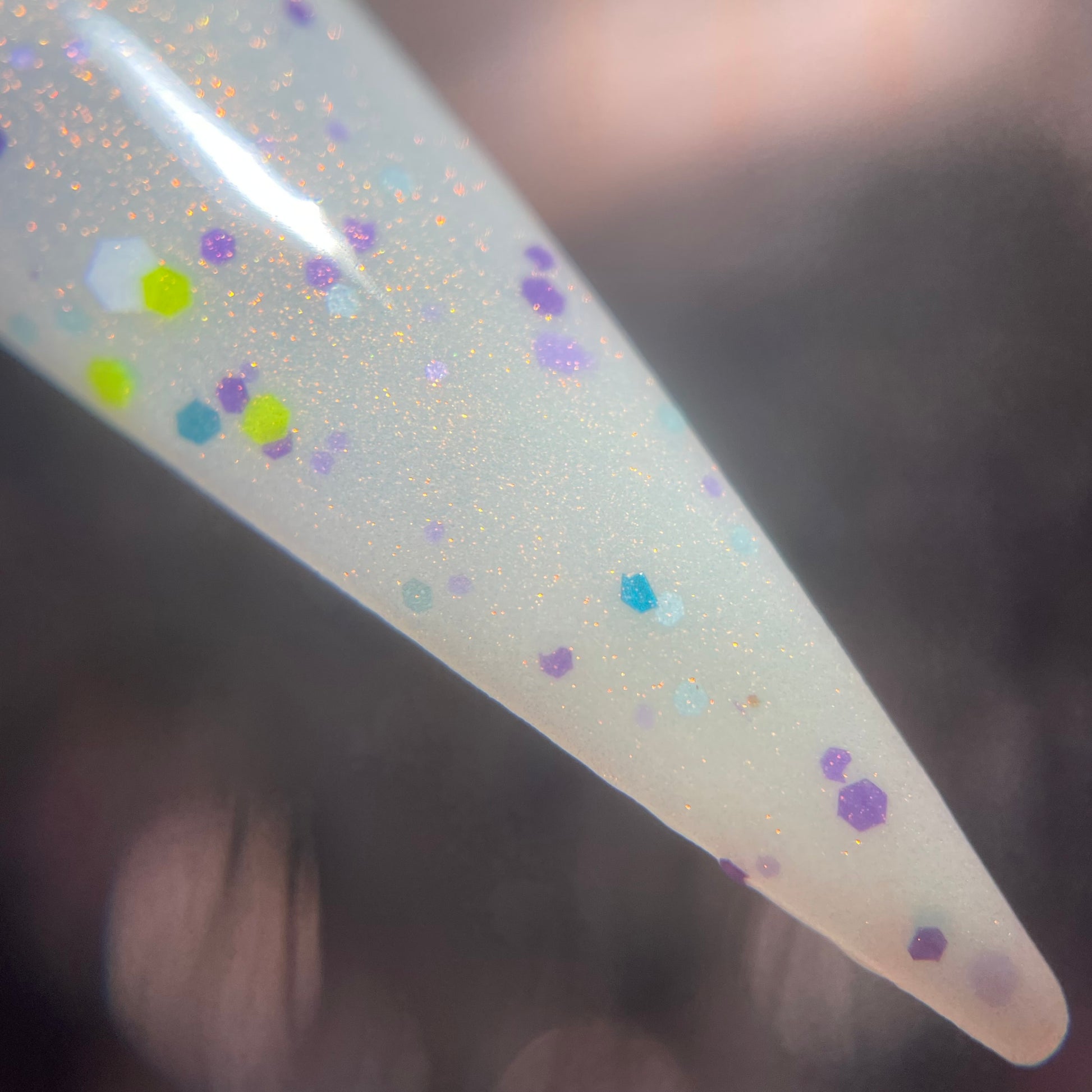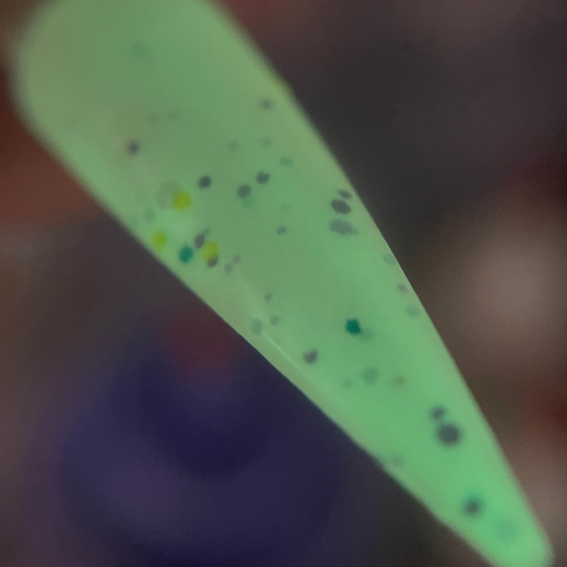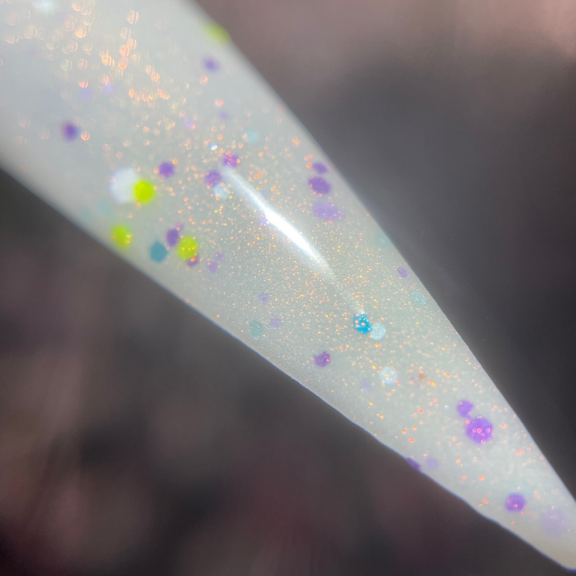 Rice Queen-OGUP/GITD dazzles with a gorgeous white-tingled base and a soft crellie texture, sprinkled with playful bursts of red and green unicorn pee OGUP colors. Watch it glow green in the dark, turning any moment into a magical experience. Fun, colorful, and just a little mischievous—because with Rice Queen, love definitely hurts!