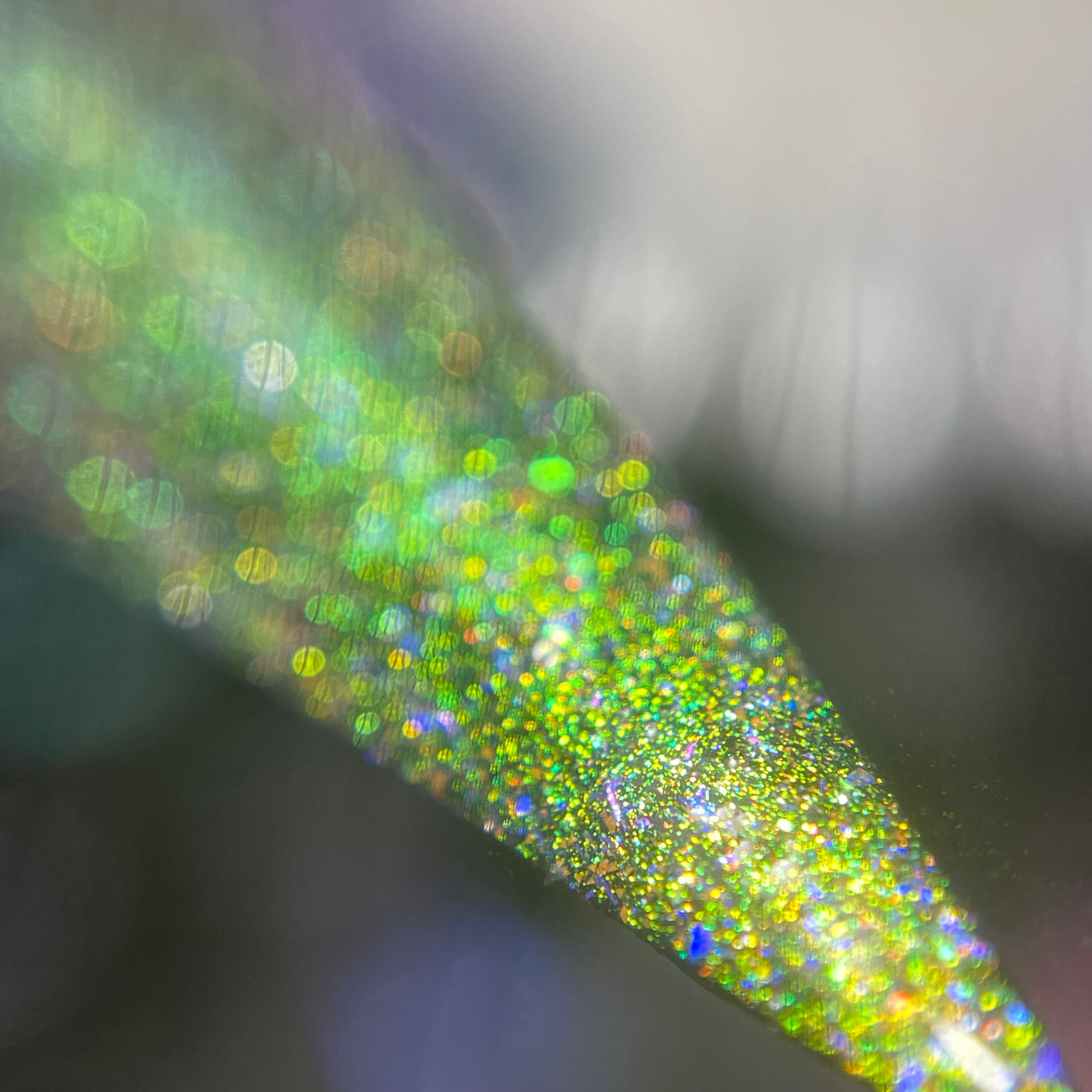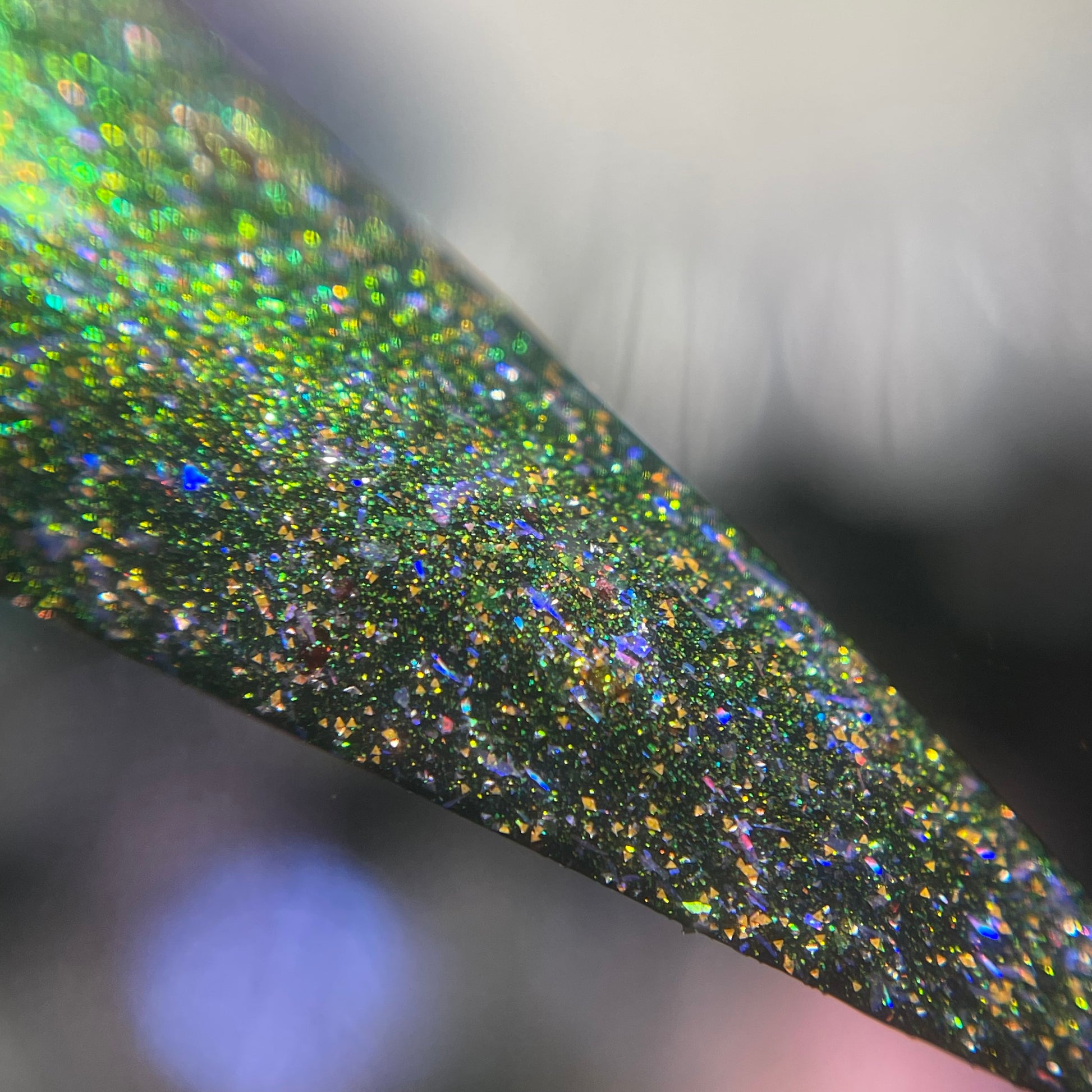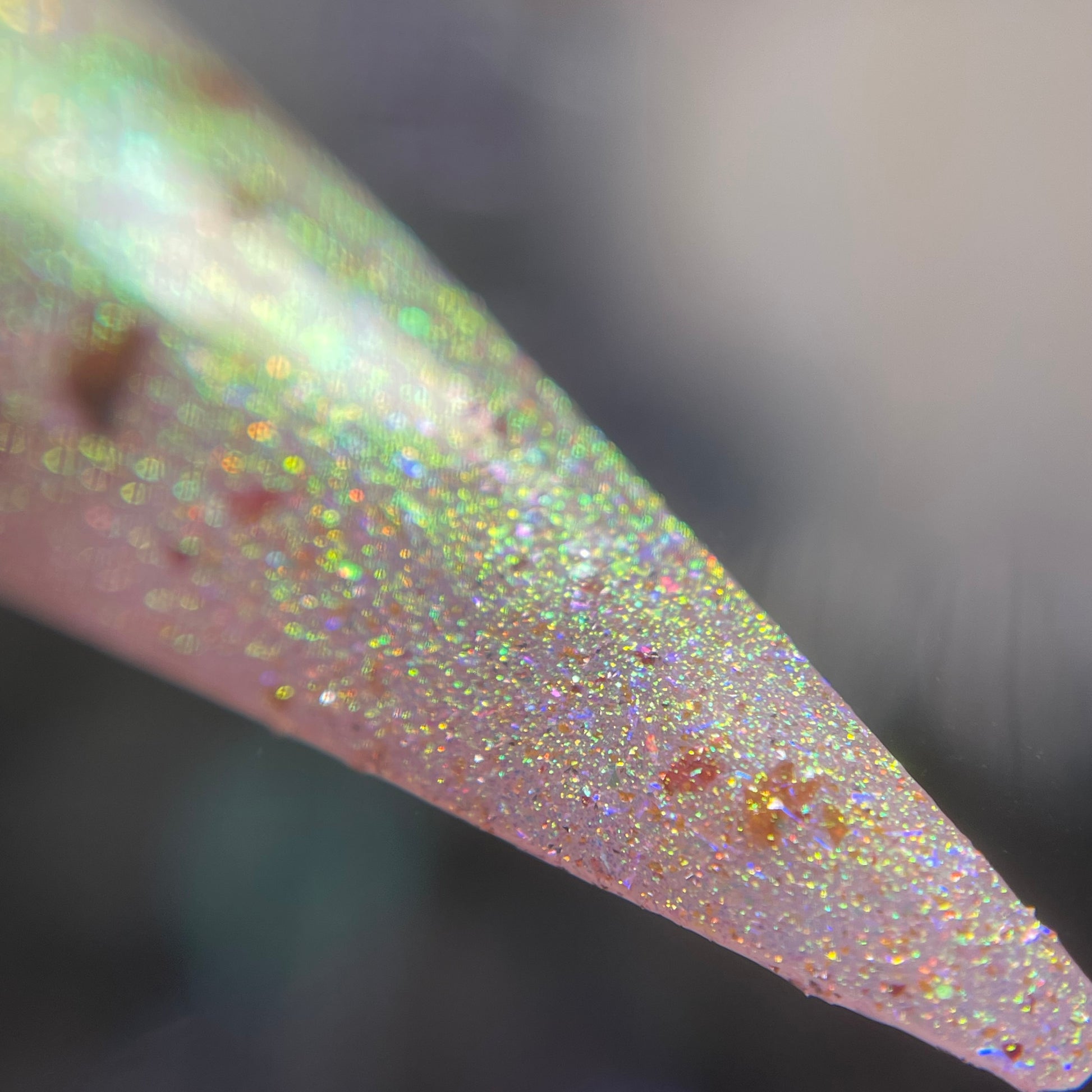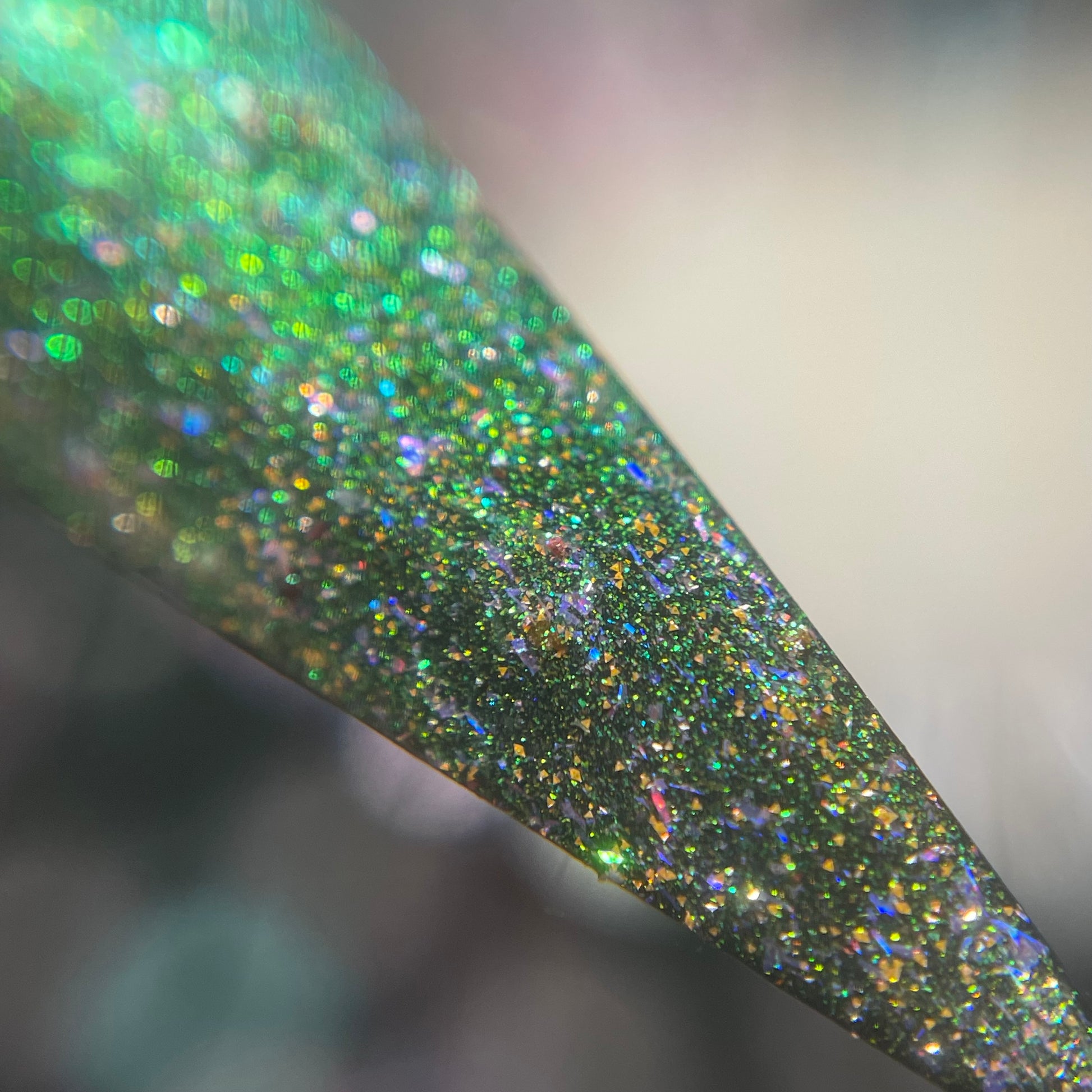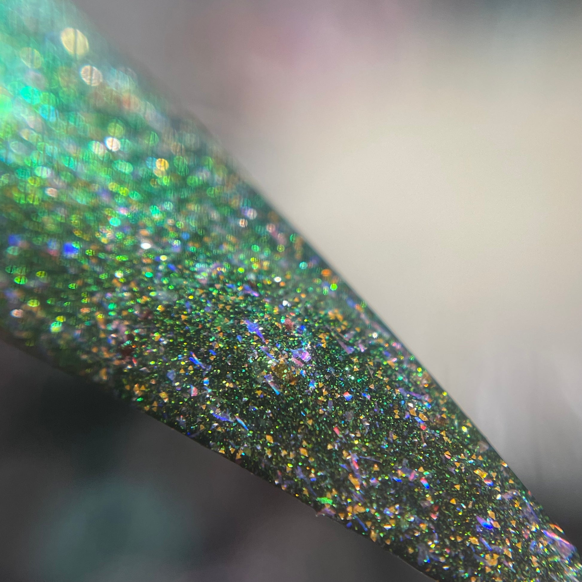 Crushed Roses in a bed or green pee with reflective glitter and some micro flake slithers.