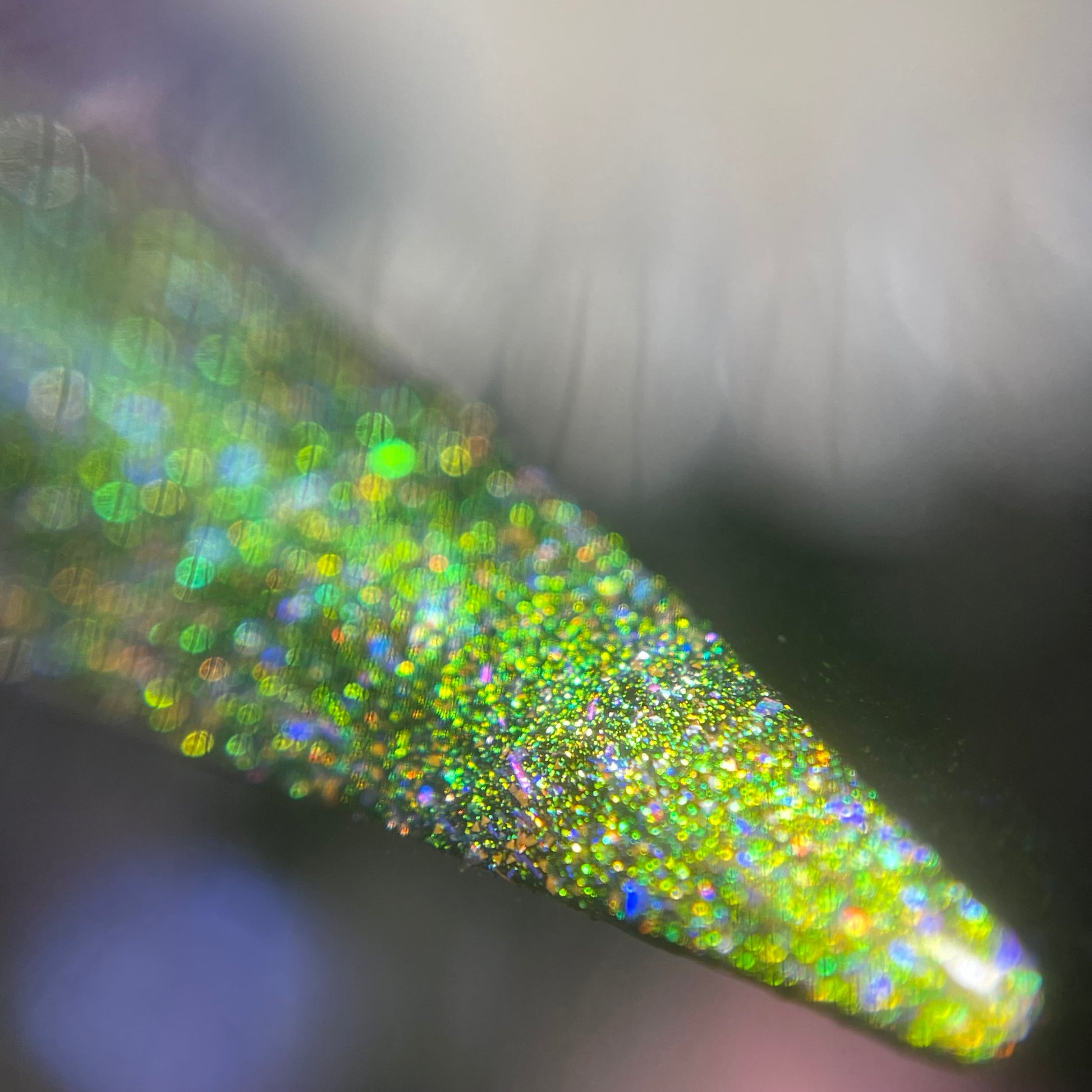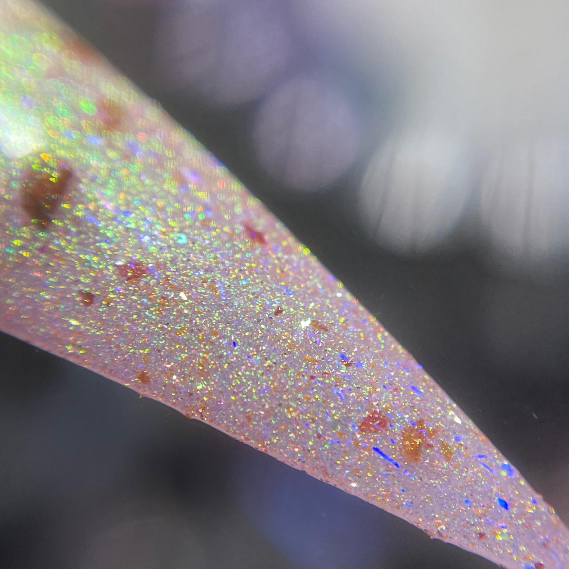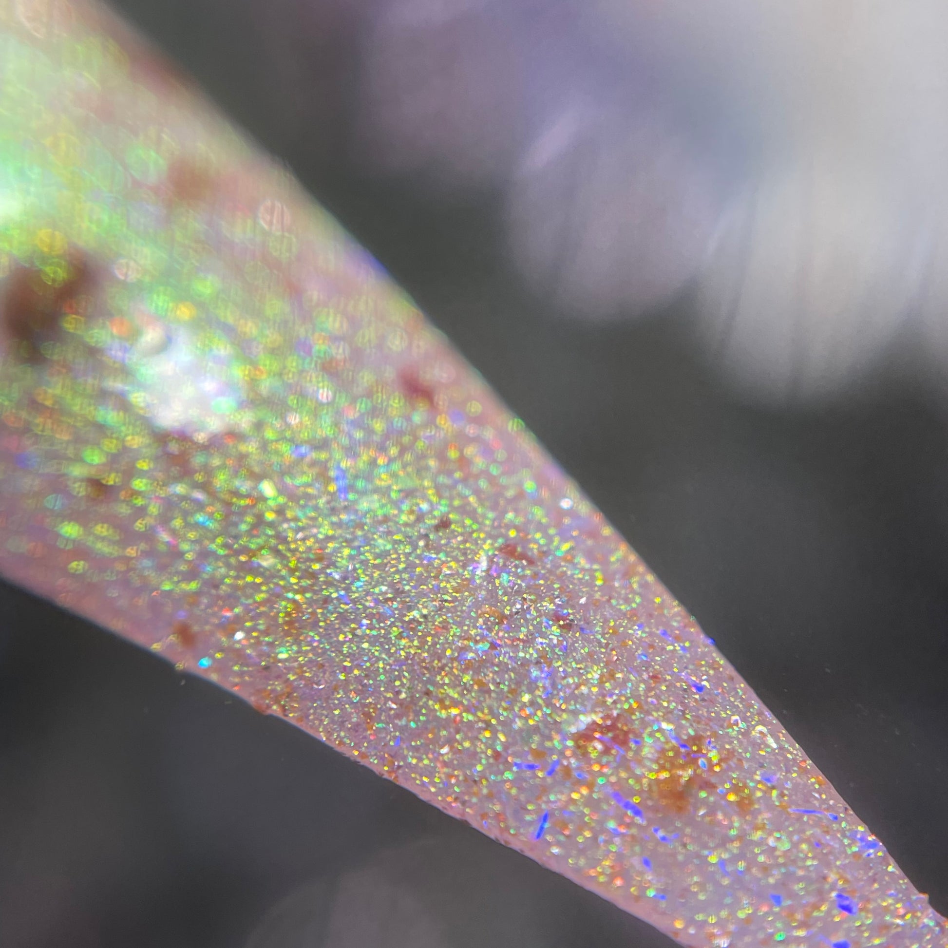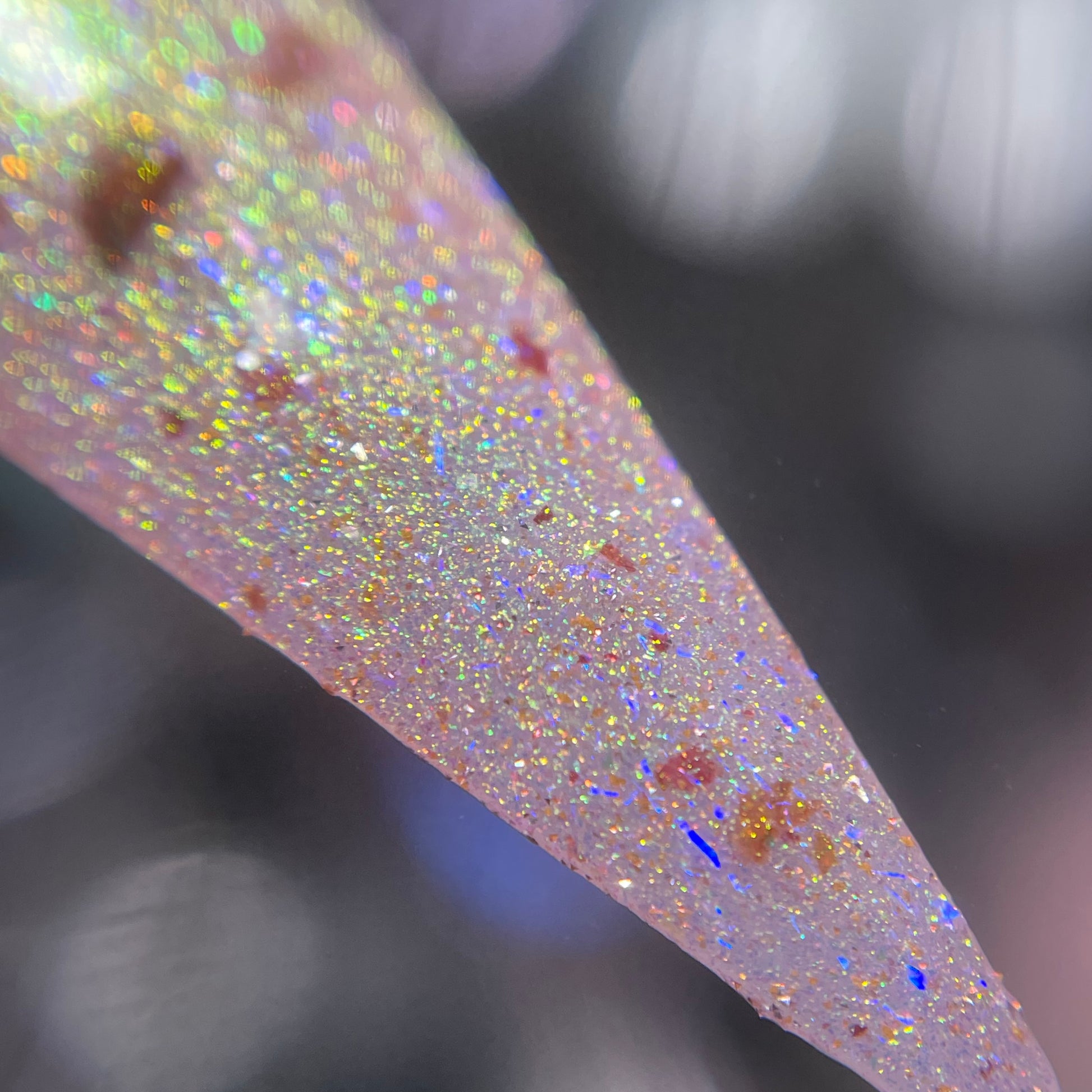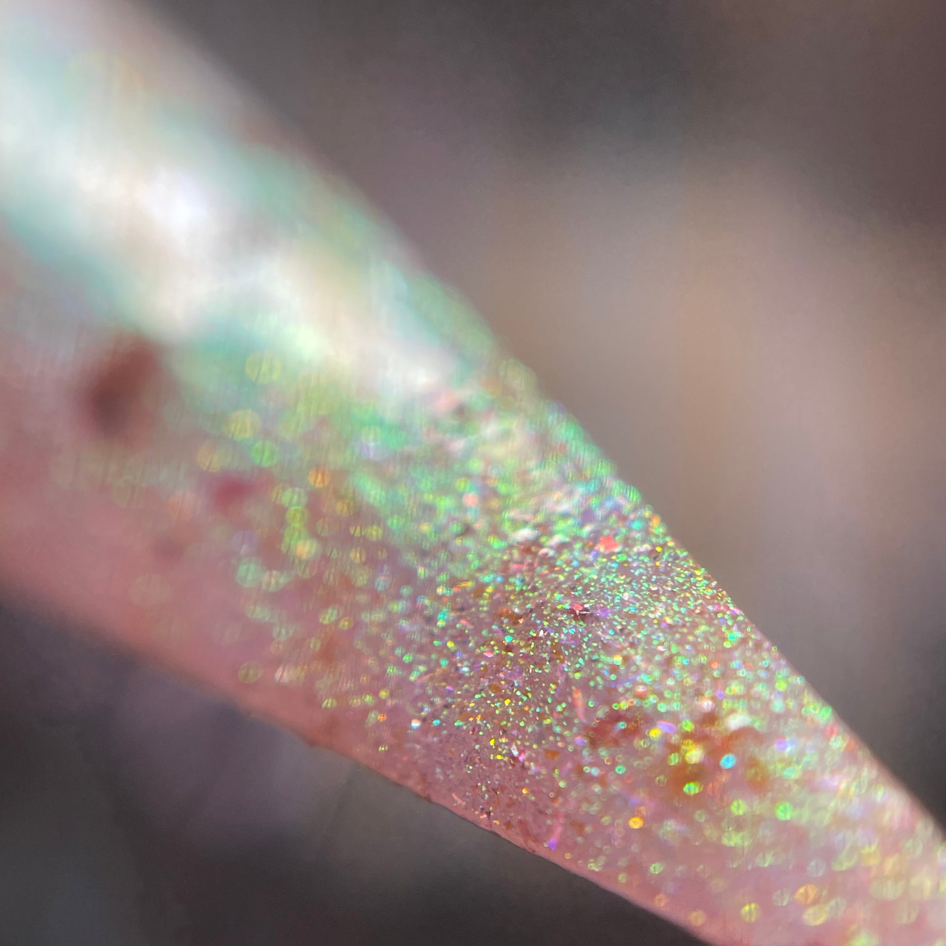Crushed Roses in a bed or green pee with reflective glitter and some micro flake slithers.