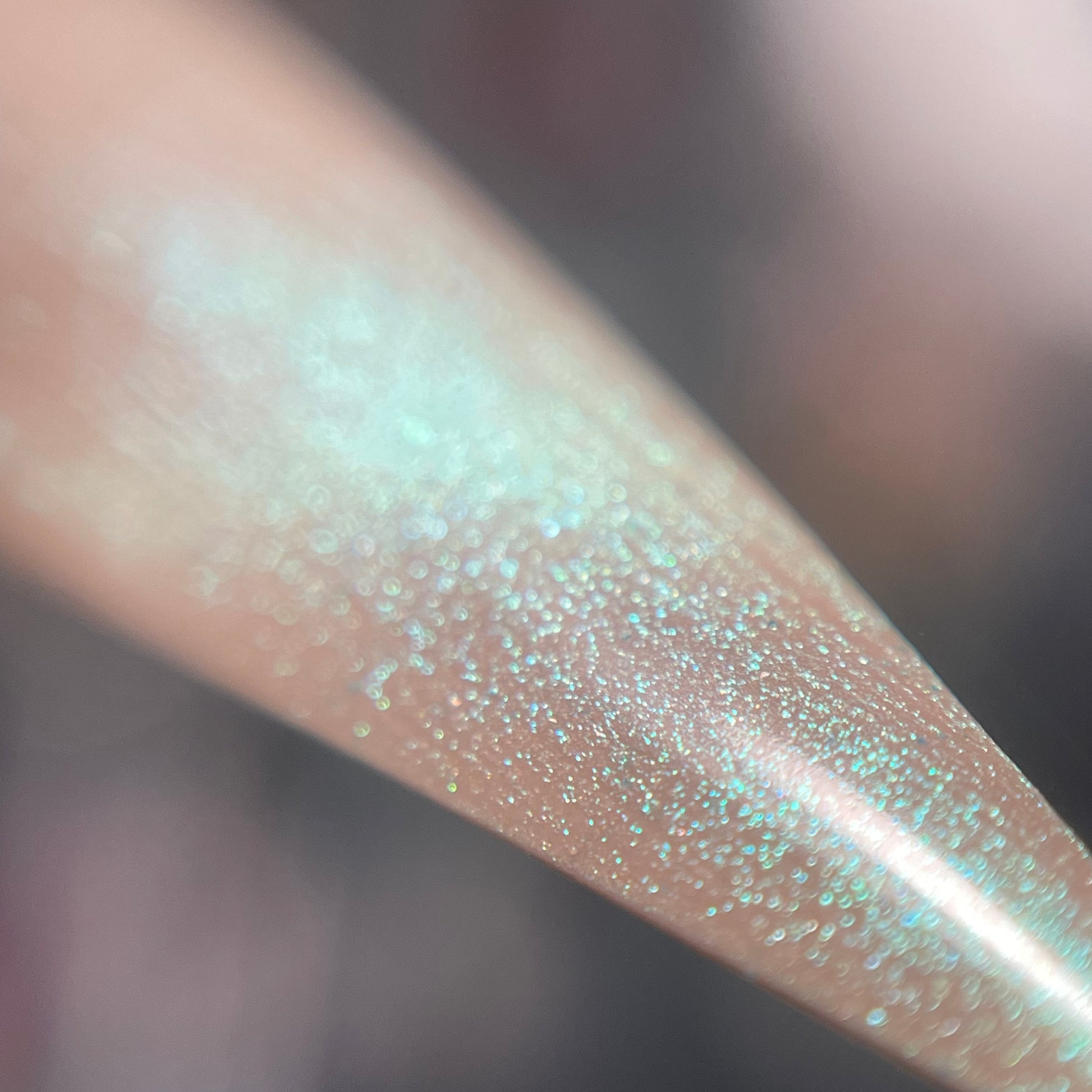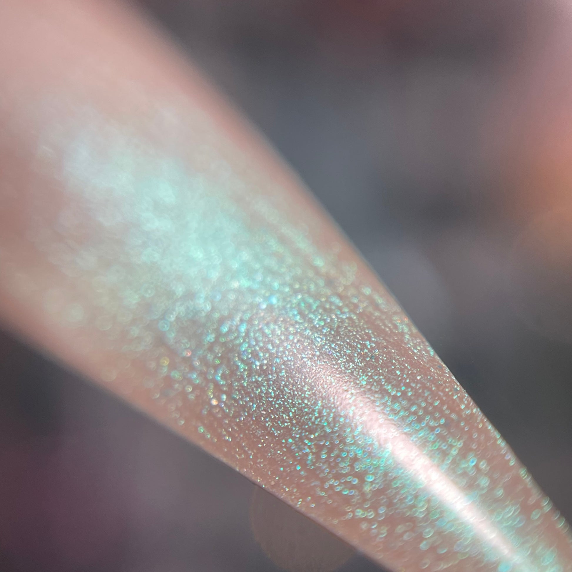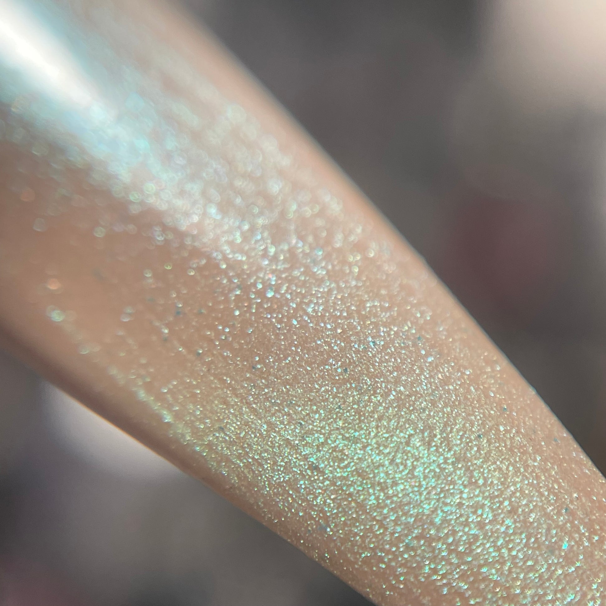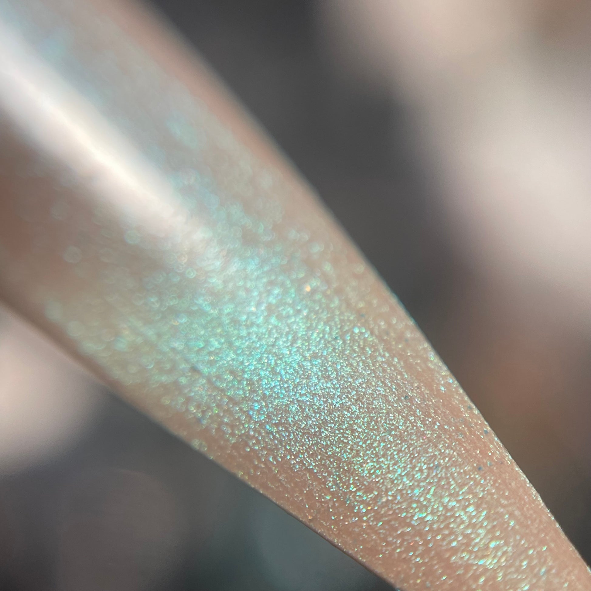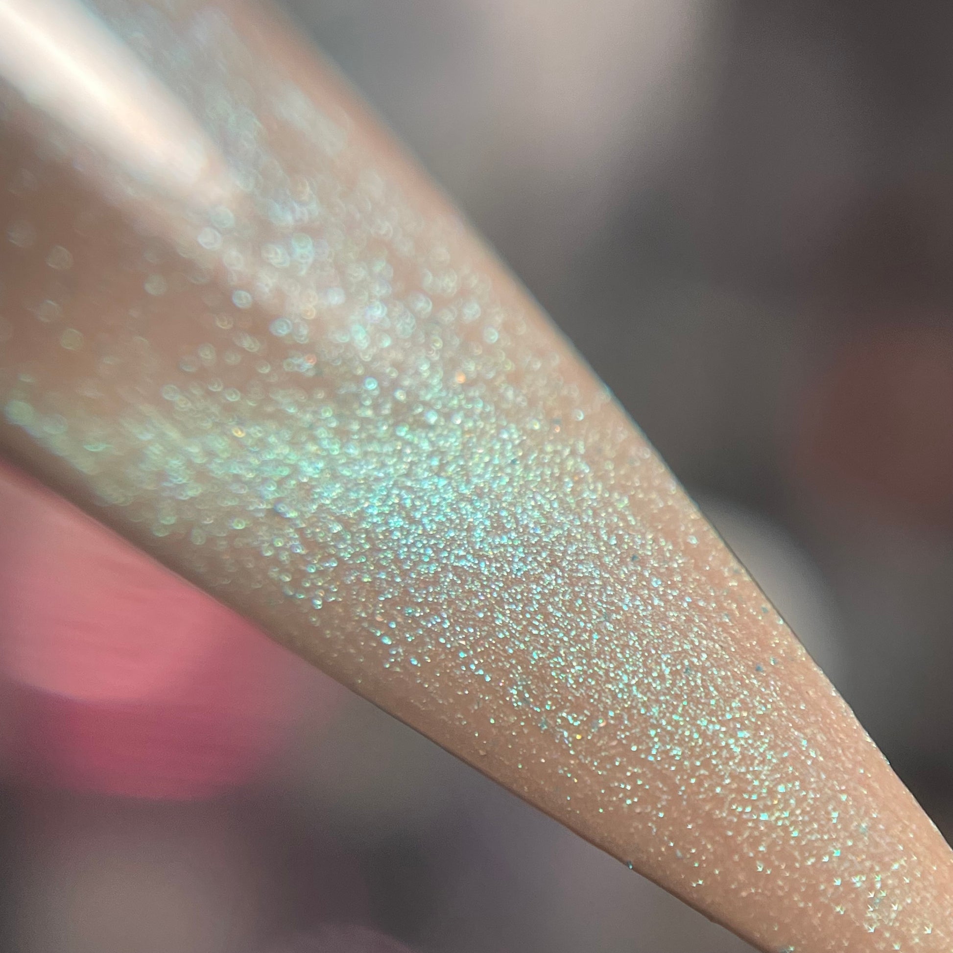 a taupe colored delic magnetic with a touch of reflective glitter and delicate green mint shifter line.