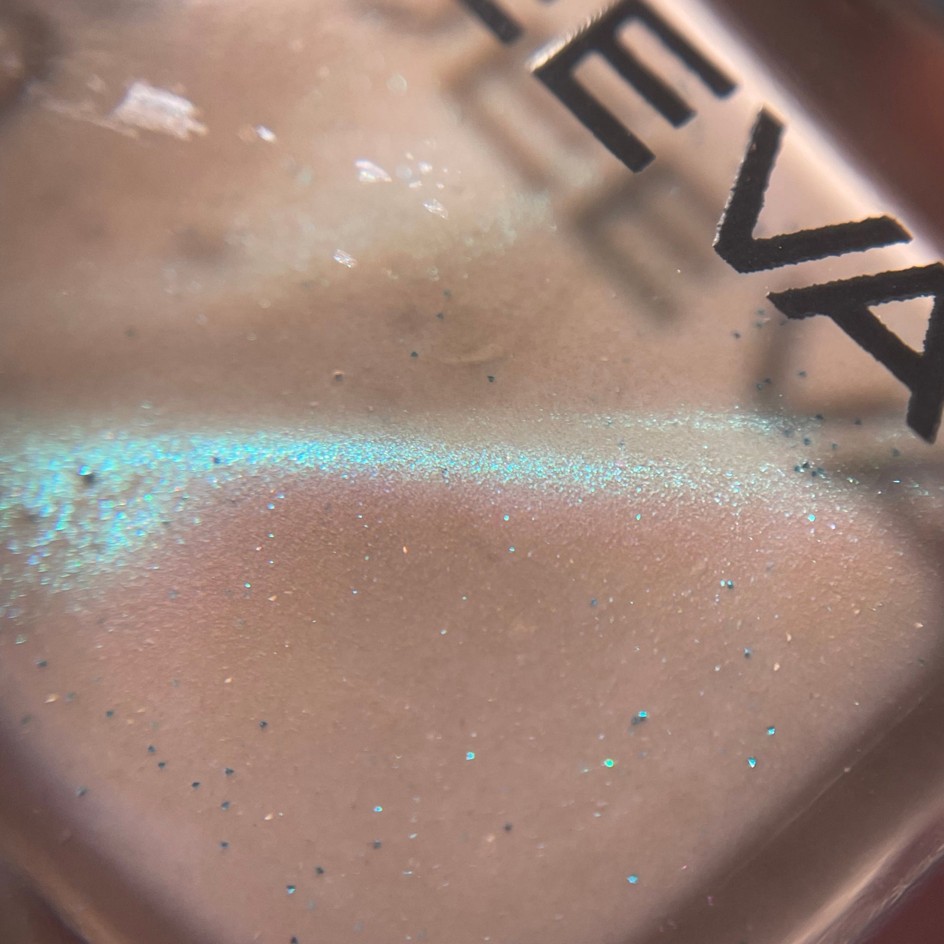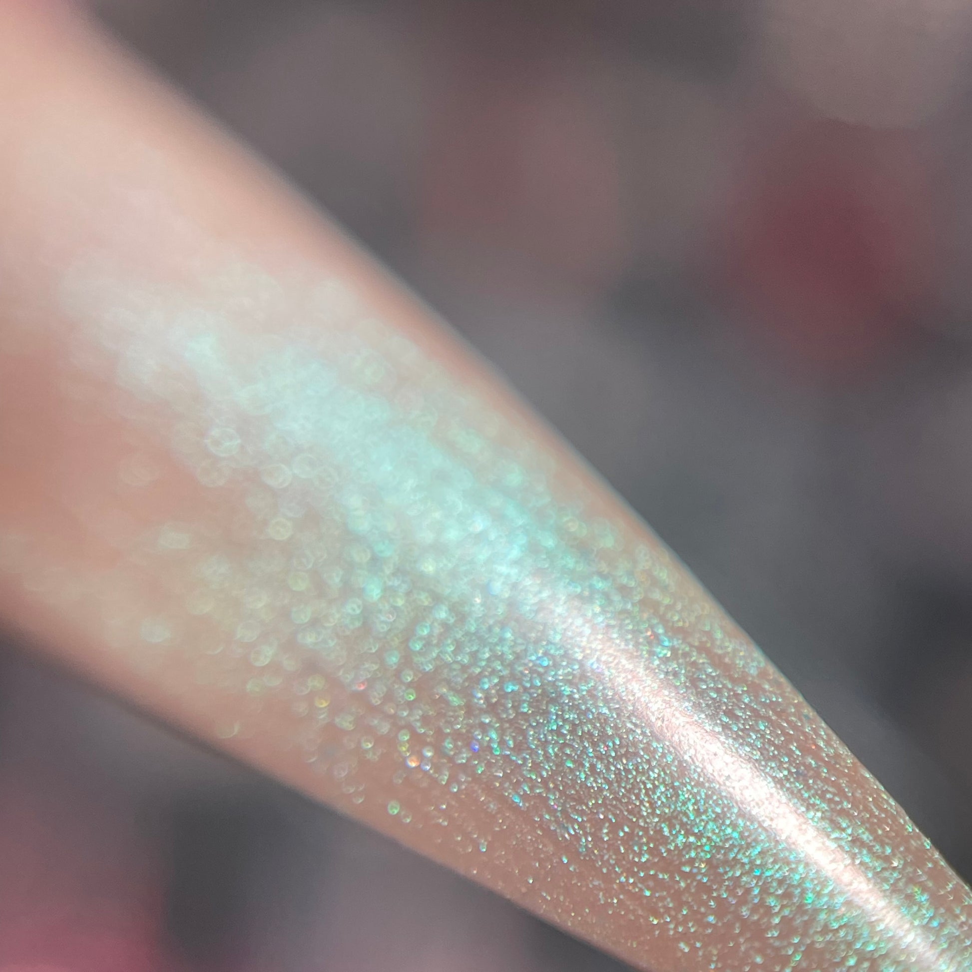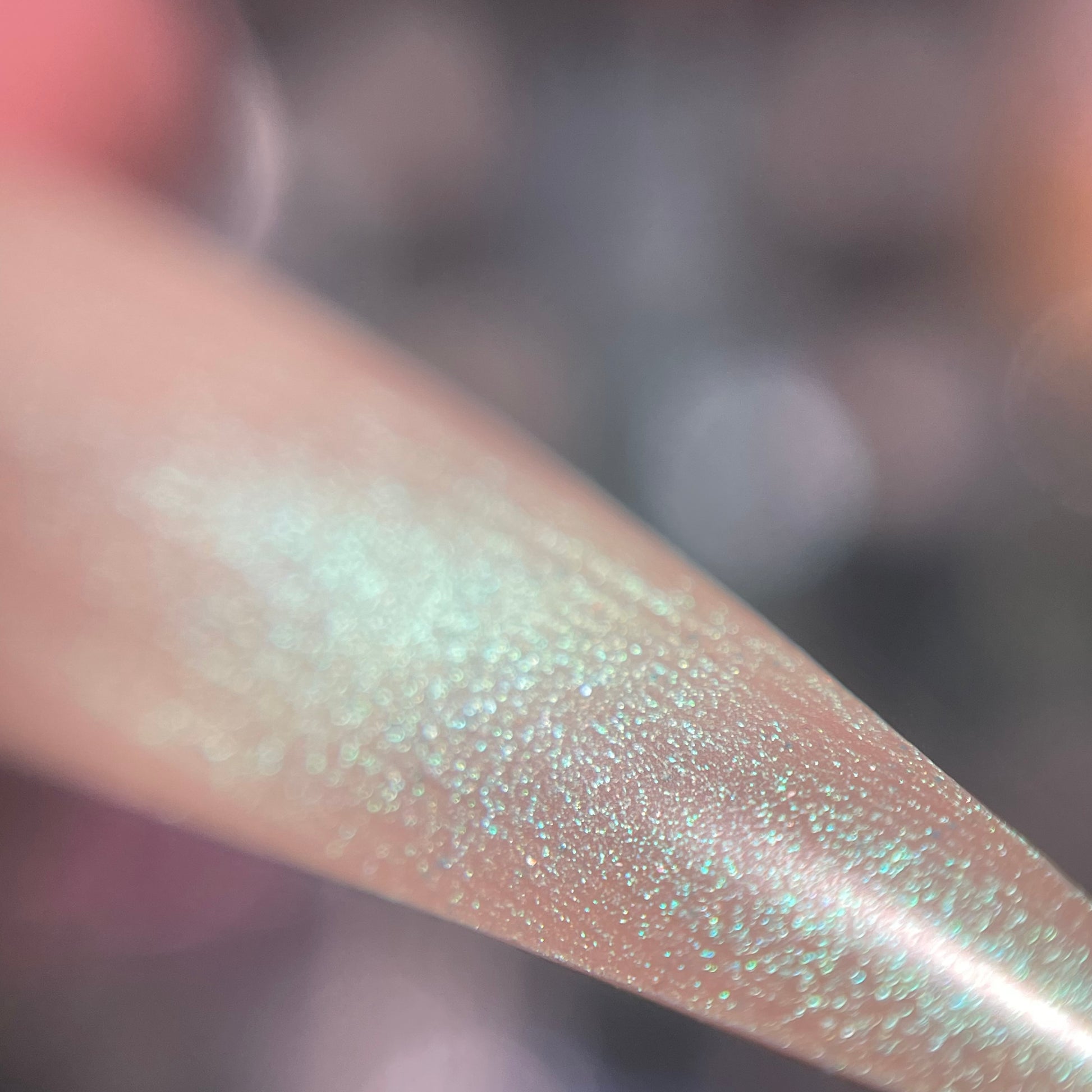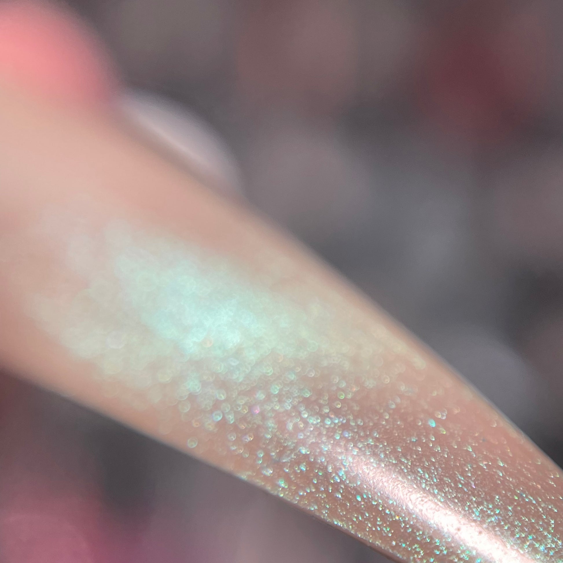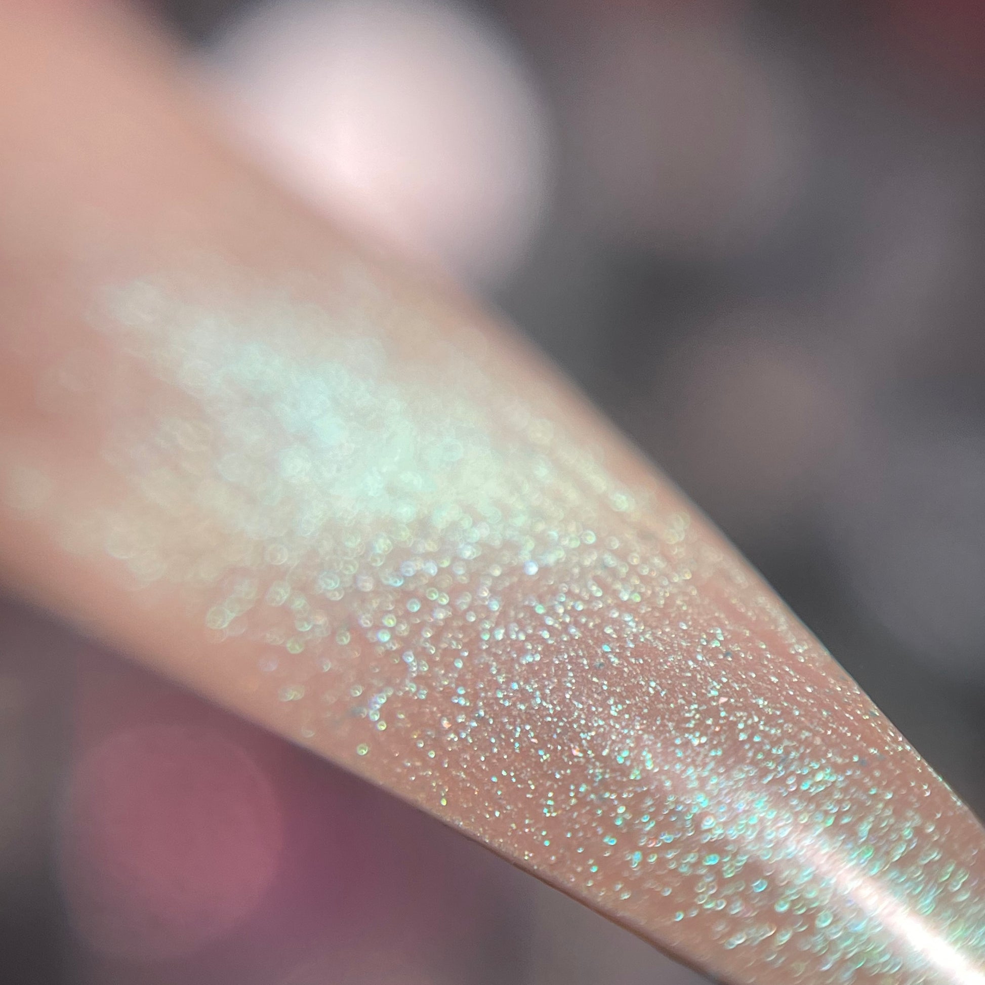 a taupe colored delic magnetic with a touch of reflective glitter and delicate green mint shifter line.